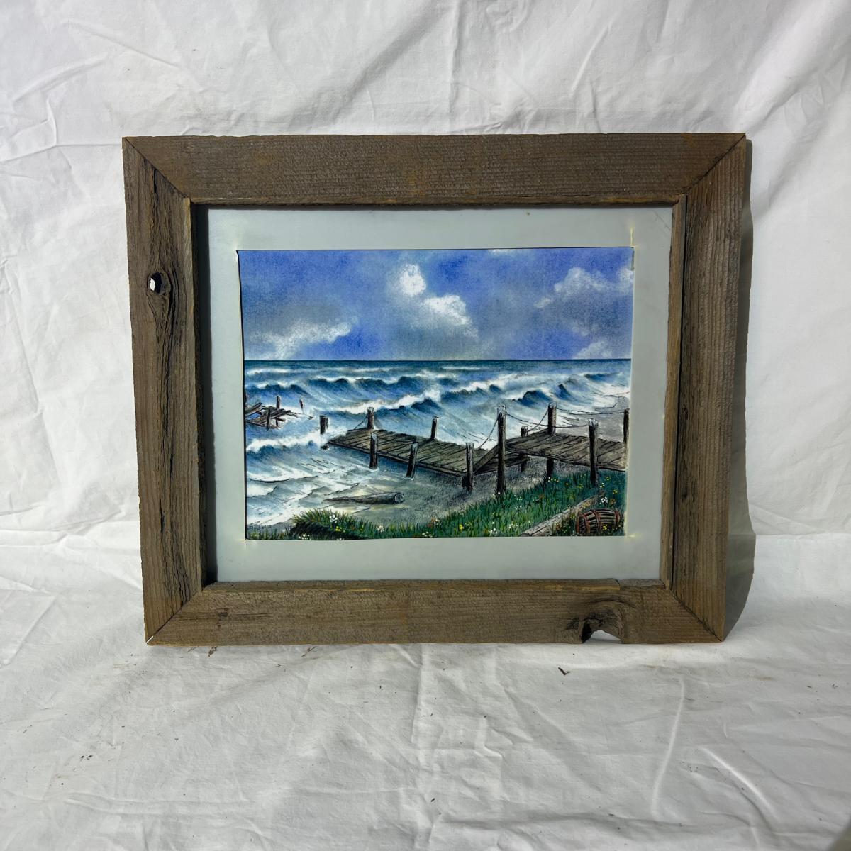 Vintage Natural Wood Frame for Laminated Drawing of Beach Dock, Dimensions are 16" x 13 1/2"