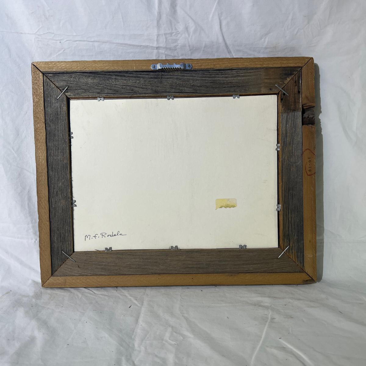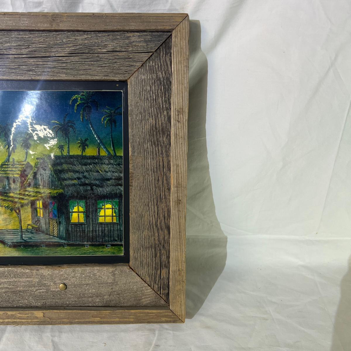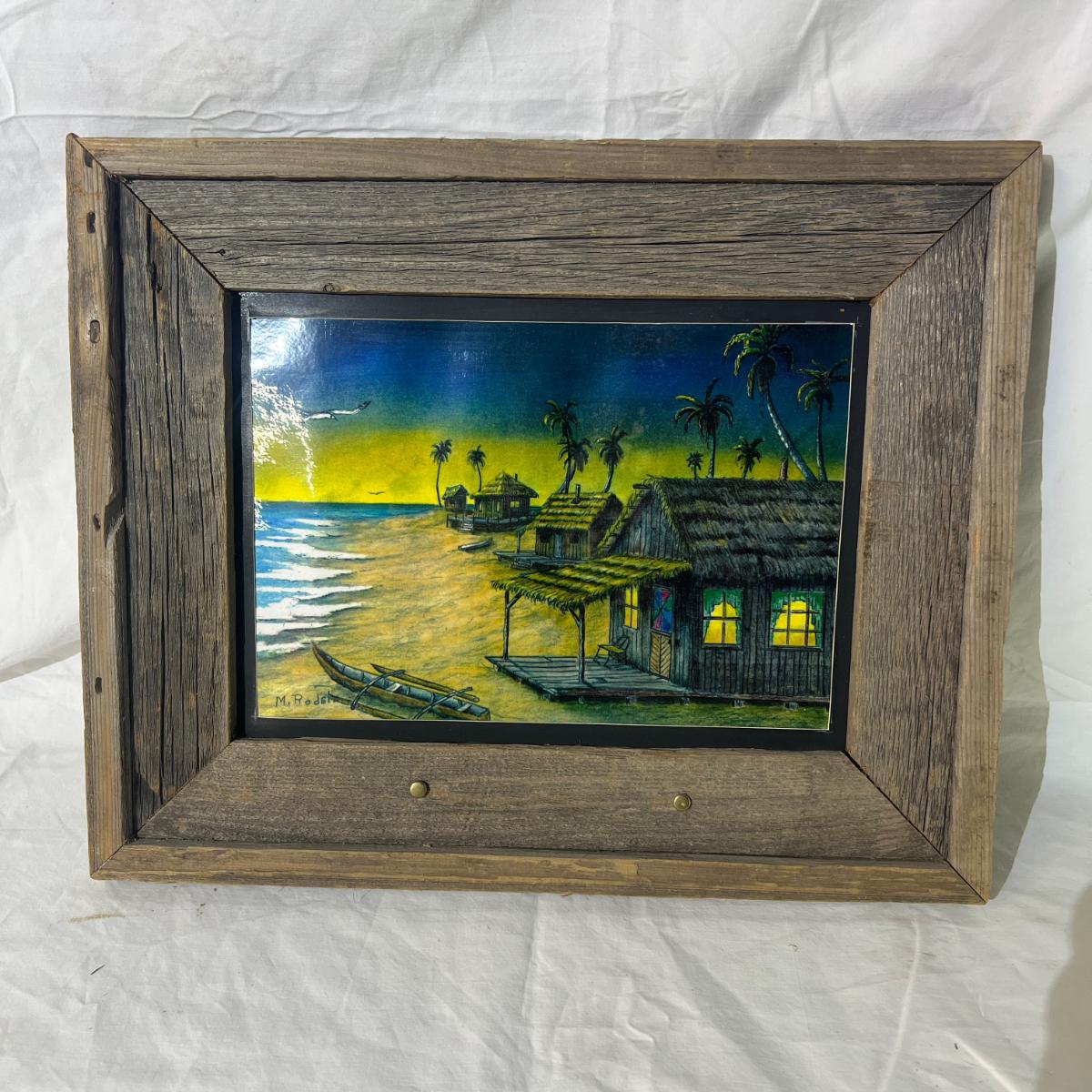 Vintage Natural Wood Frame for Laminated Drawing of Beach House By M. Rodela Dimensions are 16 1/2 x 13 1/4"