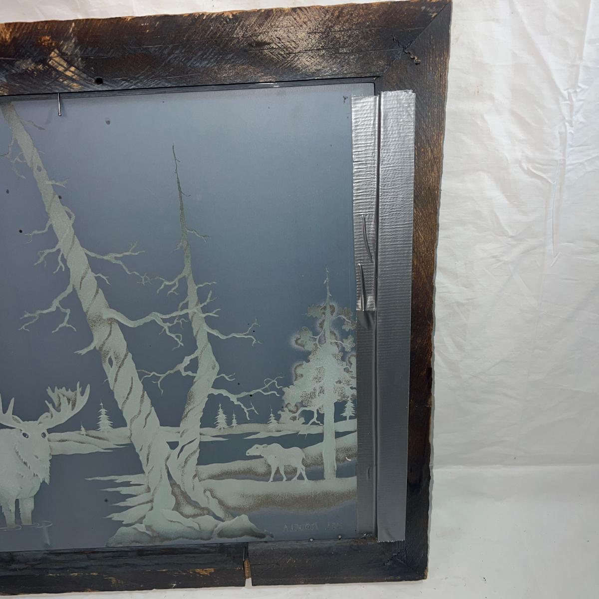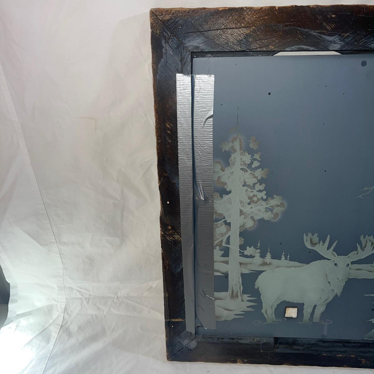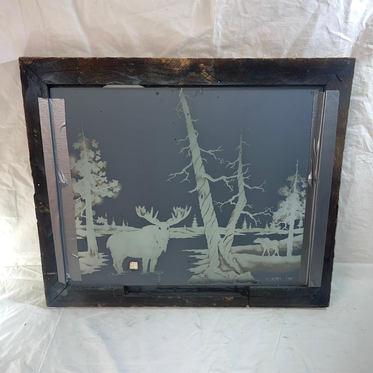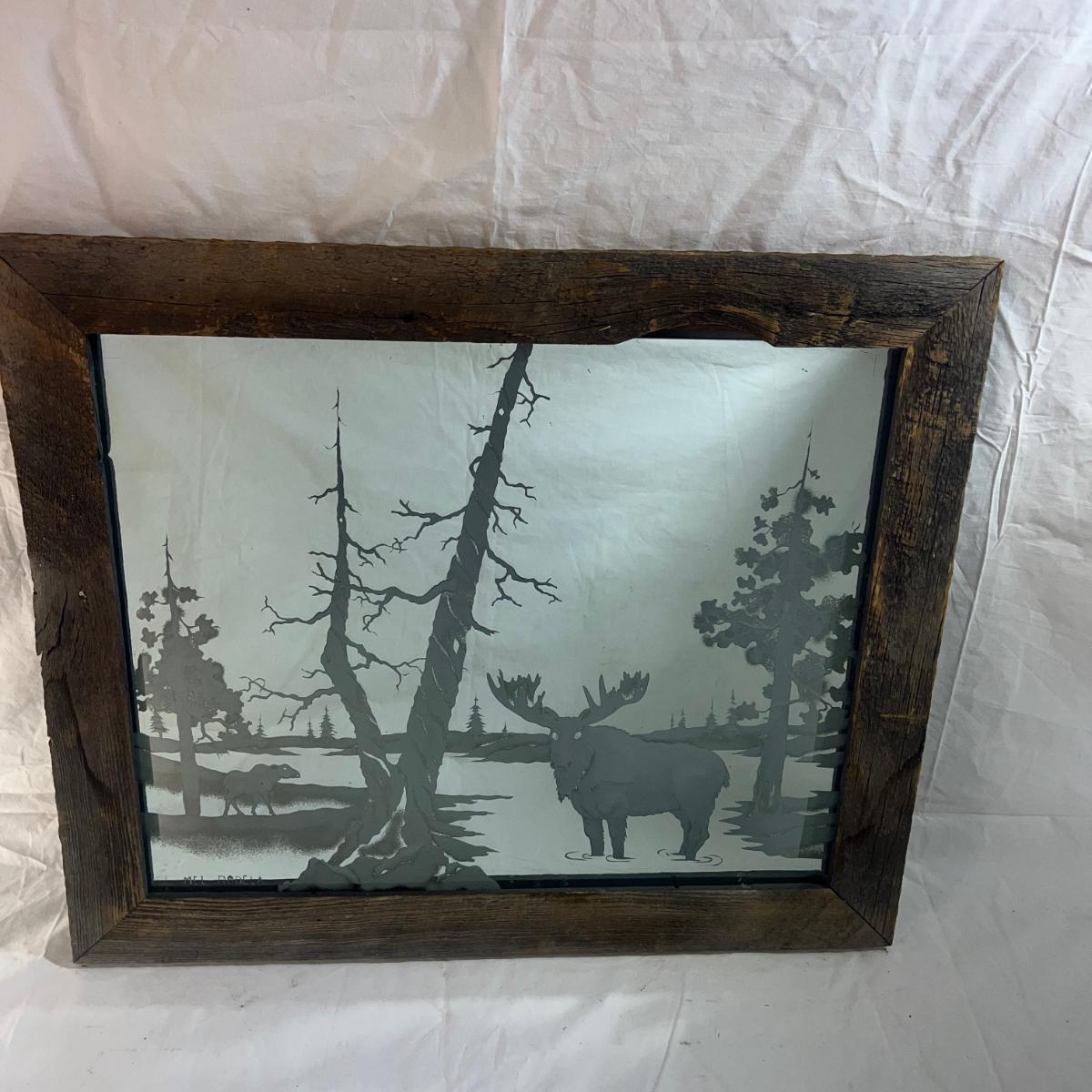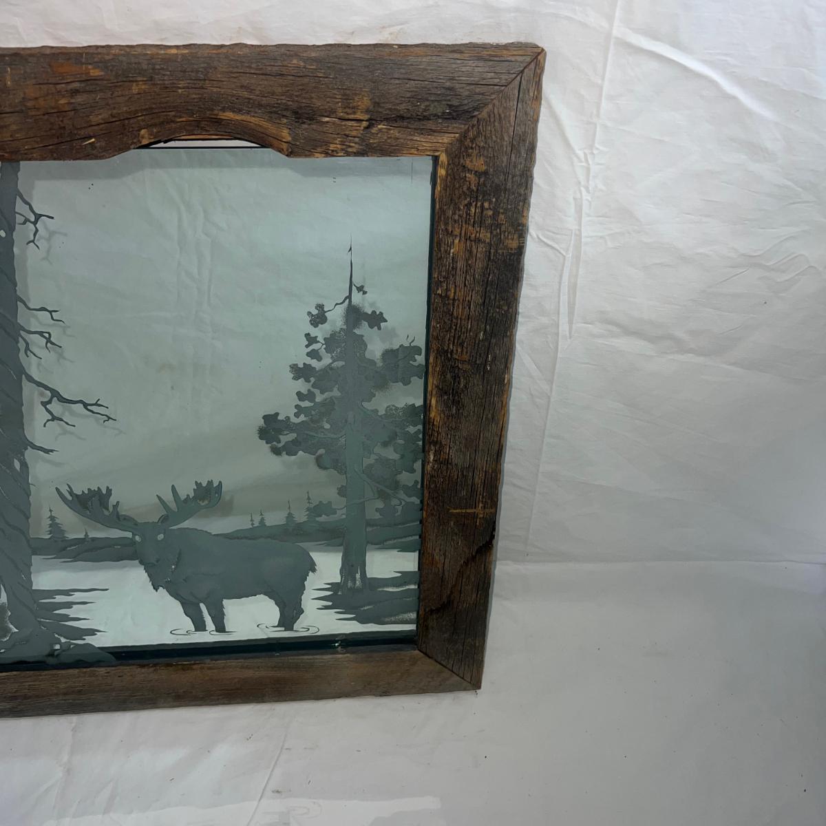 Vintage Natural Wood Frame with Sandblasted art onto mirror of Forest with Moose. Artist signed Mel Rodela. Dimensions are 23 3/4" x 20"