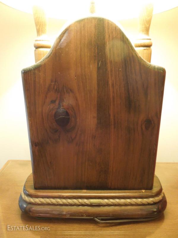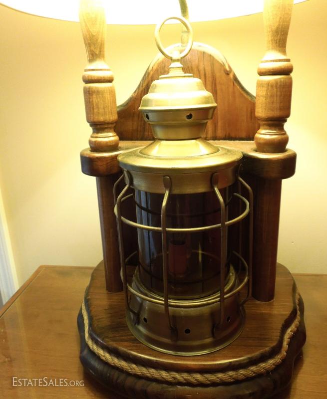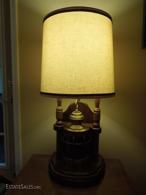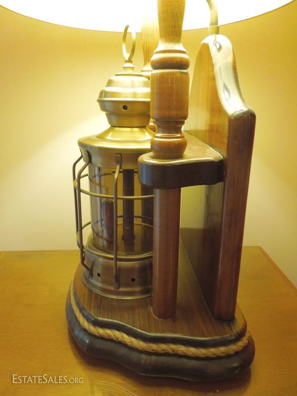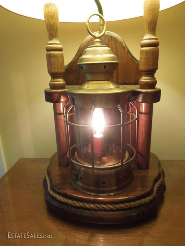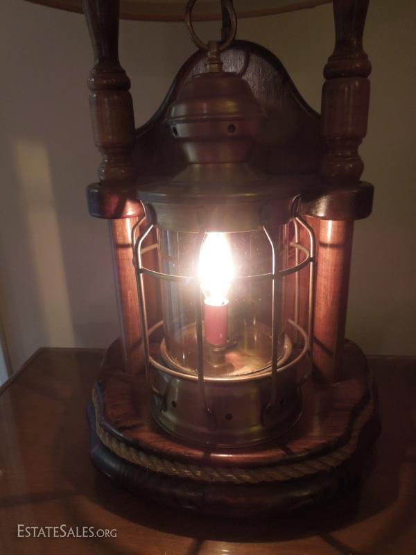 Lantern is a replica and made of brushed metal that is brass color. The upper and lower light inside the lantern operate independently on the same switch. Can give a very subtle candle effect when lit or light a corner of the room when fully operational. Base is wood with a rope trim. In good vintage condition.