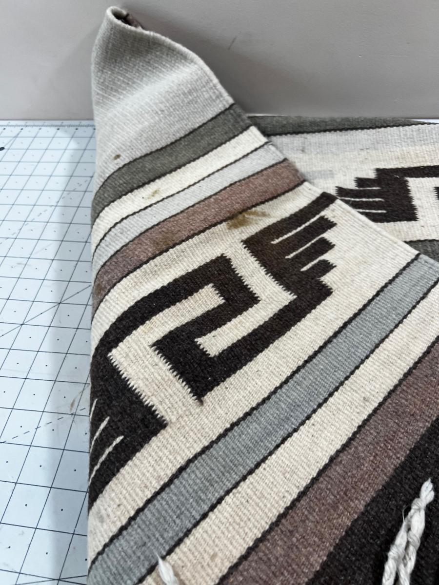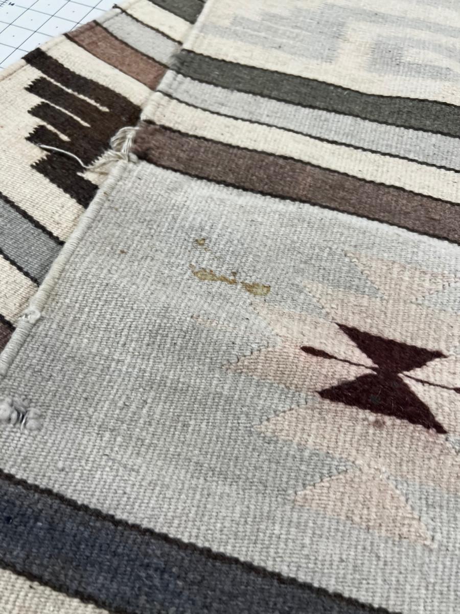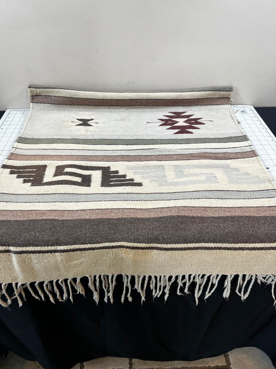 Wool Older, Shows wear and staining, but its still awesome, just loved already! Measures 28" X 60" Authentic real deal rug!