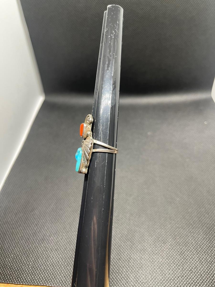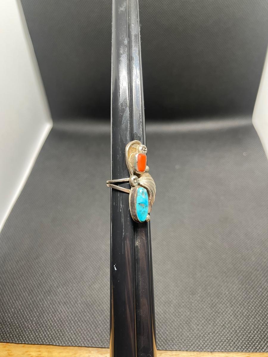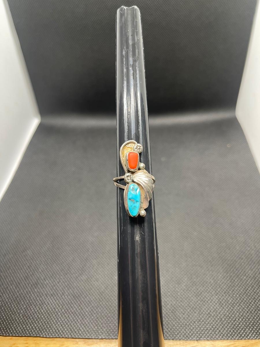 Vintage Navajo  Sterling Silver Turquoise Coral Ring Leaf Size 6.5