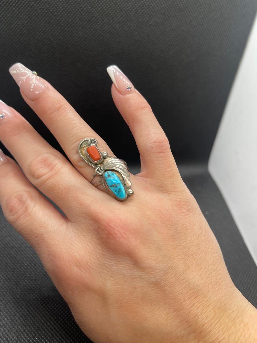 Vintage Navajo Sterling Silver Turquoise Coral Ring Leaf Size 6.5