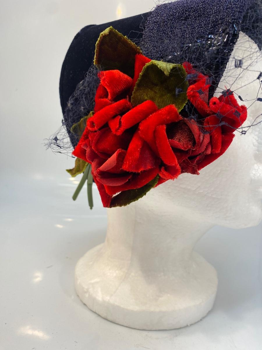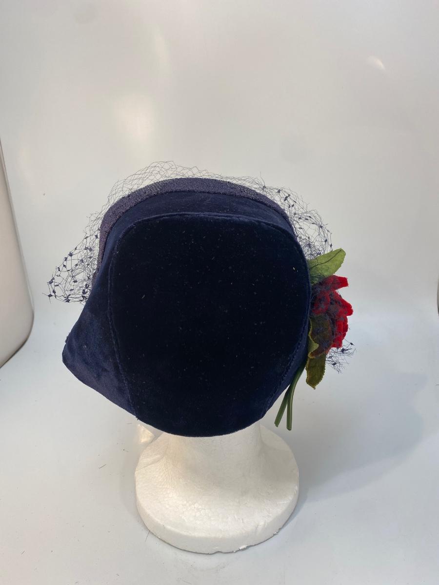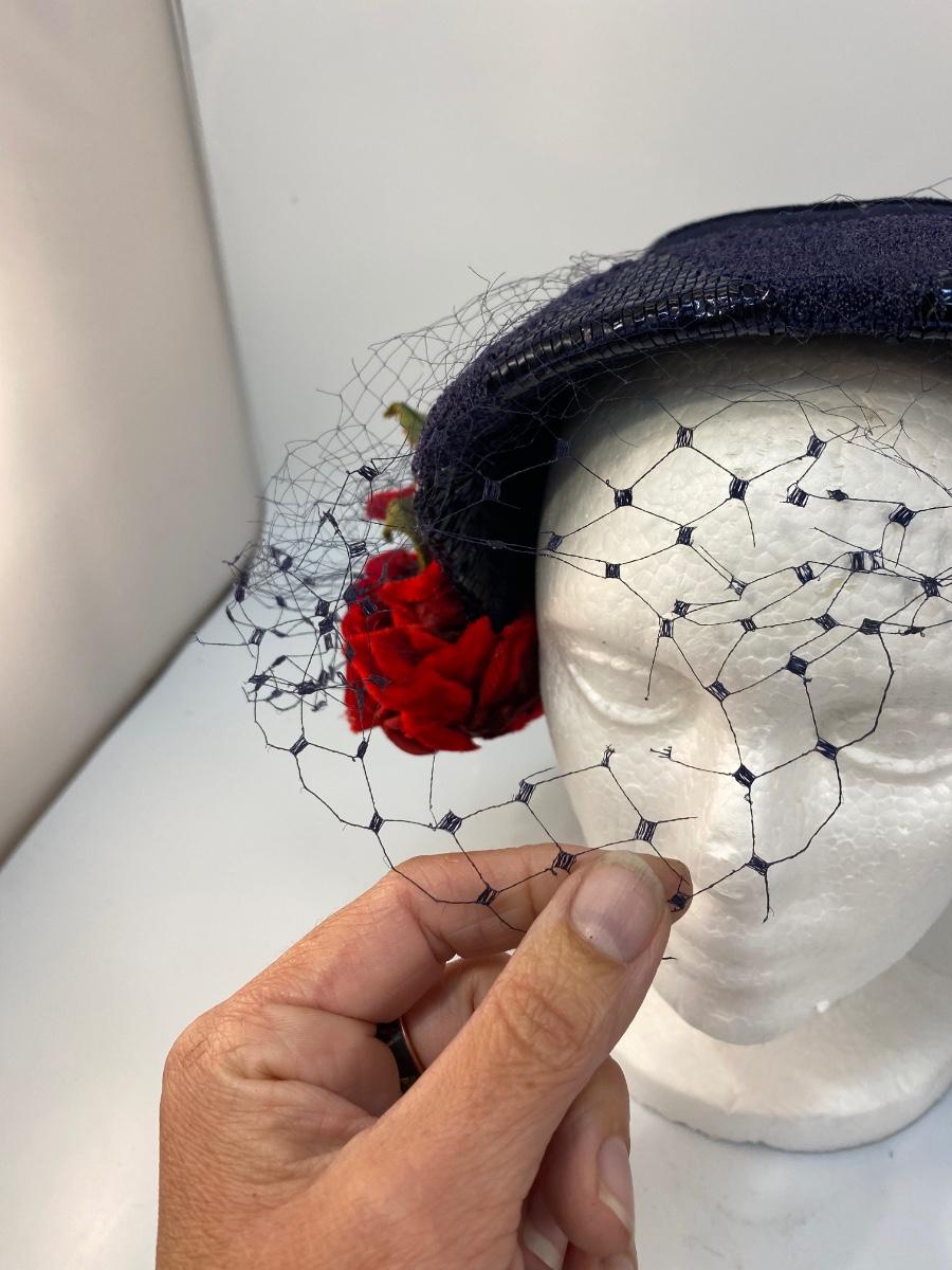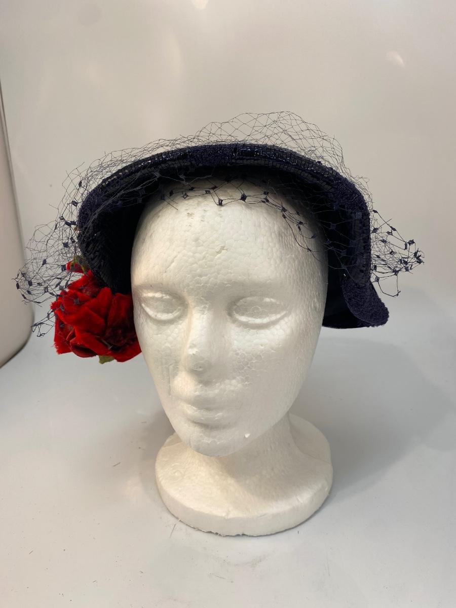 Vintage Navy Blue Skull Cap Cloche Hat with Red Flower and Netting El-Marie Santa Ana CA