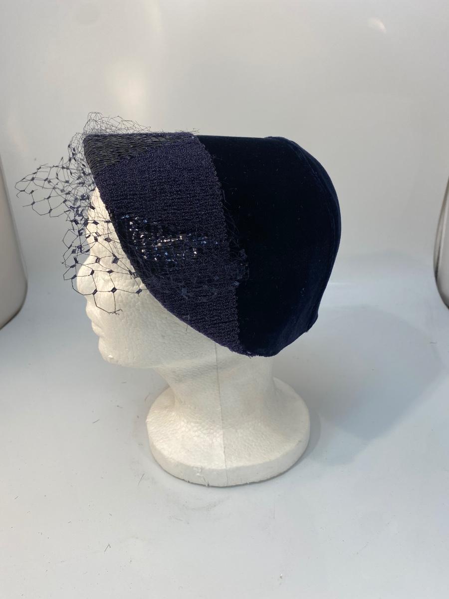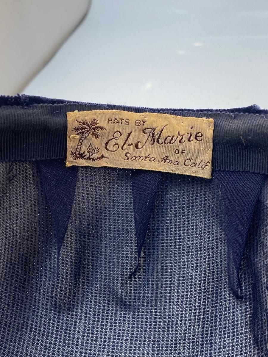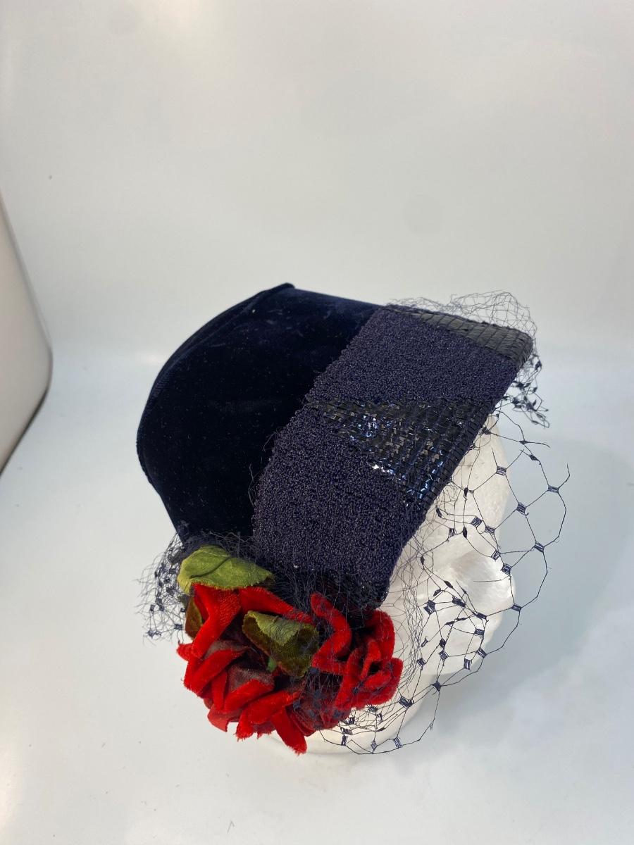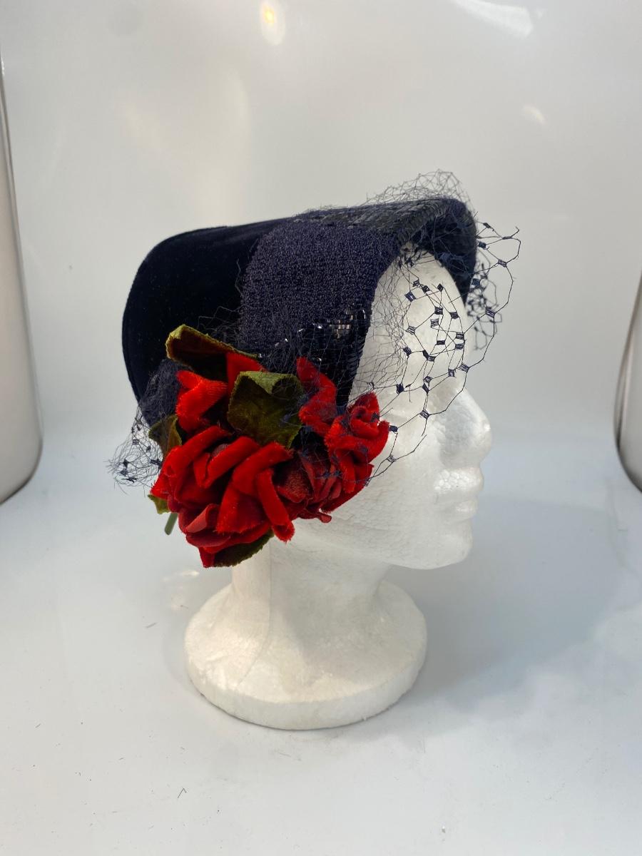 Vintage Navy Blue Skull Cap Cloche Hat with Red Flower and Netting El-Marie Santa Ana CA