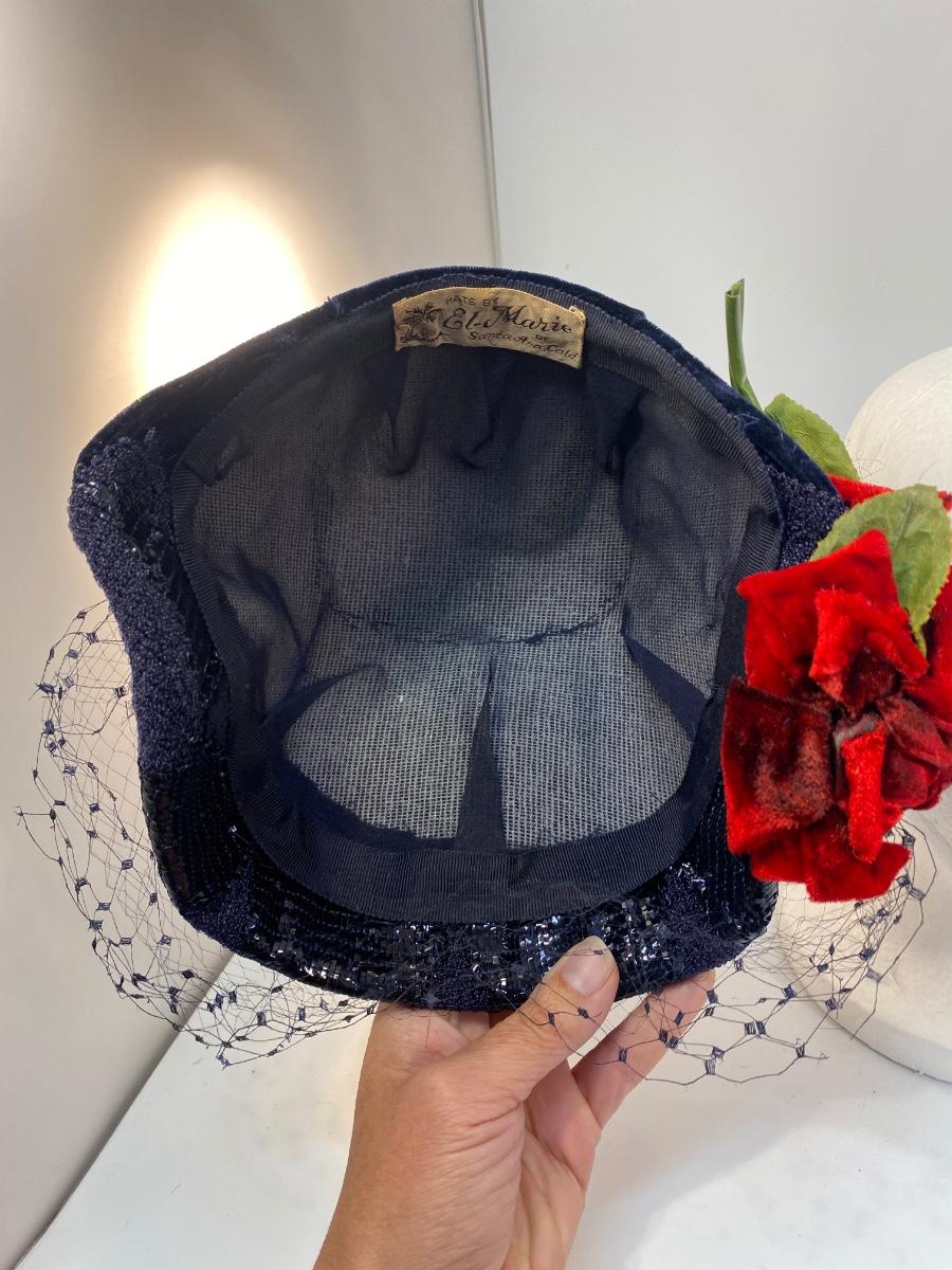 Vintage Navy Blue Skull Cap Cloche Hat with Red Flower and Netting El-Marie Santa Ana CA. Beautiful deep navy blue with red faux rose. Has maker tag inside. In good vintage condition.