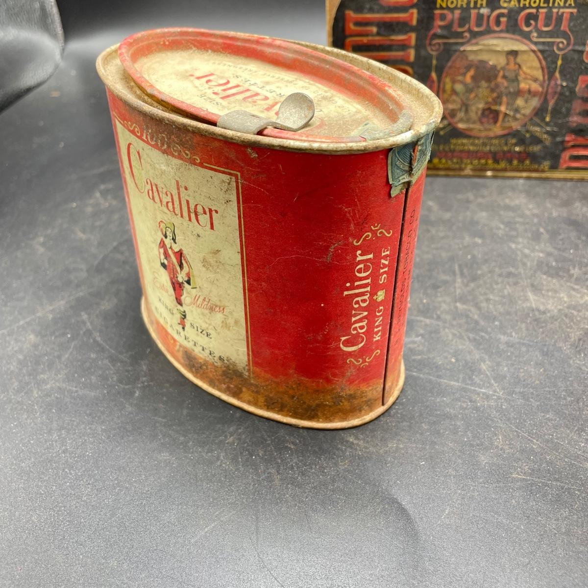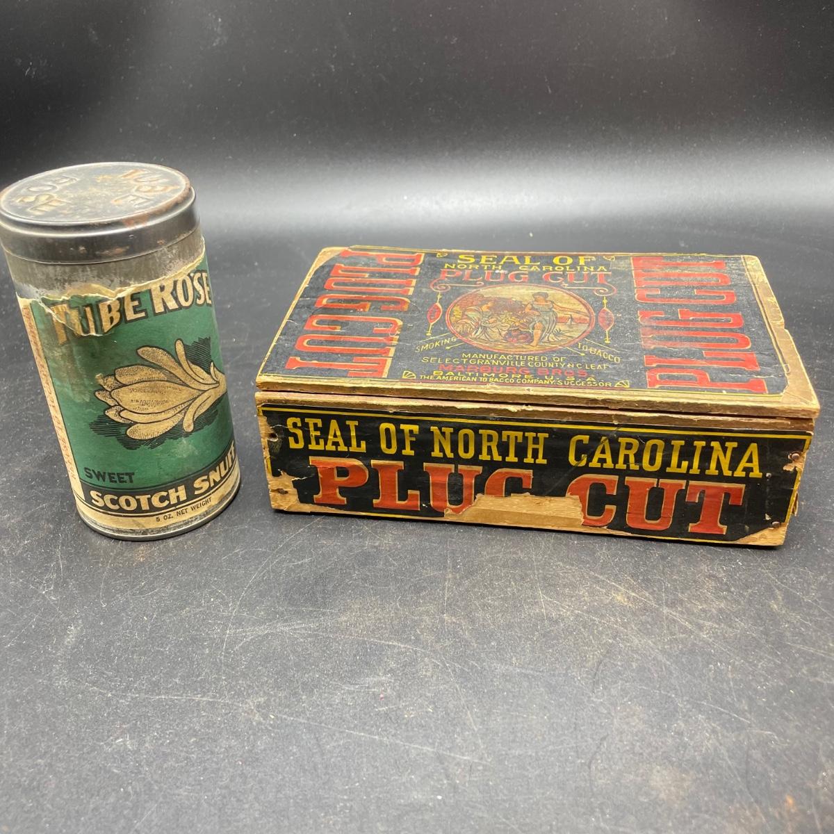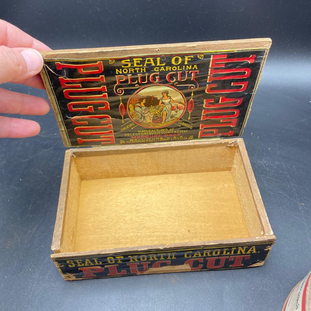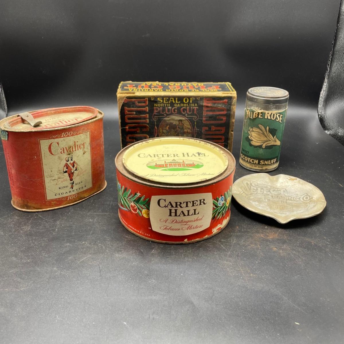 Tobacco Advertising from North Carolina including a hand forged 4.5”d ashtray. The three tins include an oval Cavalier King Sized Cigarette tin, a paper wrapped Carter Hall gift tin and also a Tube Rose Scotch Snuff tin. Lot also includes a wood box wrapped in paper declaring Marburg Bros Seal of North Carolina Plug Cut. See images. Shipping available.