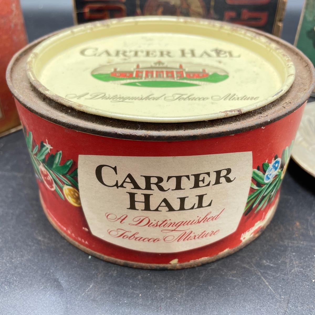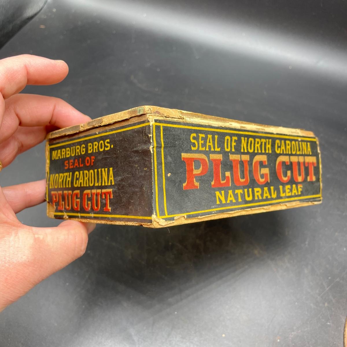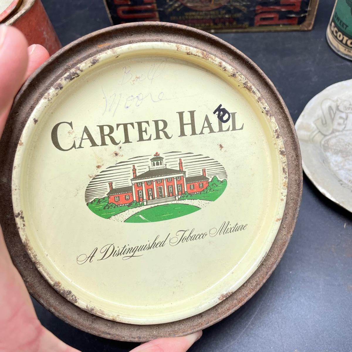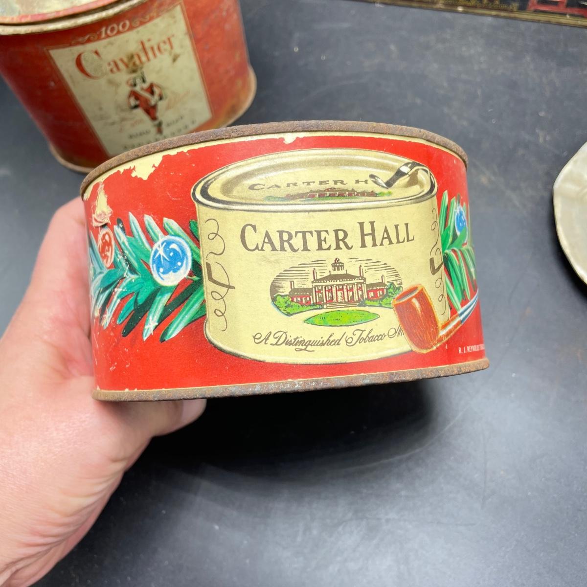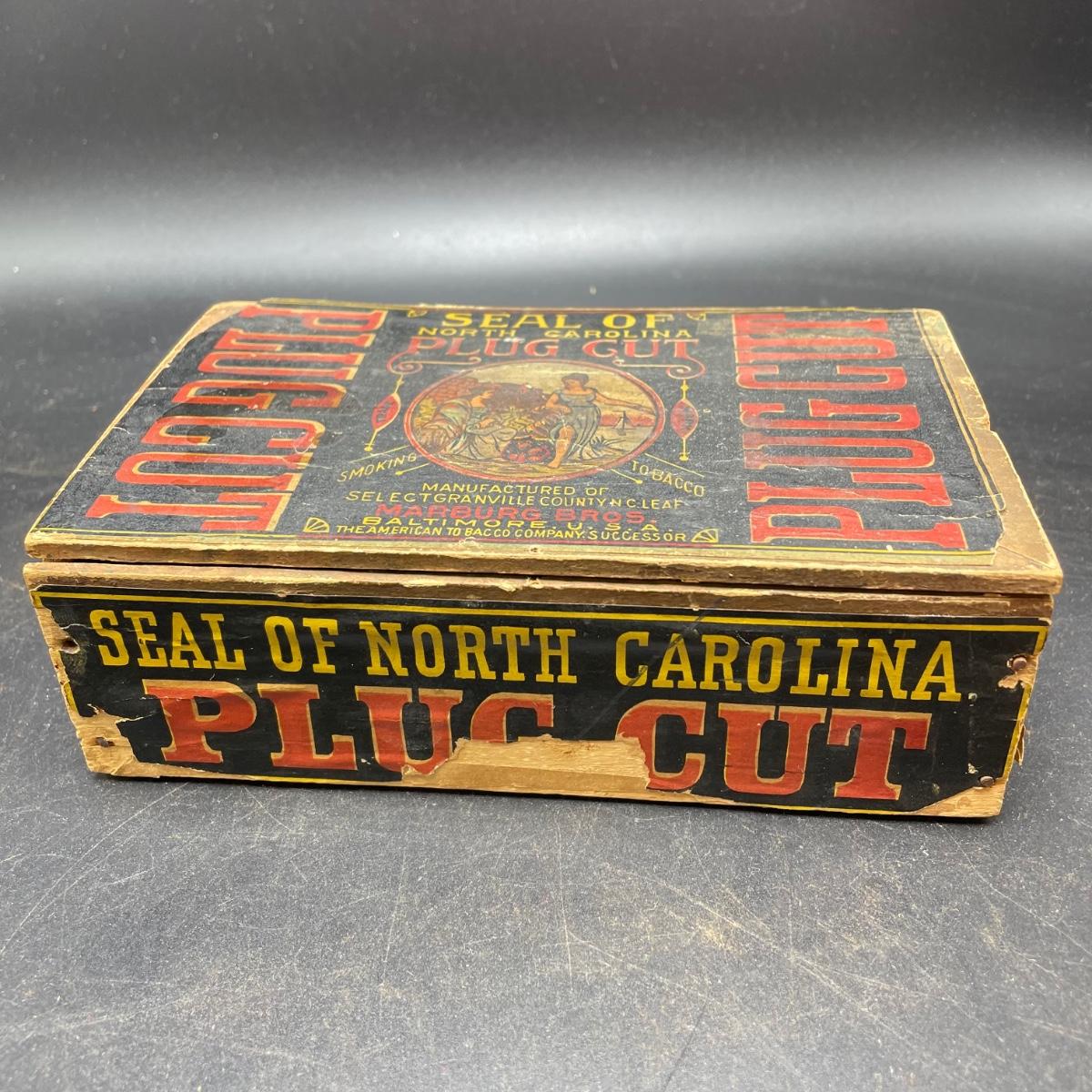 Tobacco Advertising from North Carolina including a hand forged 4.5”d ashtray. The three tins include an oval Cavalier King Sized Cigarette tin, a paper wrapped Carter Hall gift tin and also a Tube Rose Scotch Snuff tin. Lot also includes a wood box wrapped in paper declaring Marburg Bros Seal of North Carolina Plug Cut. See images. Shipping available.
