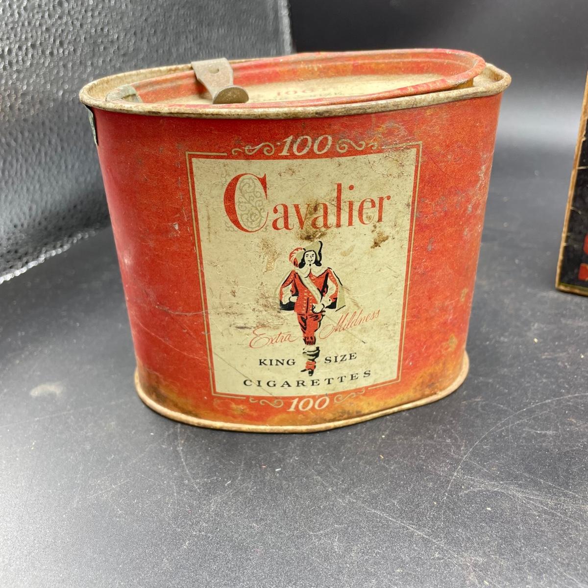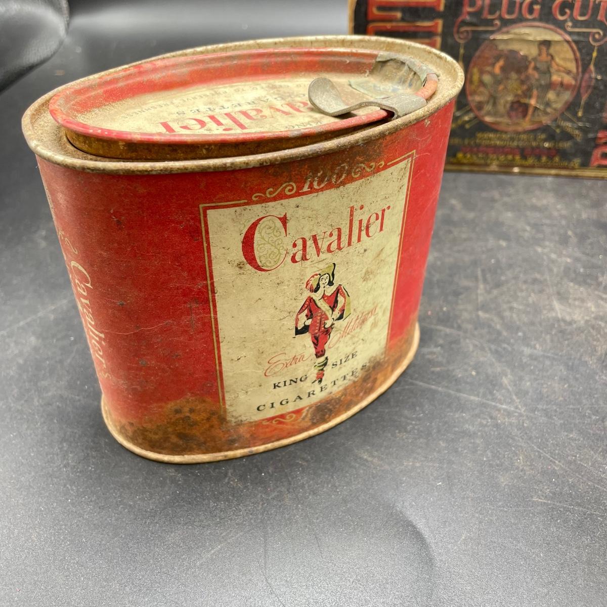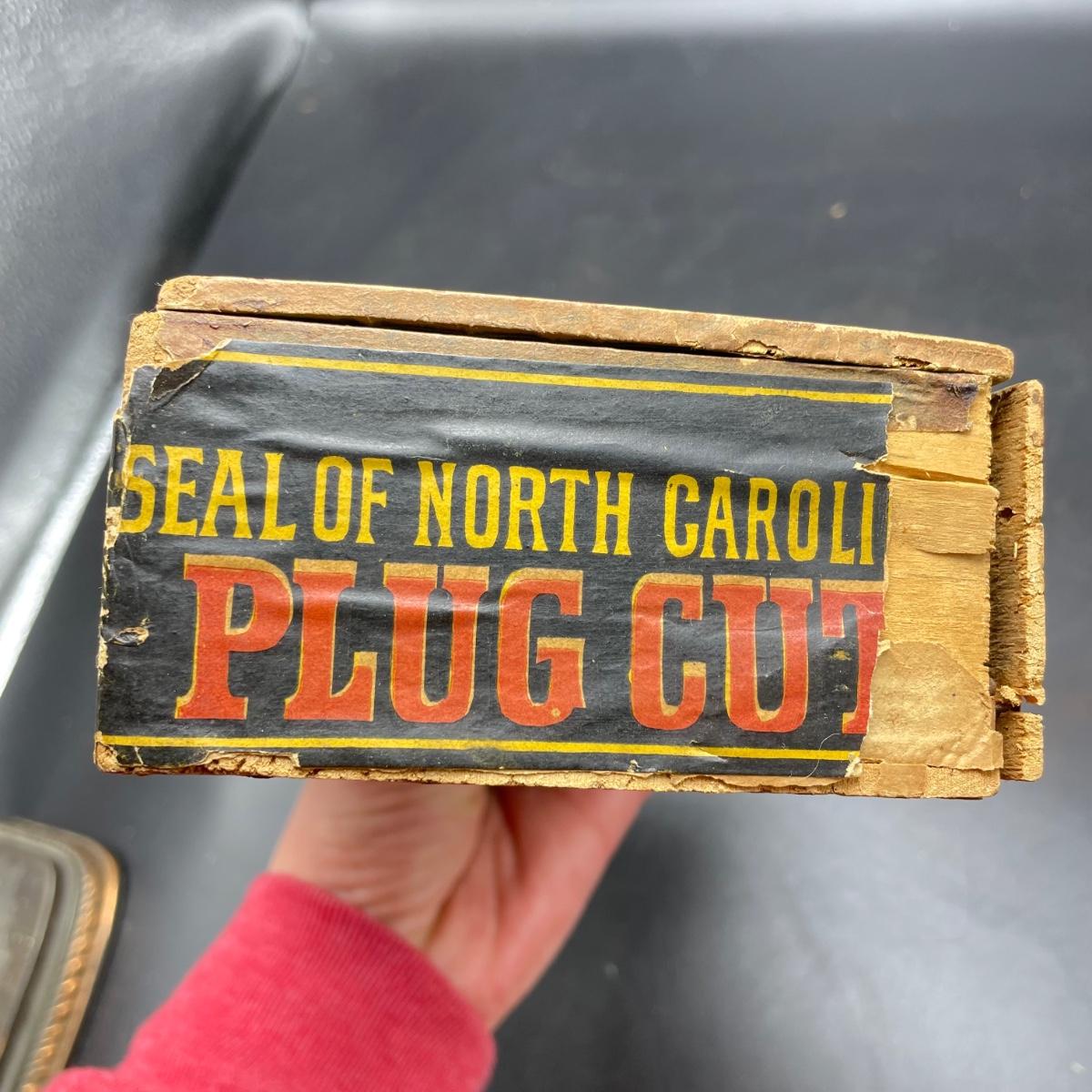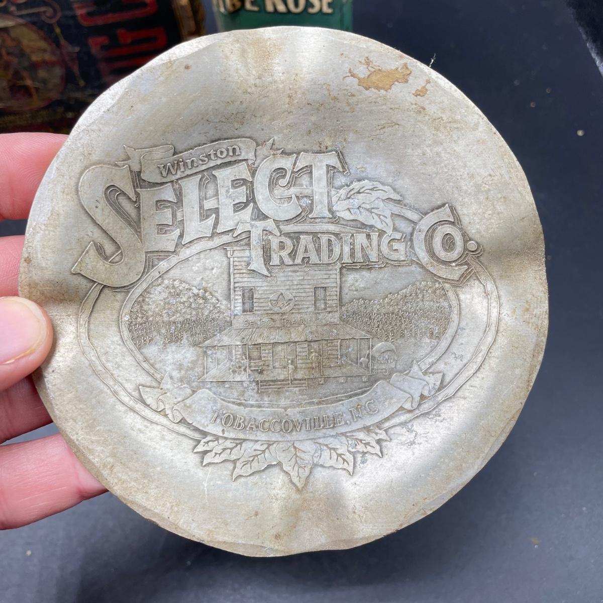Tobacco Advertising from North Carolina including a hand forged 4.5”d ashtray. The three tins include an oval Cavalier King Sized Cigarette tin, a paper wrapped Carter Hall gift tin and also a Tube Rose Scotch Snuff tin. Lot also includes a wood box wrapped in paper declaring Marburg Bros Seal of North Carolina Plug Cut. See images. Shipping available.