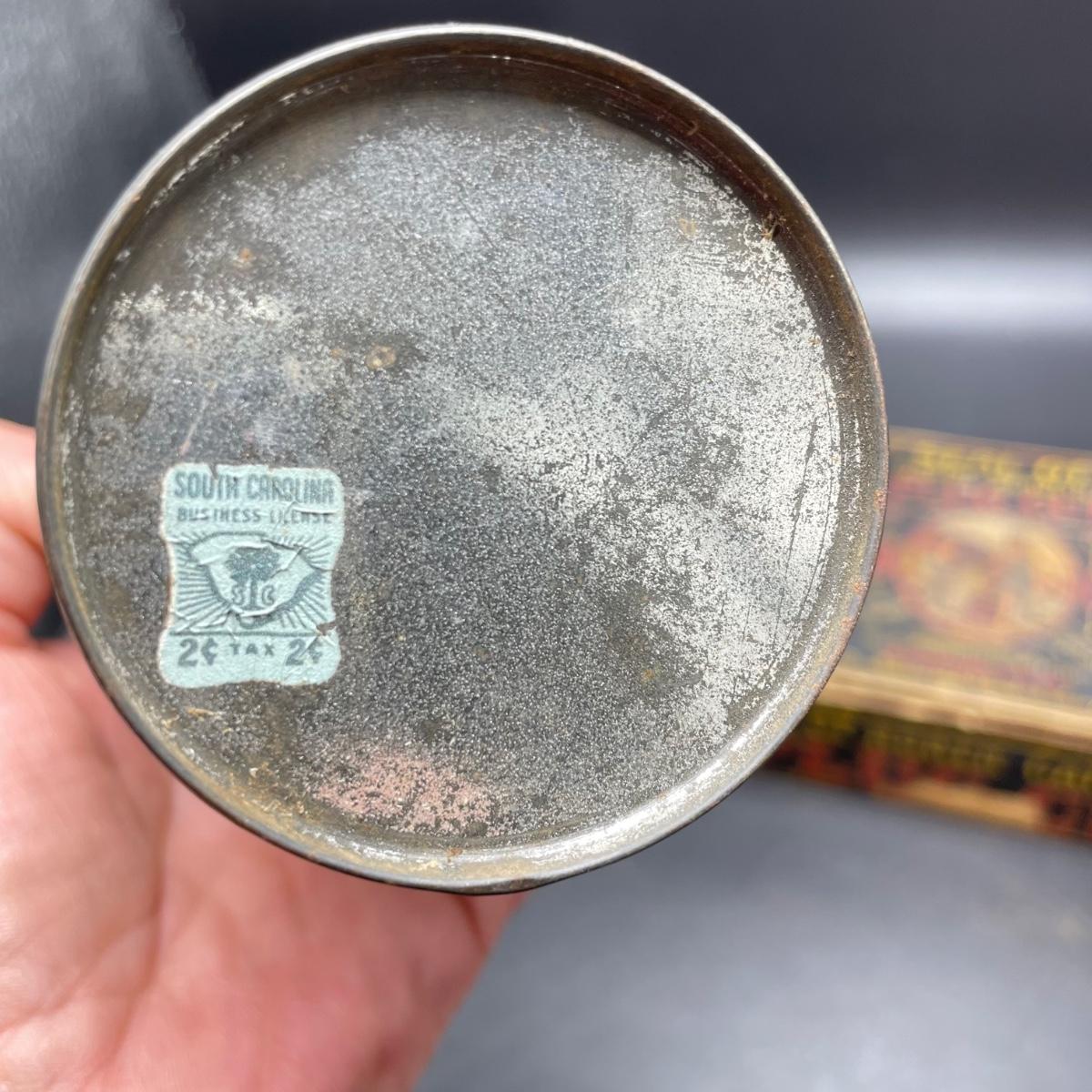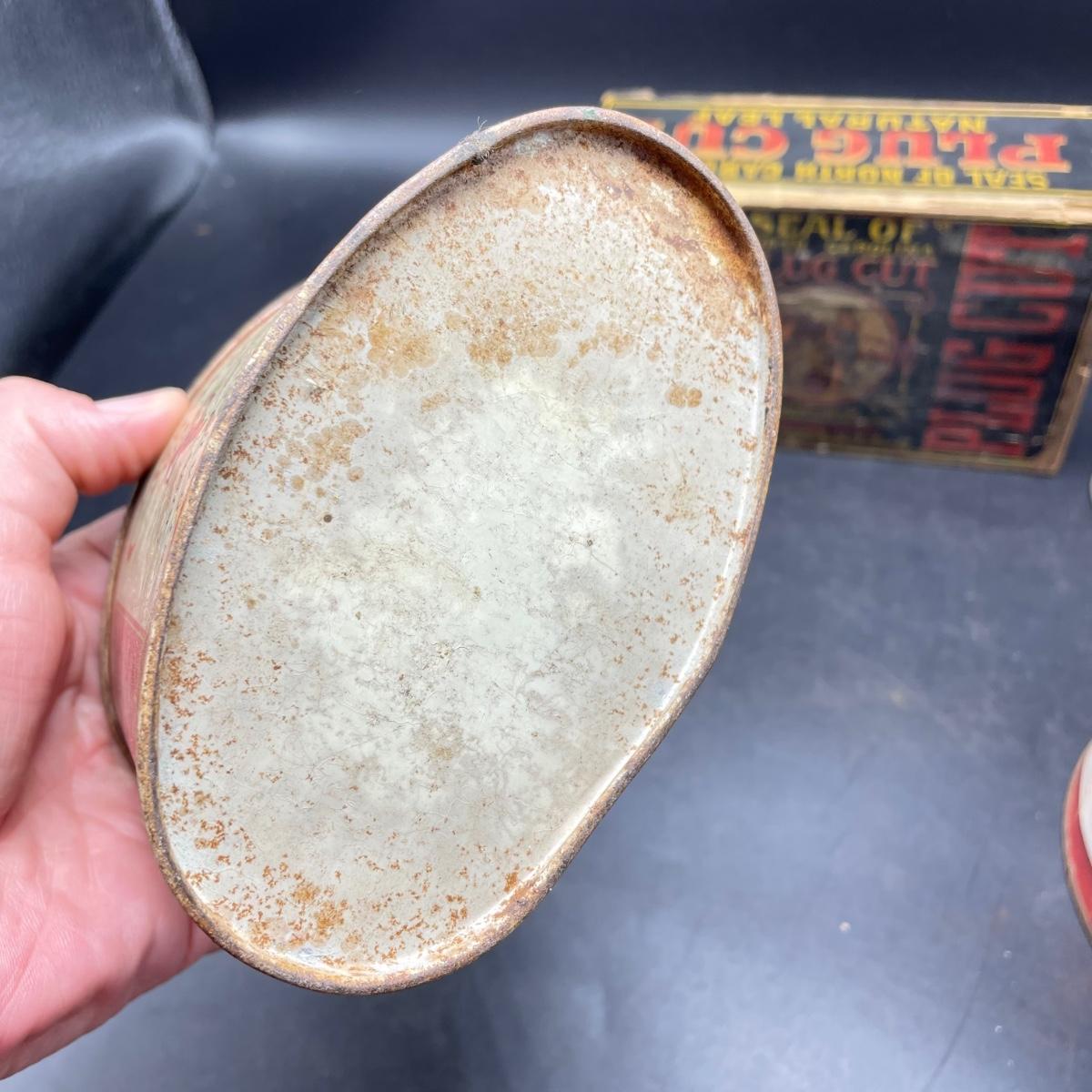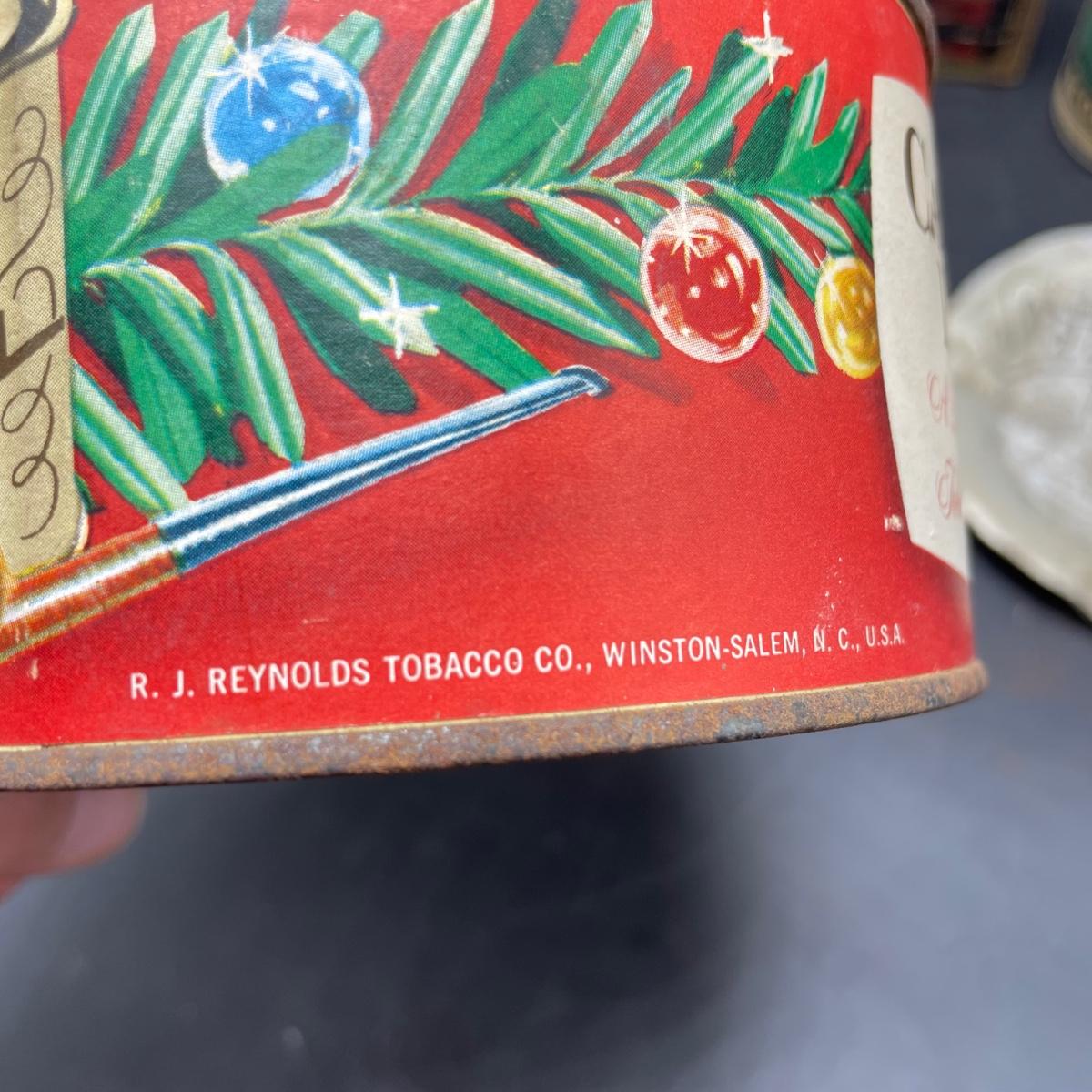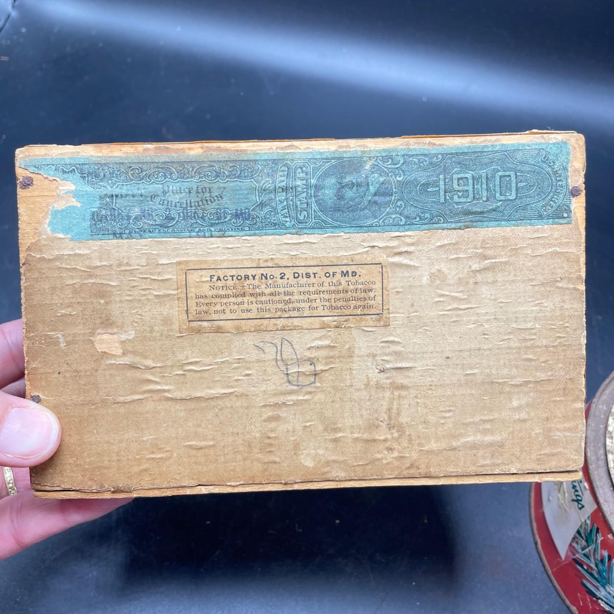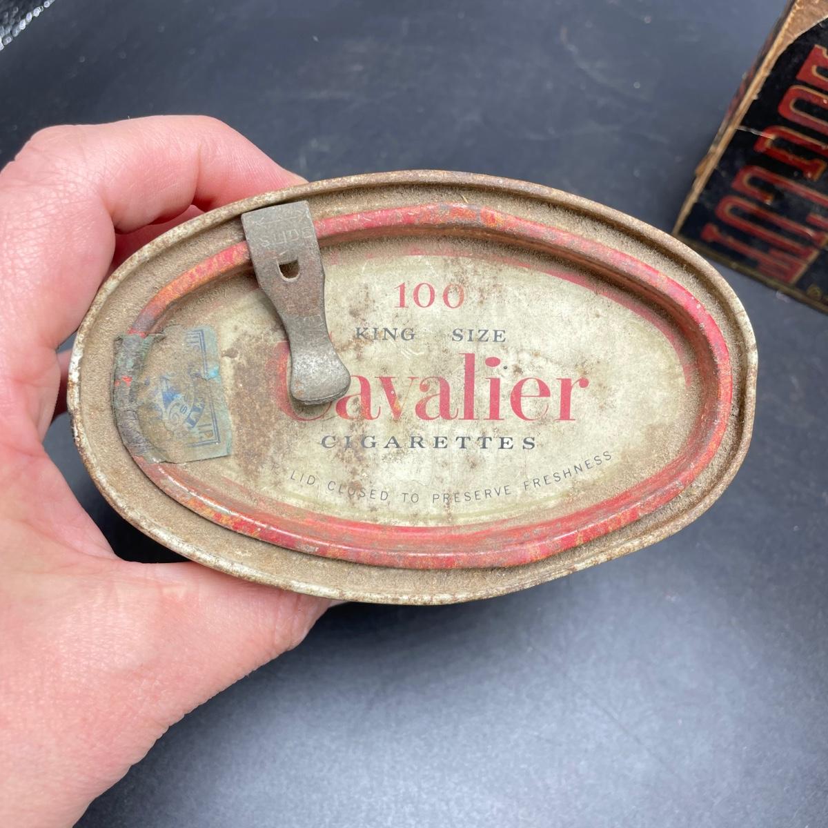 Tobacco Advertising from North Carolina including a hand forged 4.5”d ashtray. The three tins include an oval Cavalier King Sized Cigarette tin, a paper wrapped Carter Hall gift tin and also a Tube Rose Scotch Snuff tin. Lot also includes a wood box wrapped in paper declaring Marburg Bros Seal of North Carolina Plug Cut. See images. Shipping available.