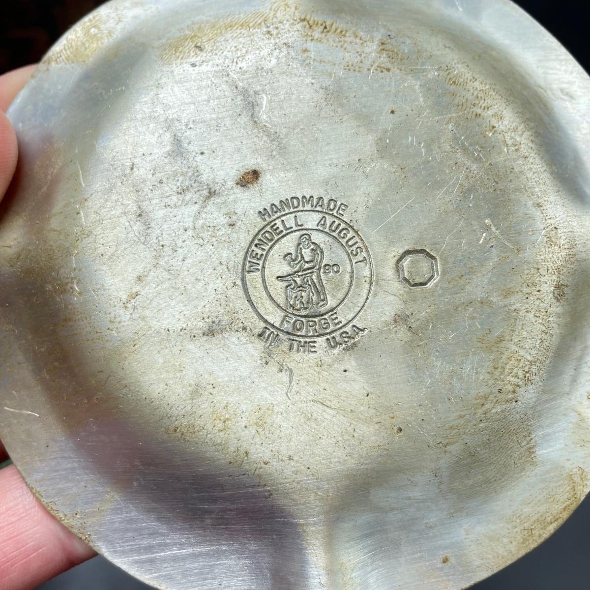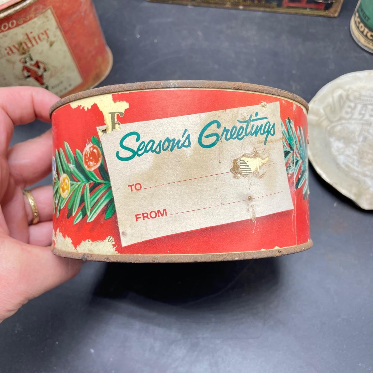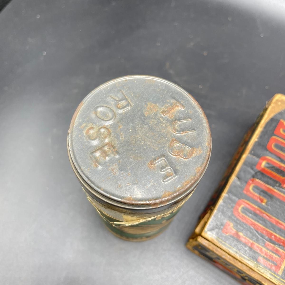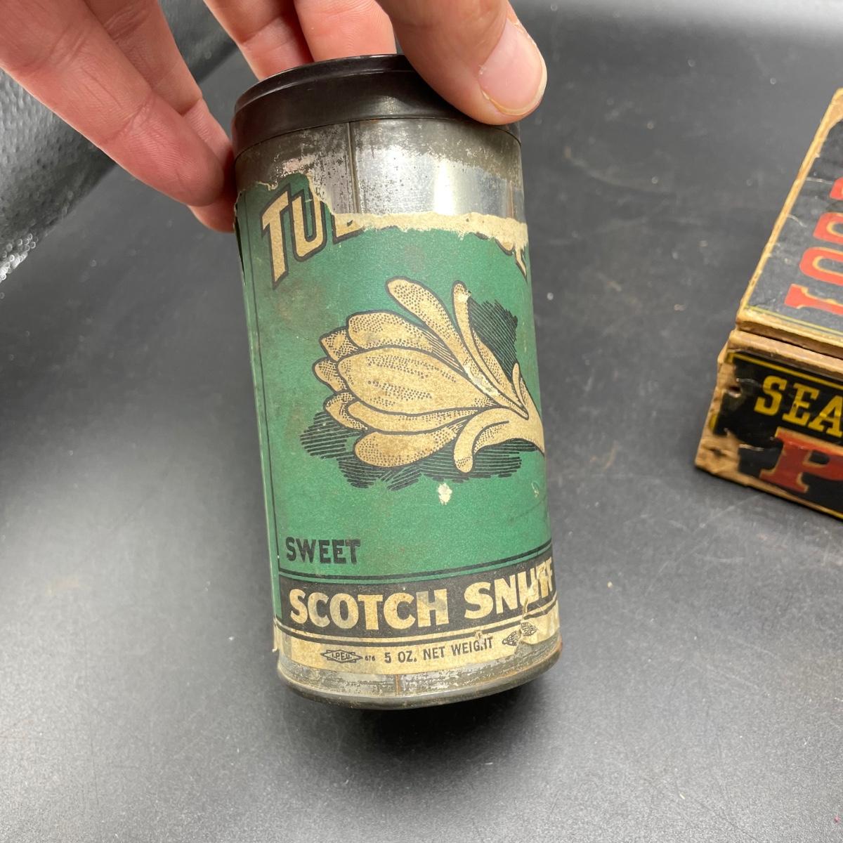 Tobacco Advertising from North Carolina including a hand forged 4.5”d ashtray. The three tins include an oval Cavalier King Sized Cigarette tin, a paper wrapped Carter Hall gift tin and also a Tube Rose Scotch Snuff tin. Lot also includes a wood box wrapped in paper declaring Marburg Bros Seal of North Carolina Plug Cut. See images. Shipping available.