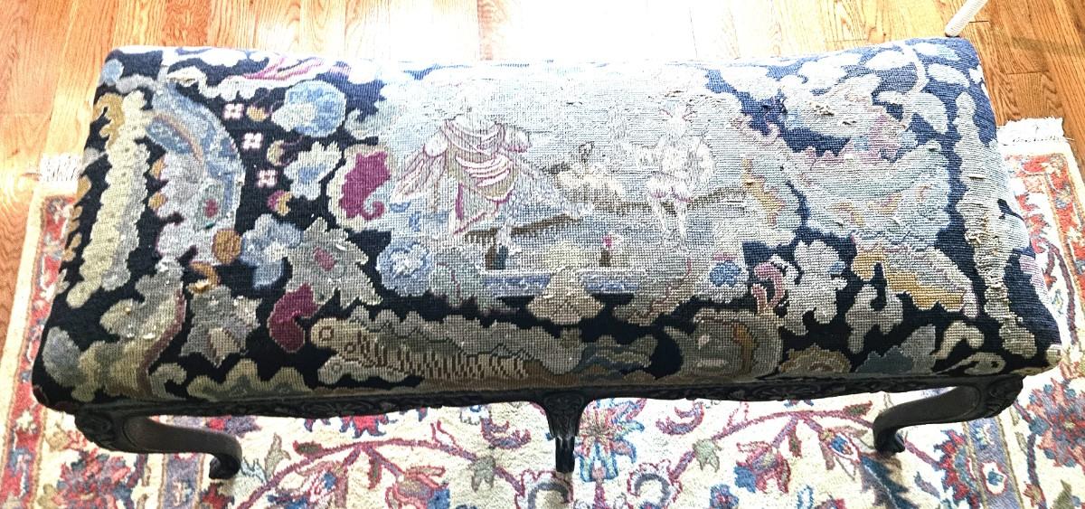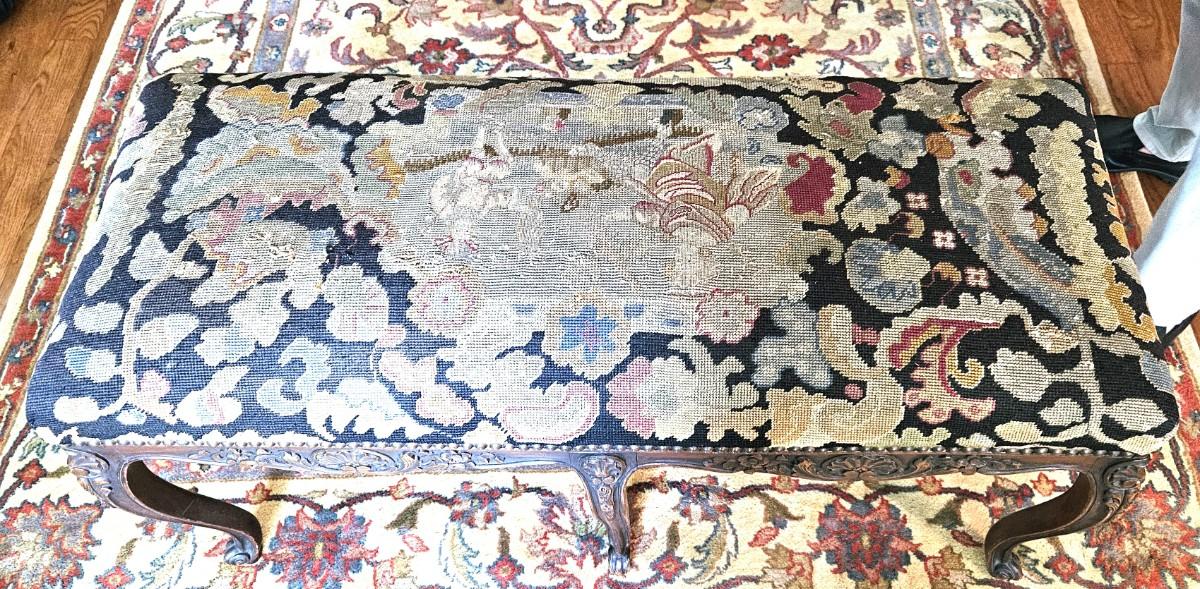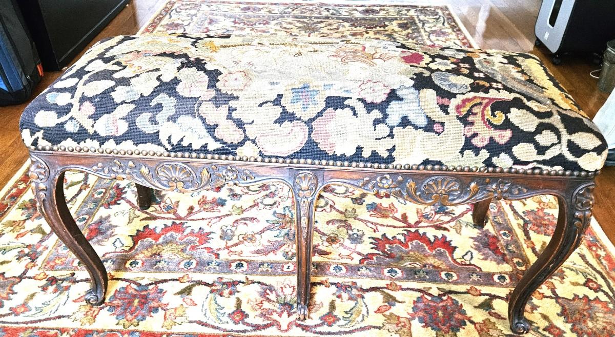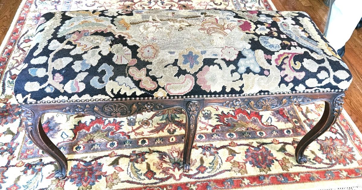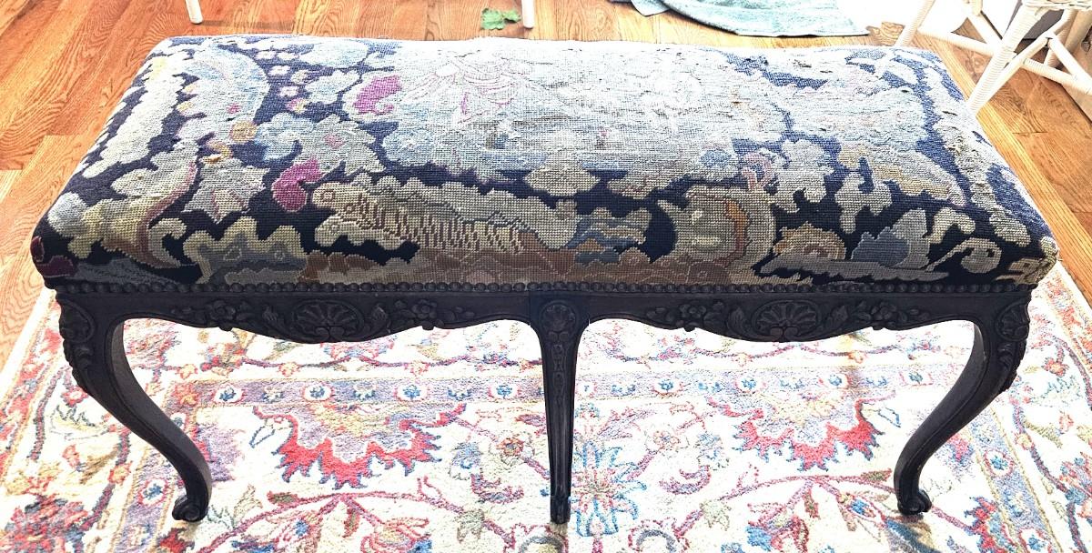 Vintage Needlepoint Bench WIth Floral Design and Dark Wood Frame