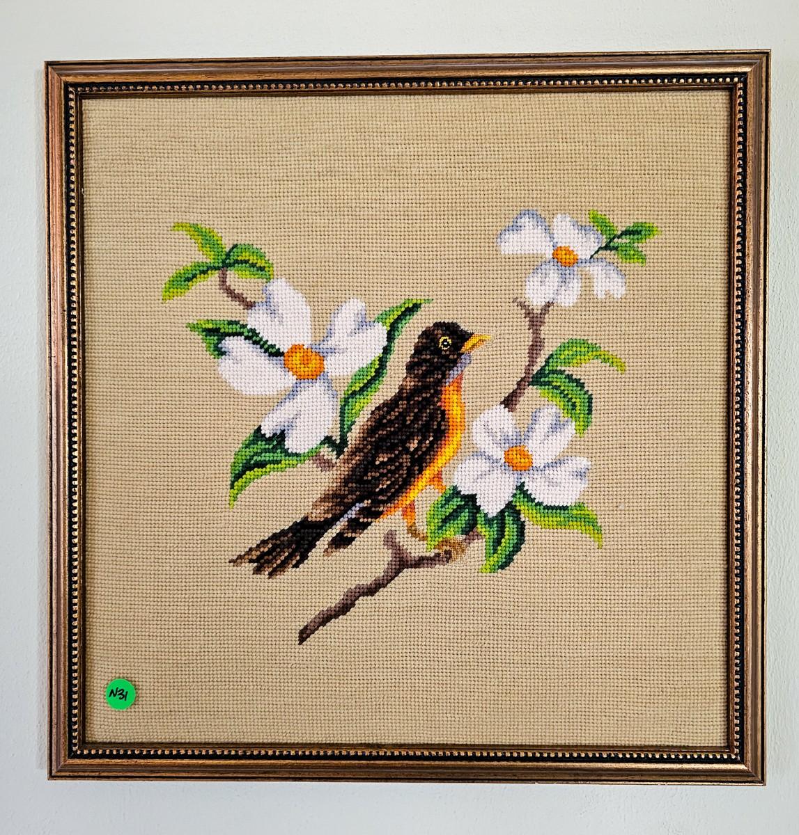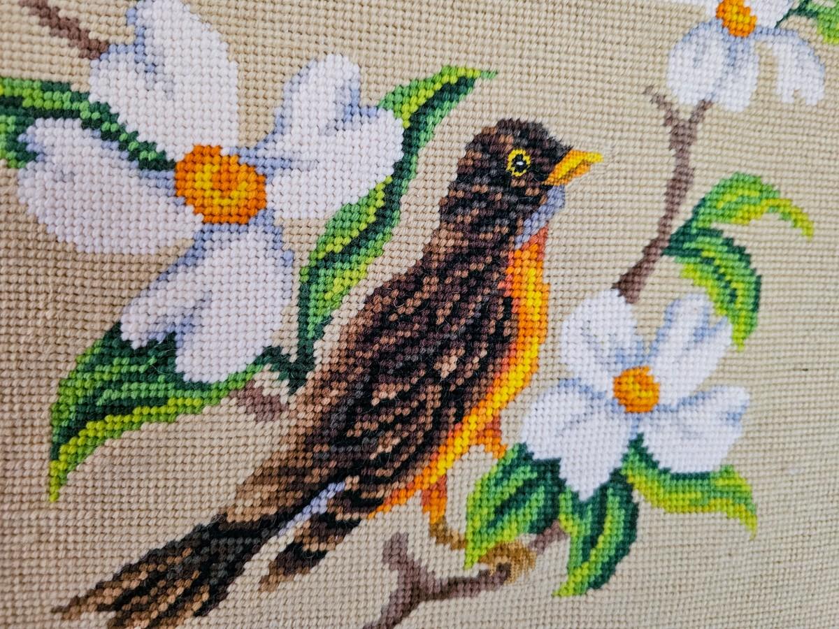 Framed vintage needlepoint depicting a bird on a magnolia branch. 18" x 18"