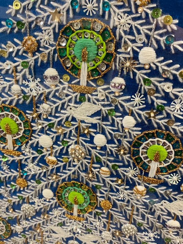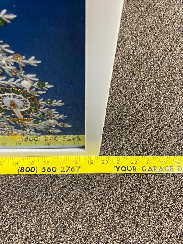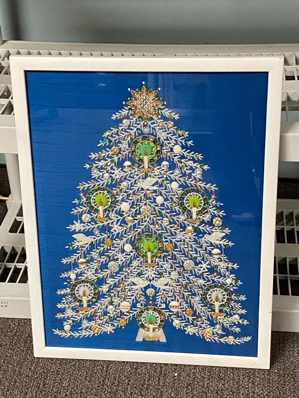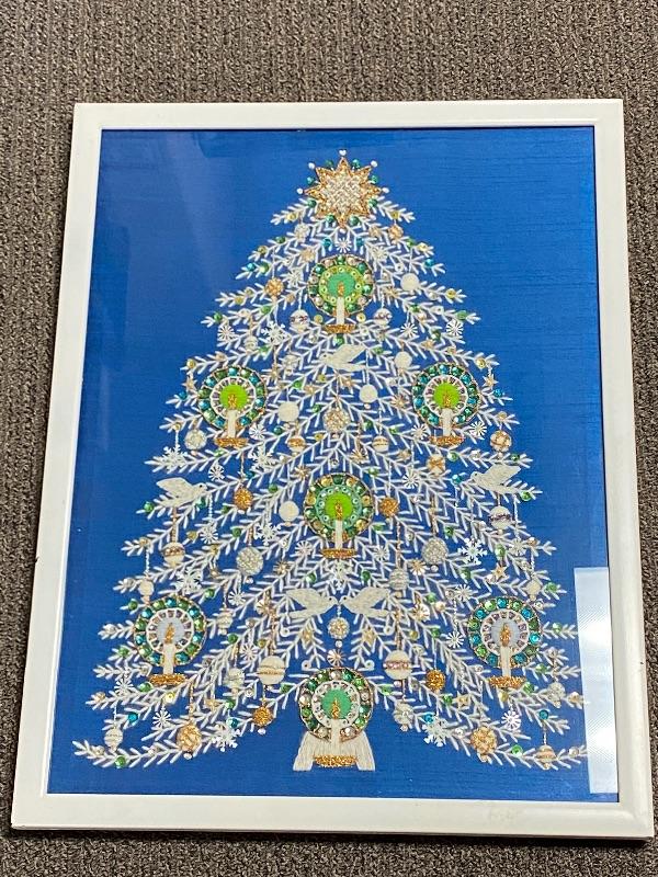 Vintage Christmas Tree Framed Art. Blue backing makes this white tree stand out nicely. Very similar to a vintage jewelry tree. Hand stitched. Great details give it just the right amount of shimmer. Measures roughly 20"x26".