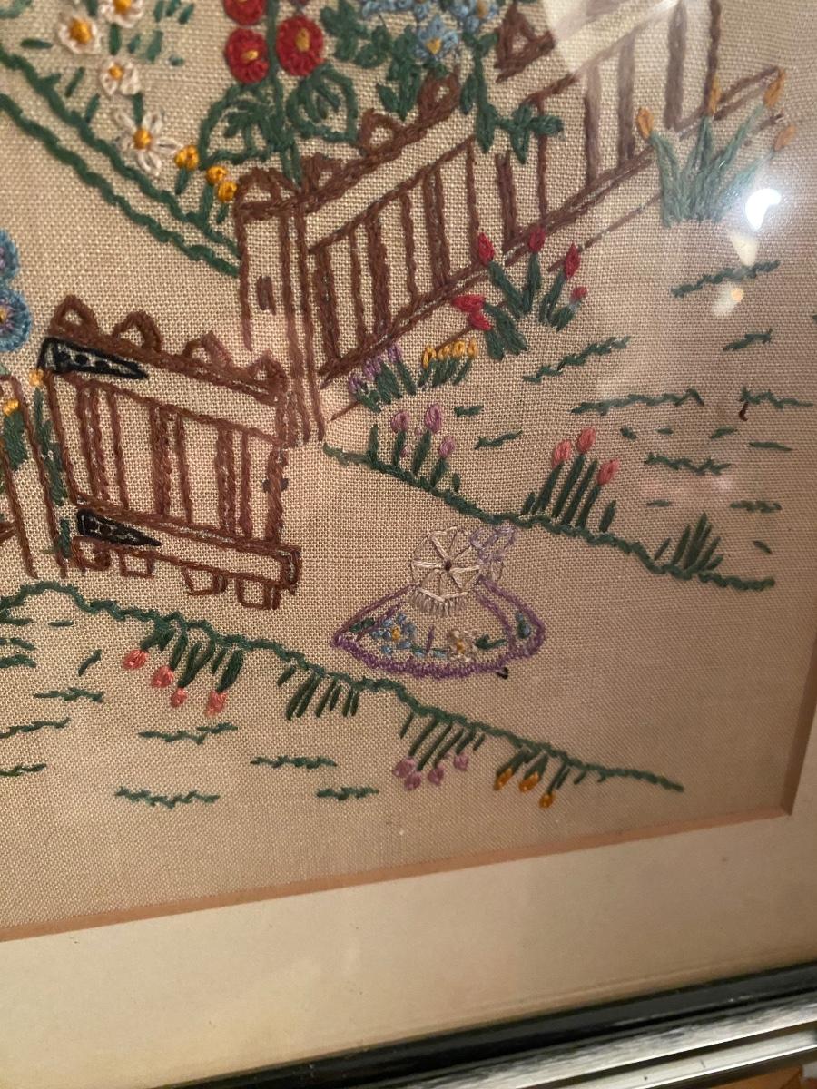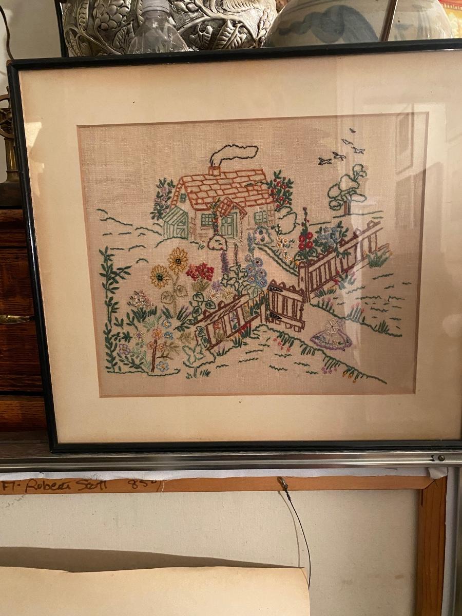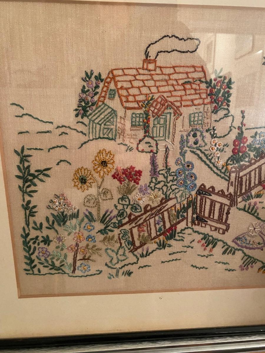 Vintage needlepoint house and garden scene framed under glass. Signed by gift giver on the back.. Approx 17x15
