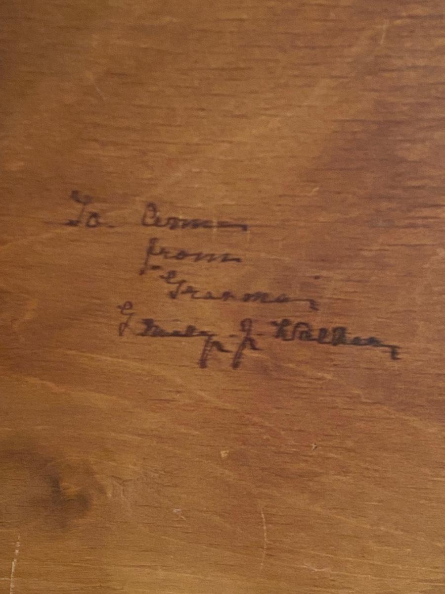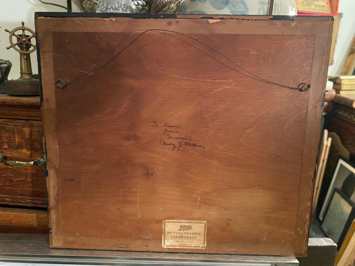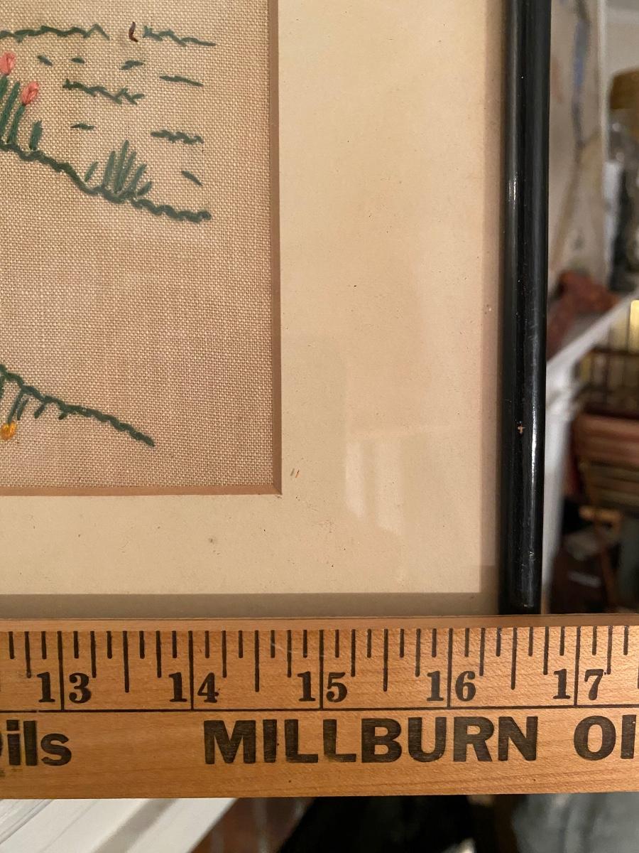 Vintage needlepoint house and garden scene framed under glass. Signed by gift giver on the back.. Approx 17x15