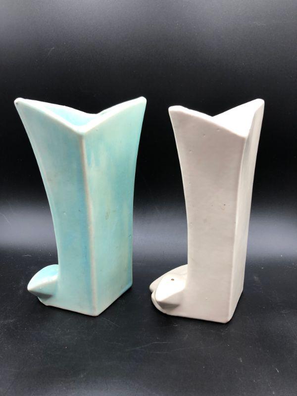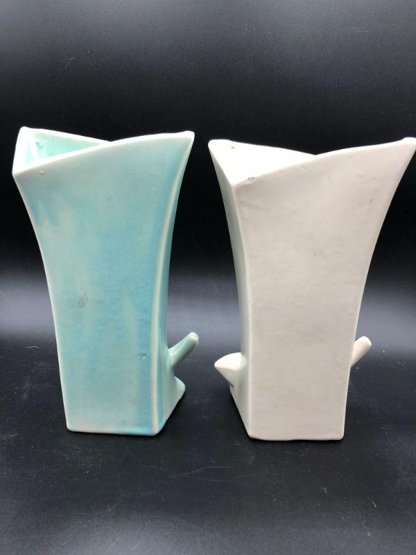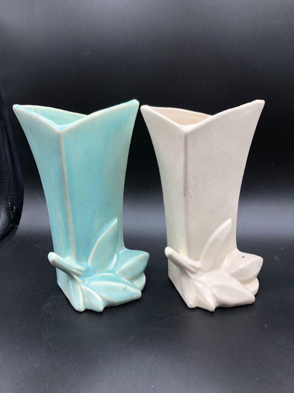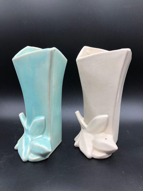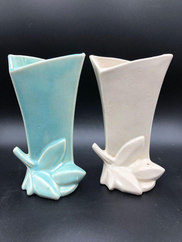 Here's a pair of Vintage Nelson McCoy Lily Bud Leaf Design Vases. One is light mint green glaze and the other is creamy white glaze. Marked NM USA. The mint green vase is in very good condition with the exception of a chip on the bottom edge that only shows when you turn it over. , The white one is in very good condition except for a 1/16" hole on top of the leaf at the bottom and a tiny chip on the rim in the back. They are approx 8" tall and 5 " across.