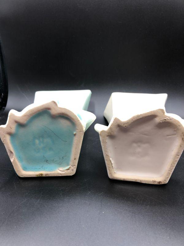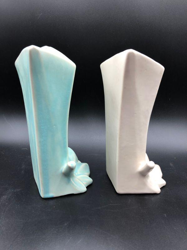 VINTAGE NELSON McCOY LILY BUD LEAF DESIGN VASES -  rare 1940's PAIR - mint green and creamy white USA