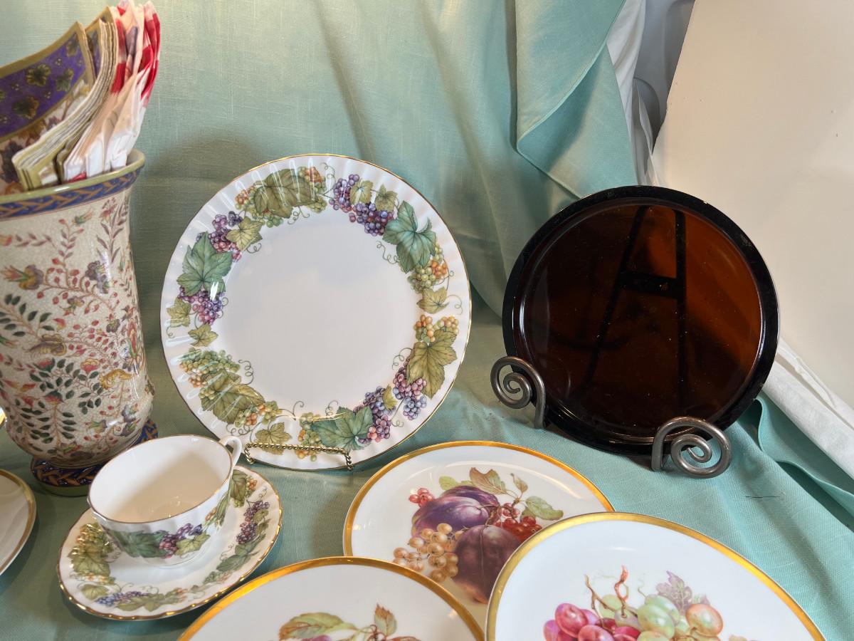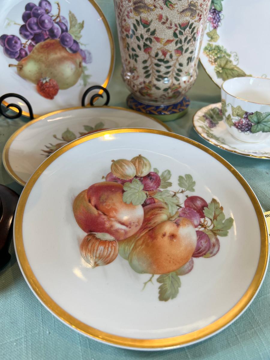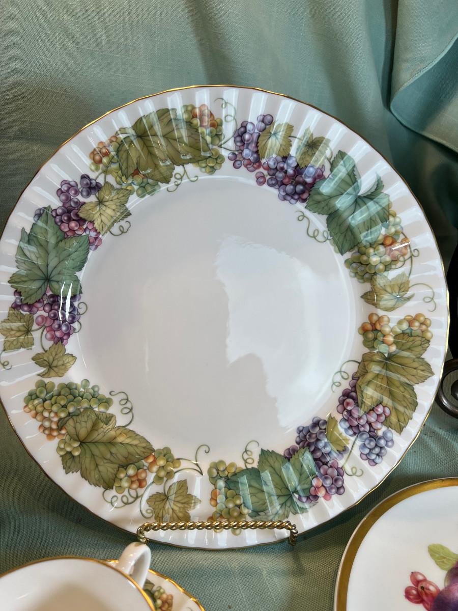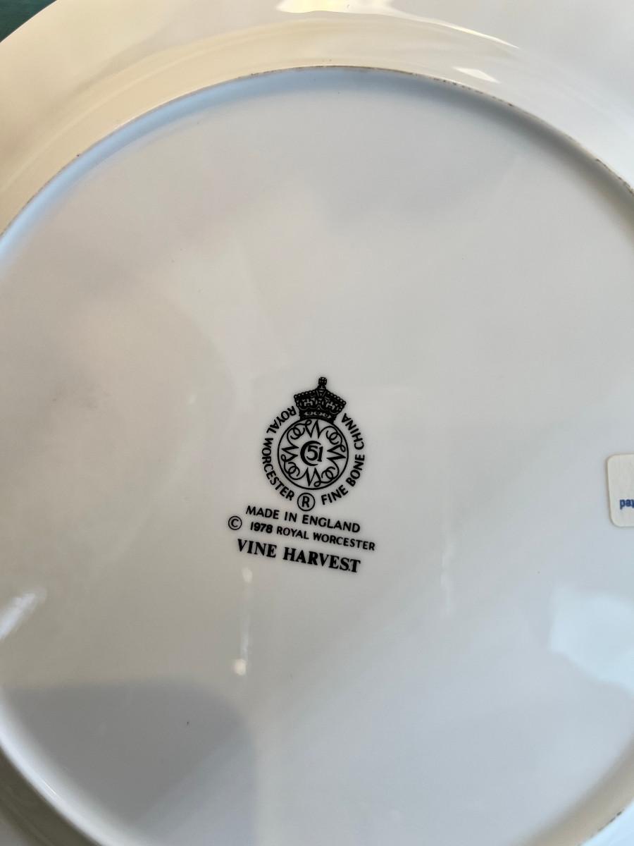 Royal Worcester Fine English Bone China set of "Vine Harvest" dessert plates, Winward vase and container ceramic,