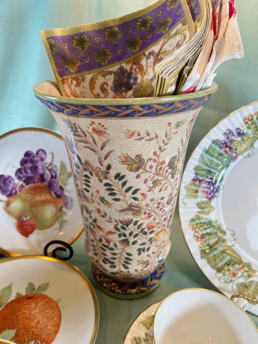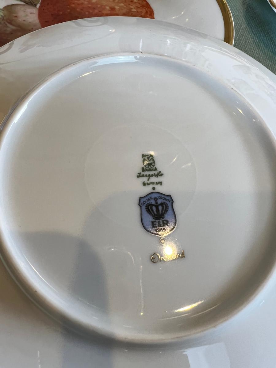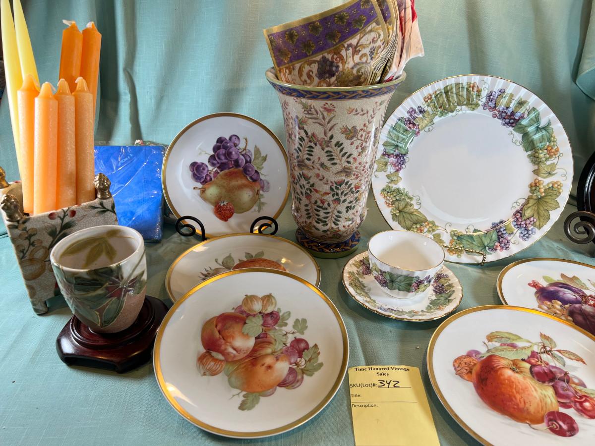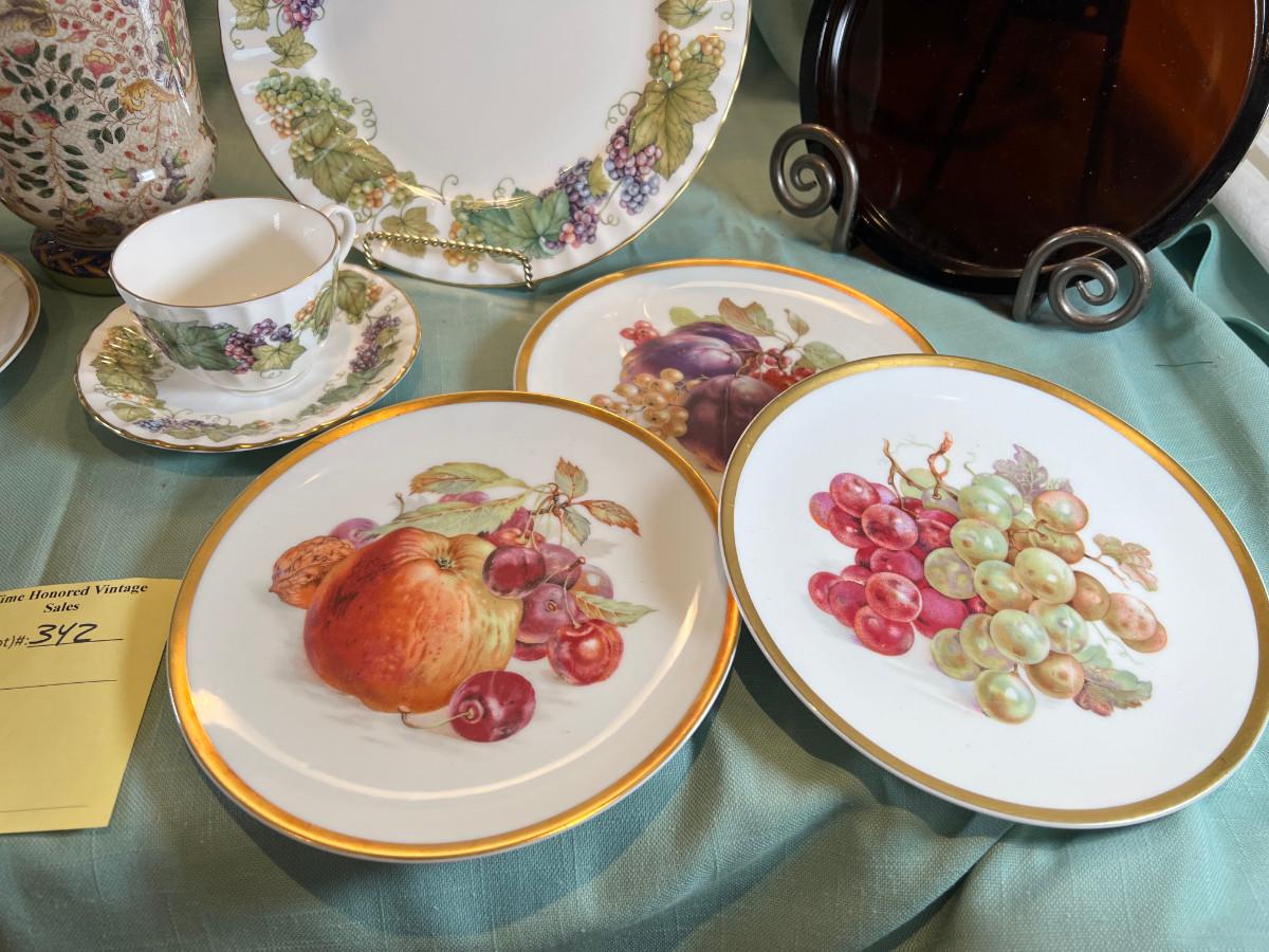 Royal Worcester Fine English Bone China set of "Vine Harvest" dessert plates, Winward vase and container ceramic,