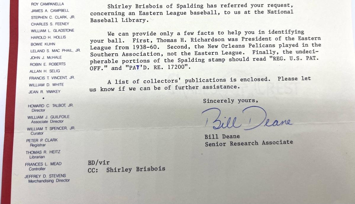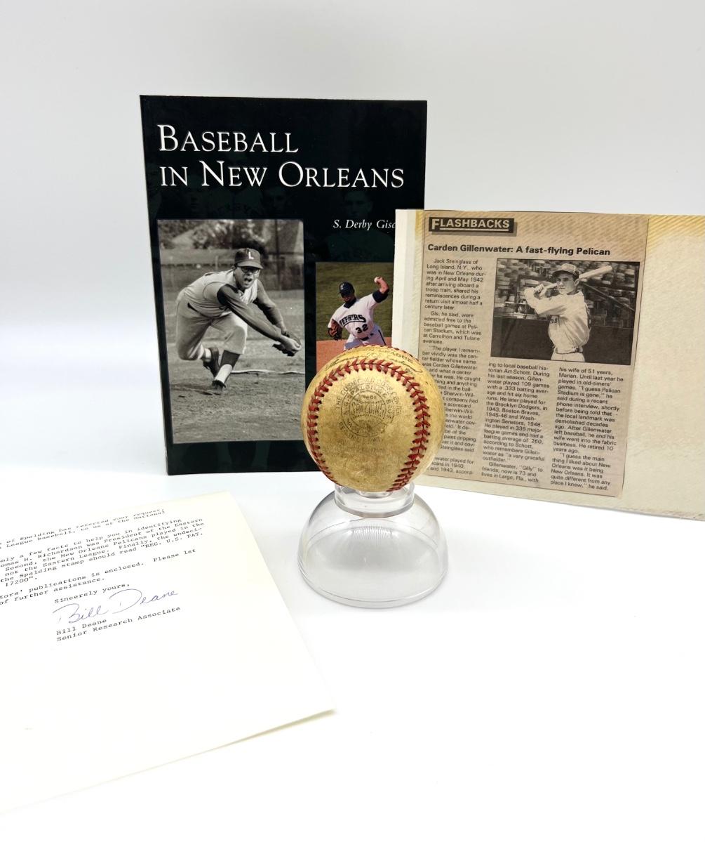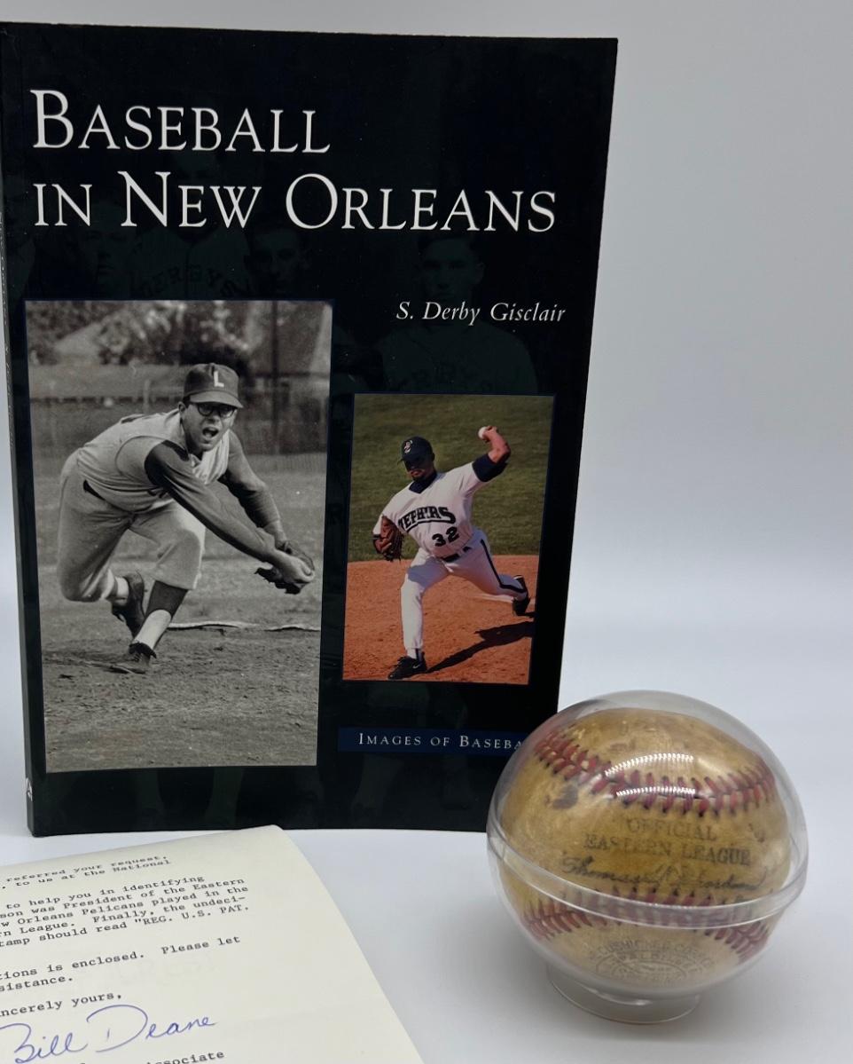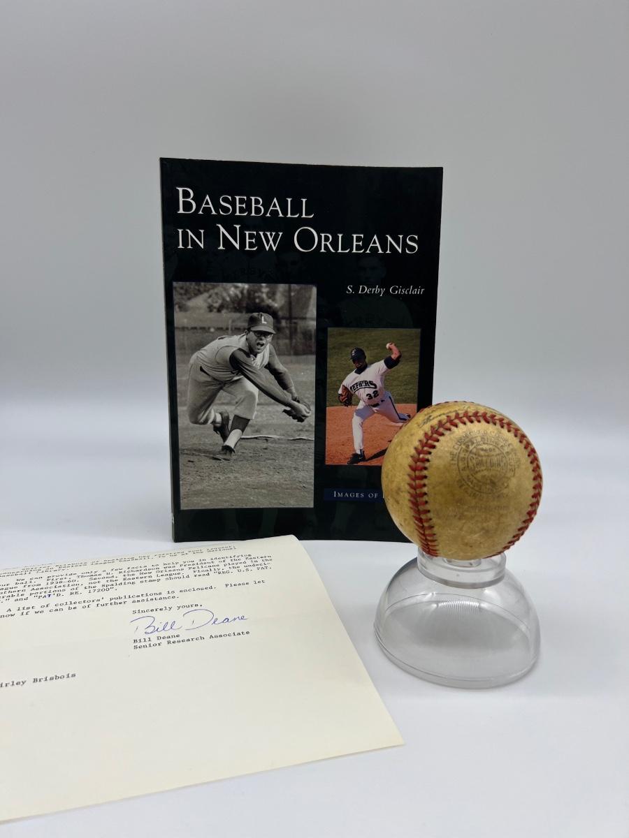 This ball comes with a typed letter signed by Bill Deane, a senior research associate. New Orleans Pelicans played in Southern Association League 1938-1960. Ball has a cover. Also comes with Baseball In New Orleans Book, newspaper article and typed letter for verification.