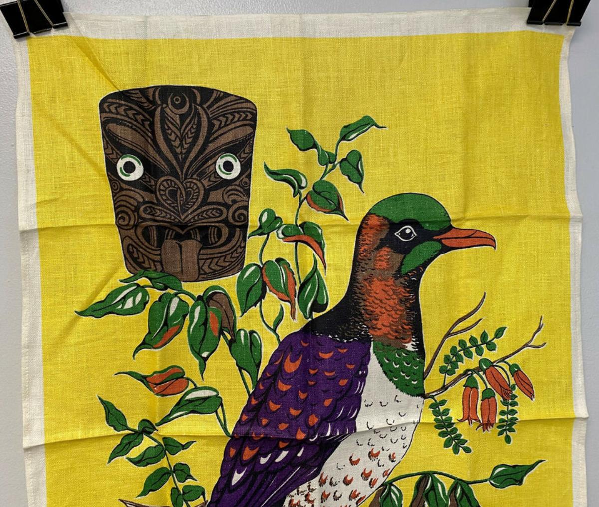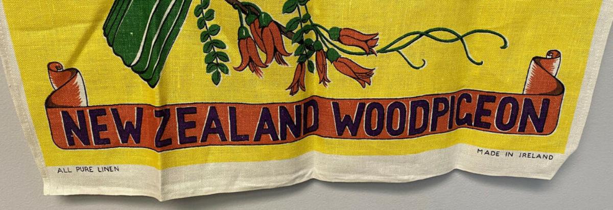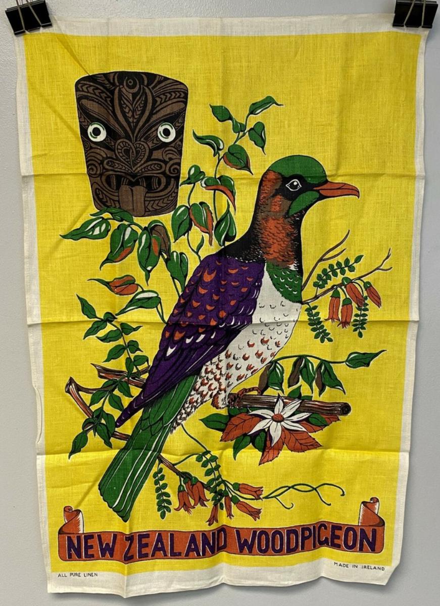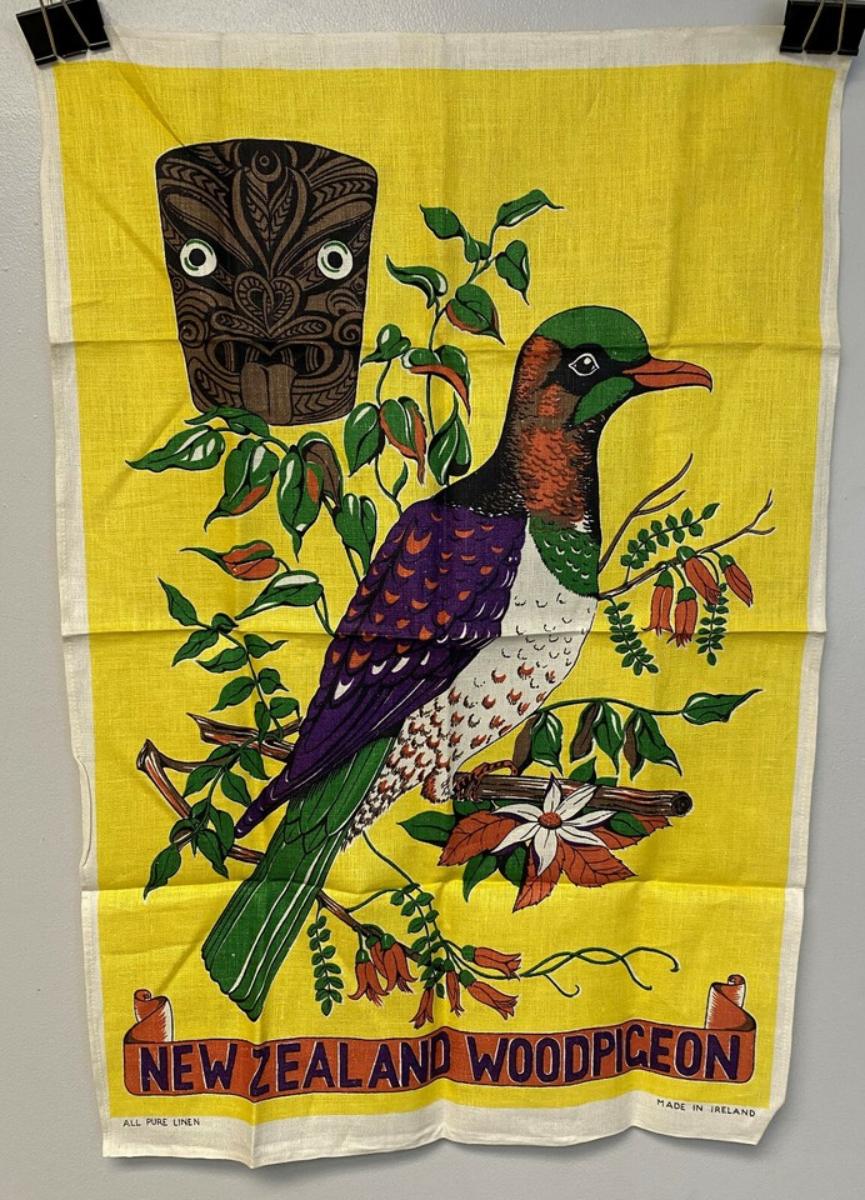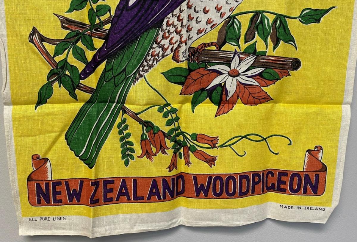 vintage NEW ZEALAND WOODPIGEON SOUVENIR LINEN TABLECLOTH 1950s