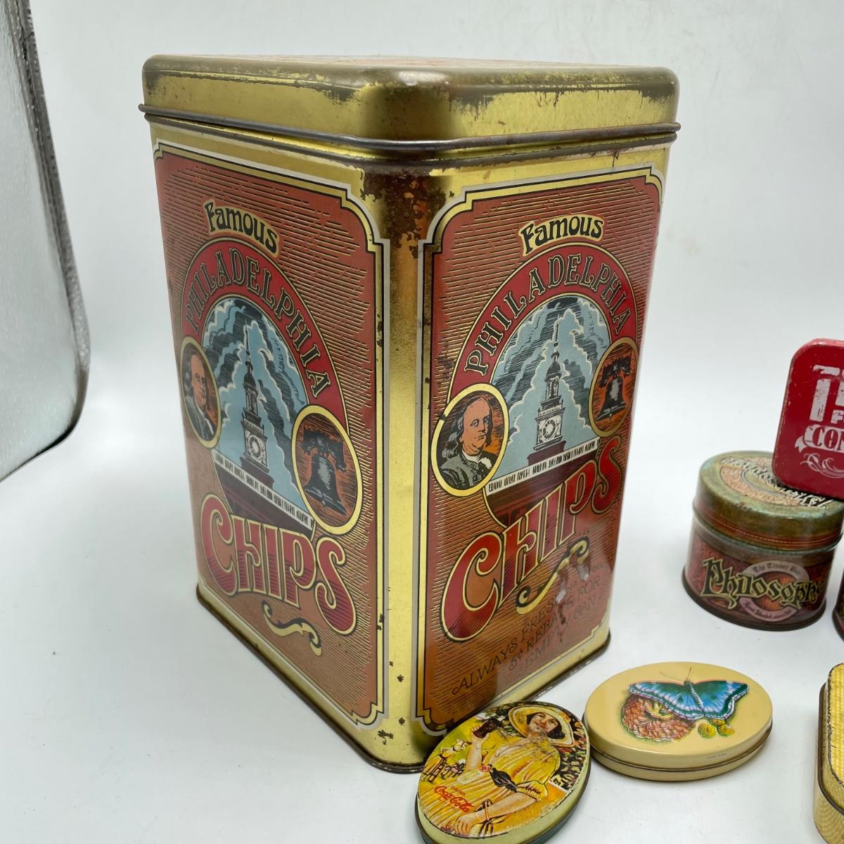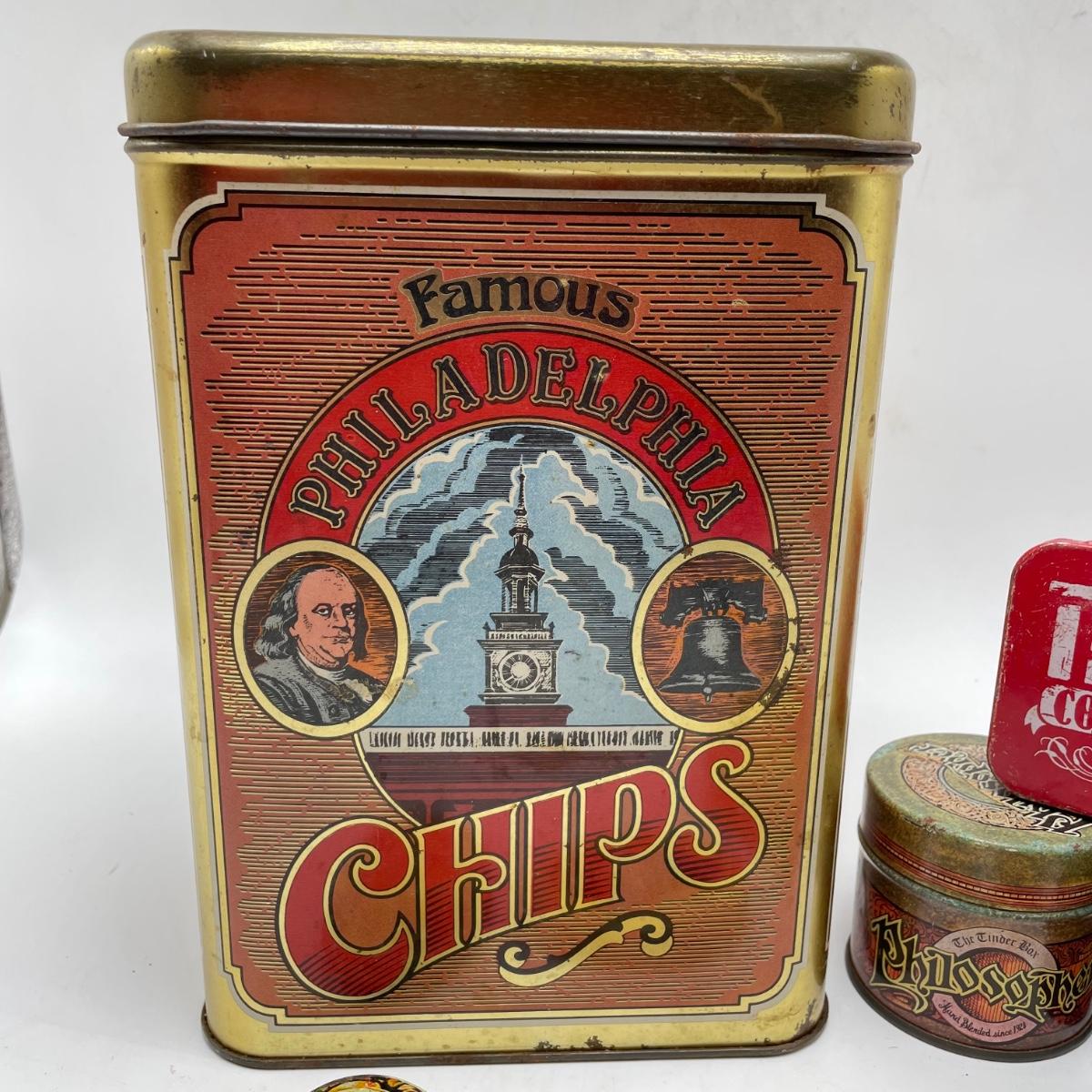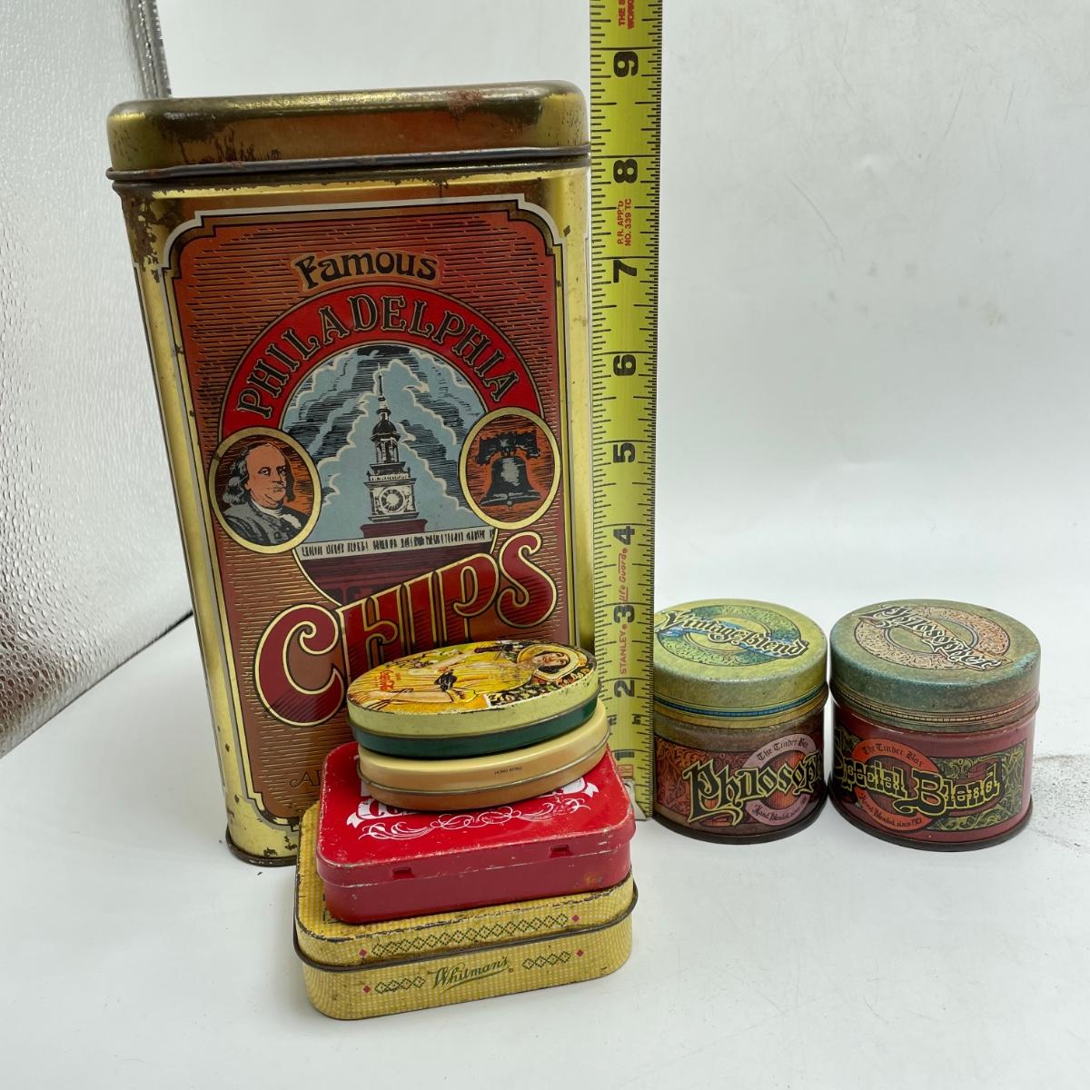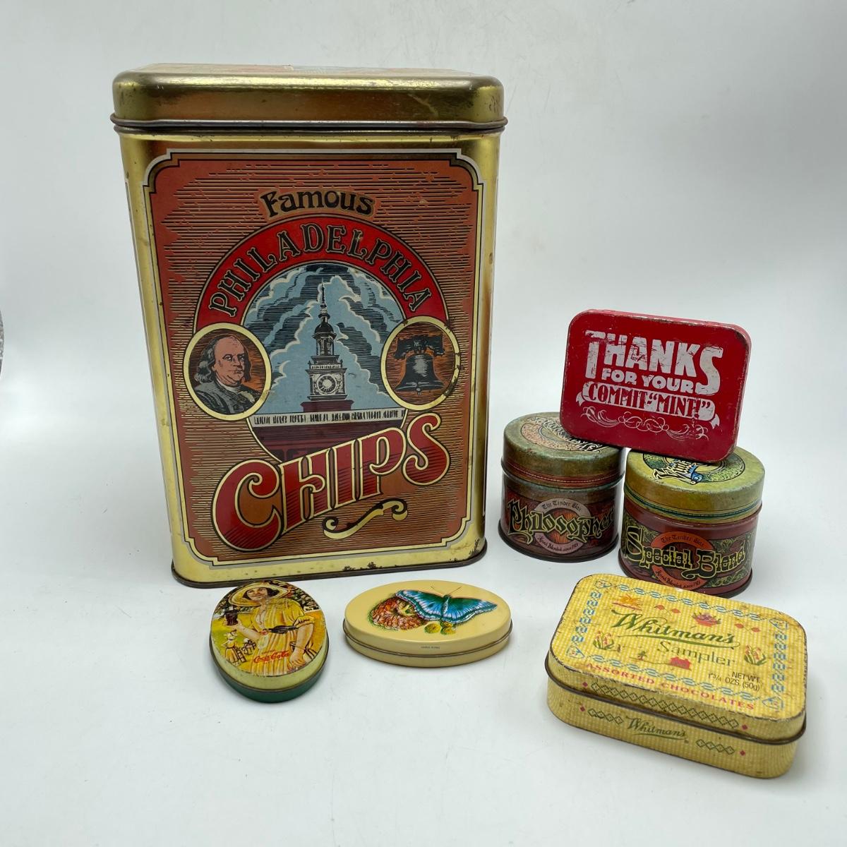 Seven advertisement tins, some newer, some vintage. The Philadelphia Chips tin held a 20 year 1966-1986 metal calendar that’s just over 2” wide. See images. Shipping available.