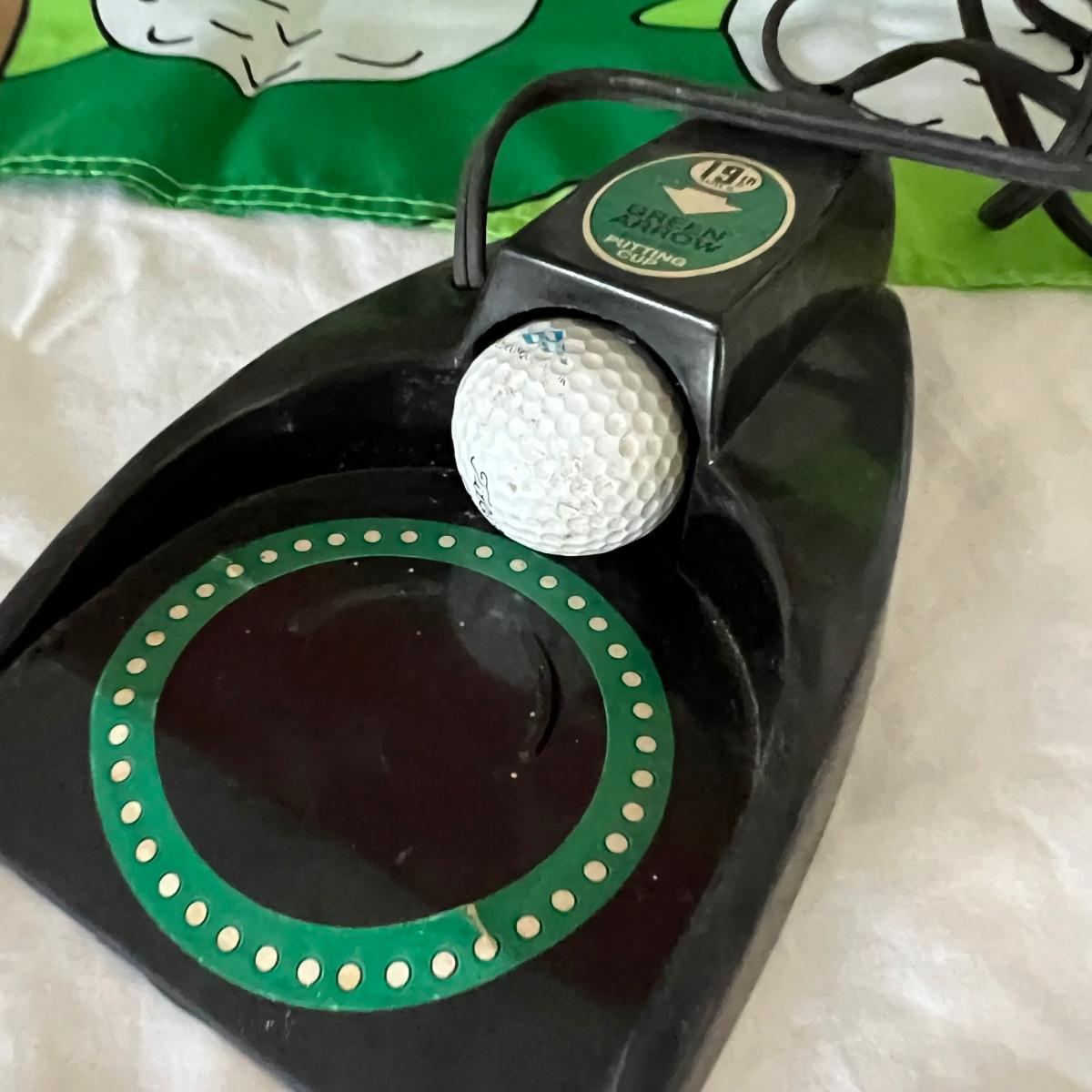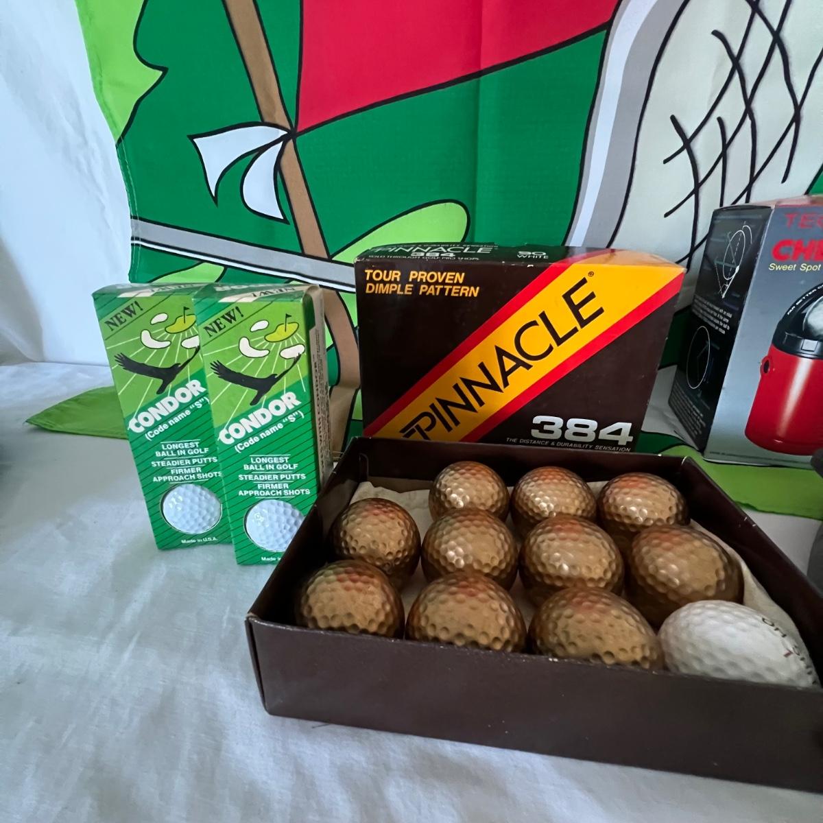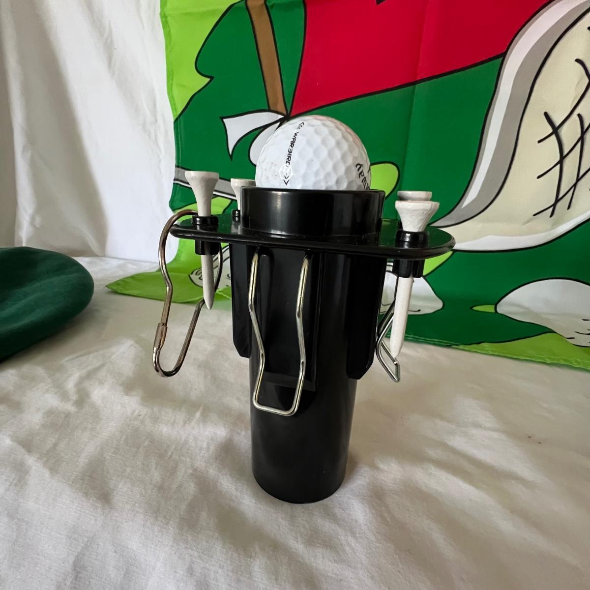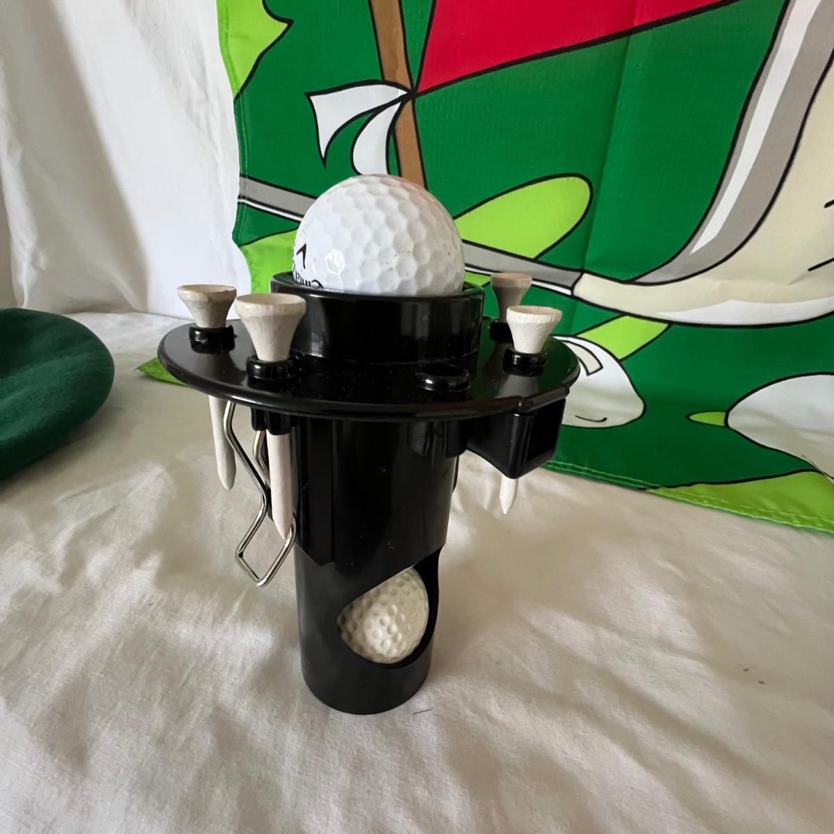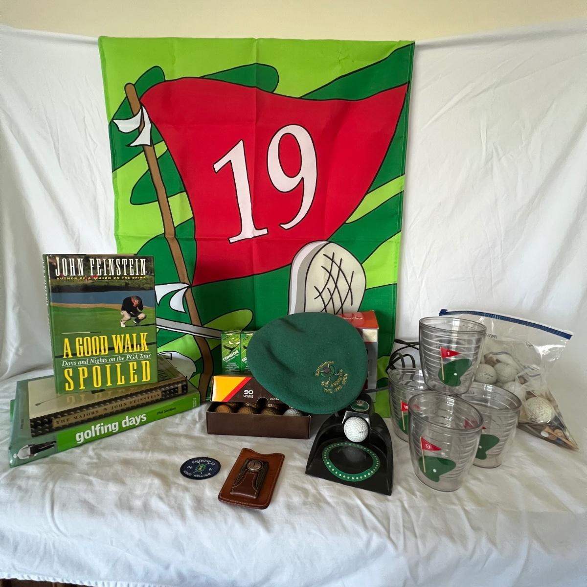 A mix of vintage and newer golf accessories. Includes a green wool Kangol cap (note it is dirty), four Tervis tumblers, a 19th hole flag, books, bag of tees and balls and more. The putting cup was not tested.