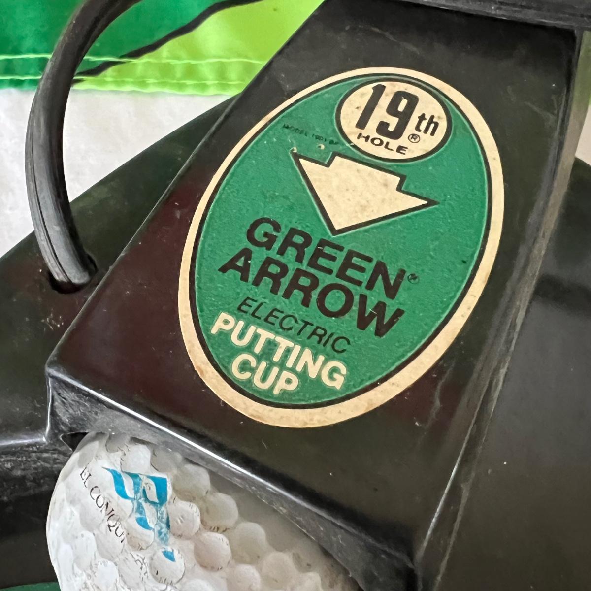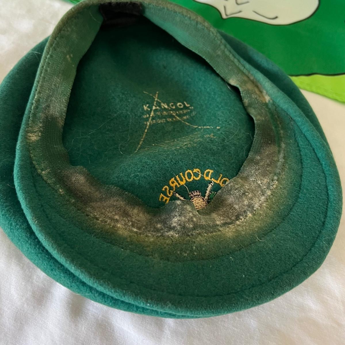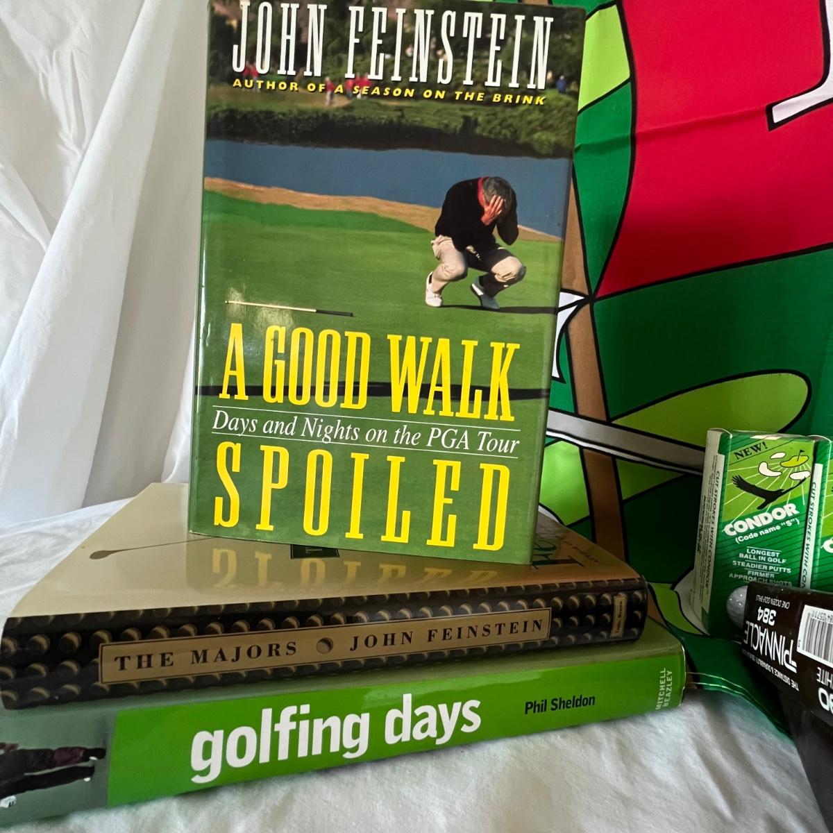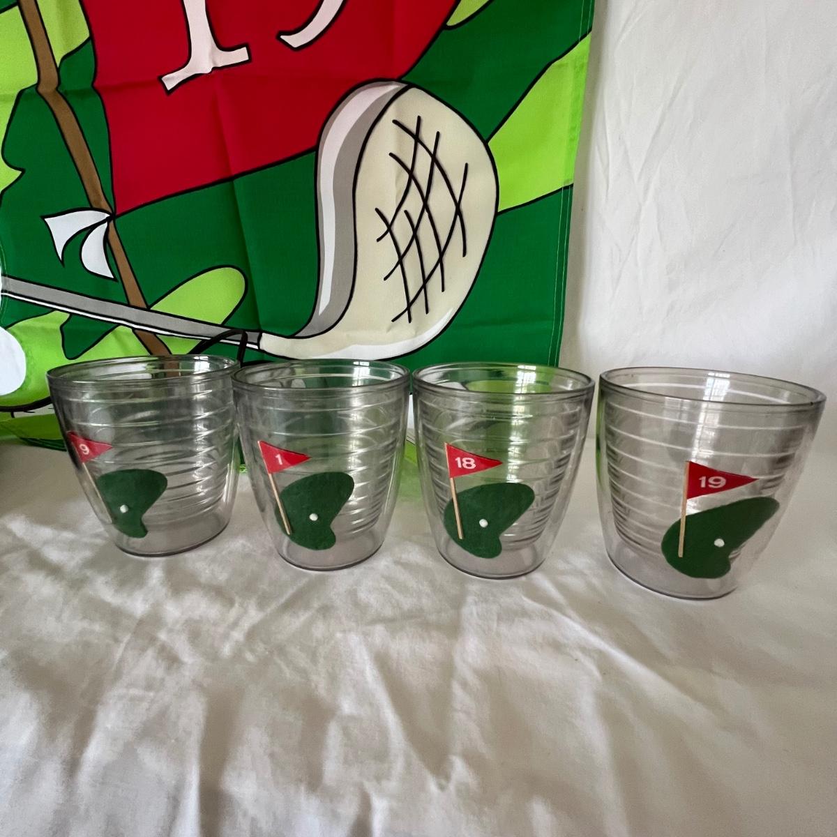 A mix of vintage and newer golf accessories. Includes a green wool Kangol cap (note it is dirty), four Tervis tumblers, a 19th hole flag, books, bag of tees and balls and more. The putting cup was not tested.