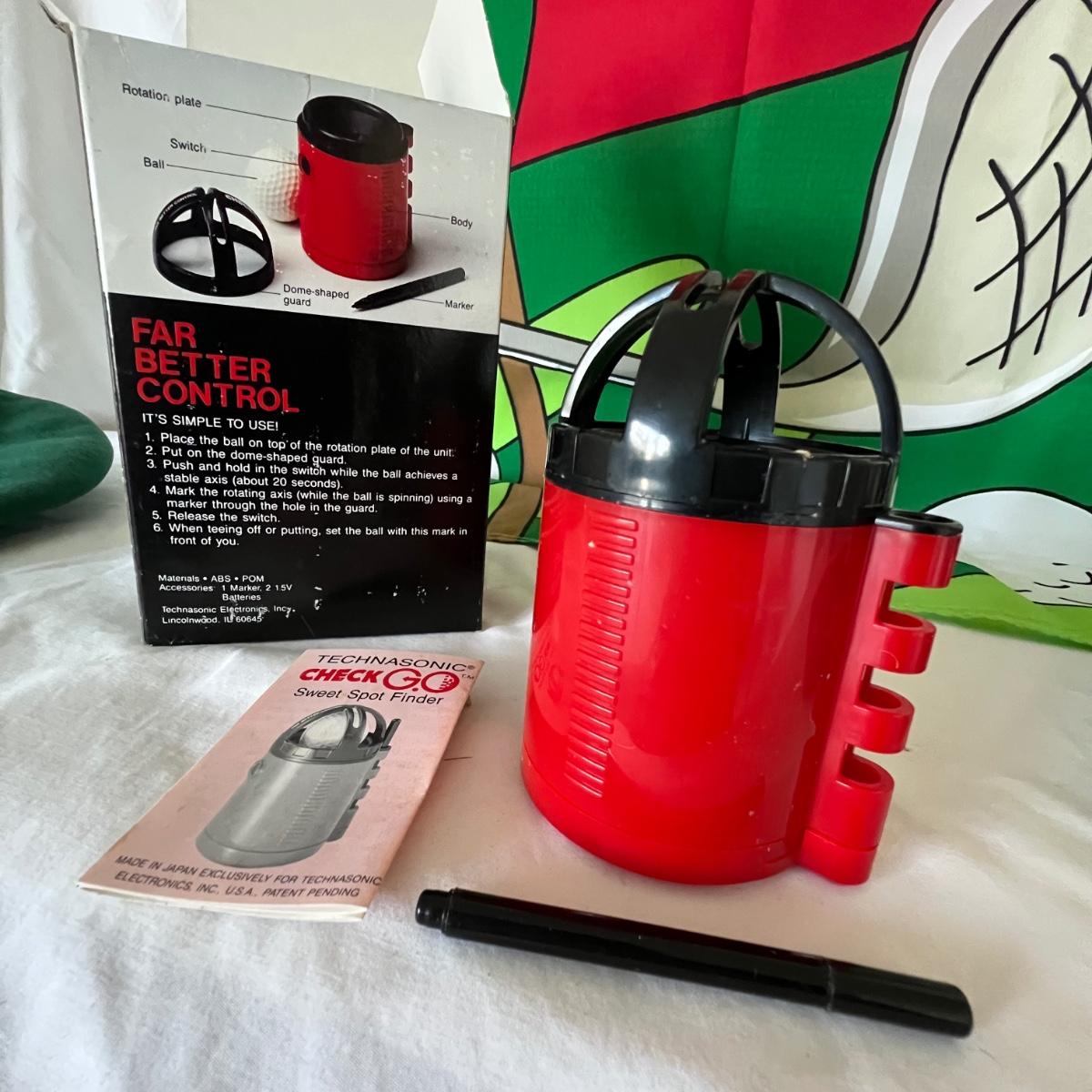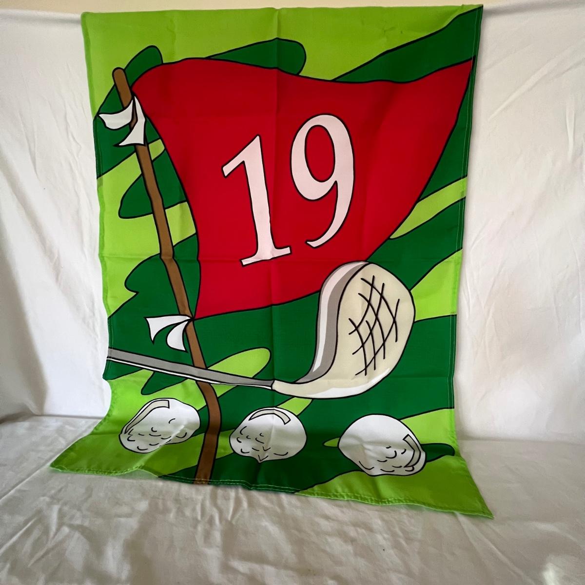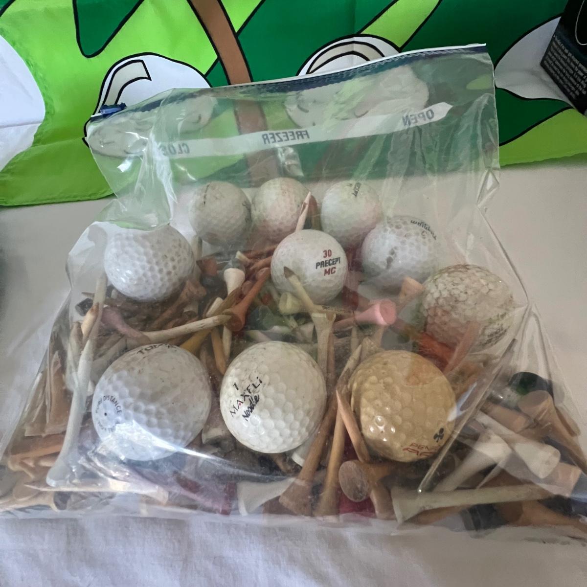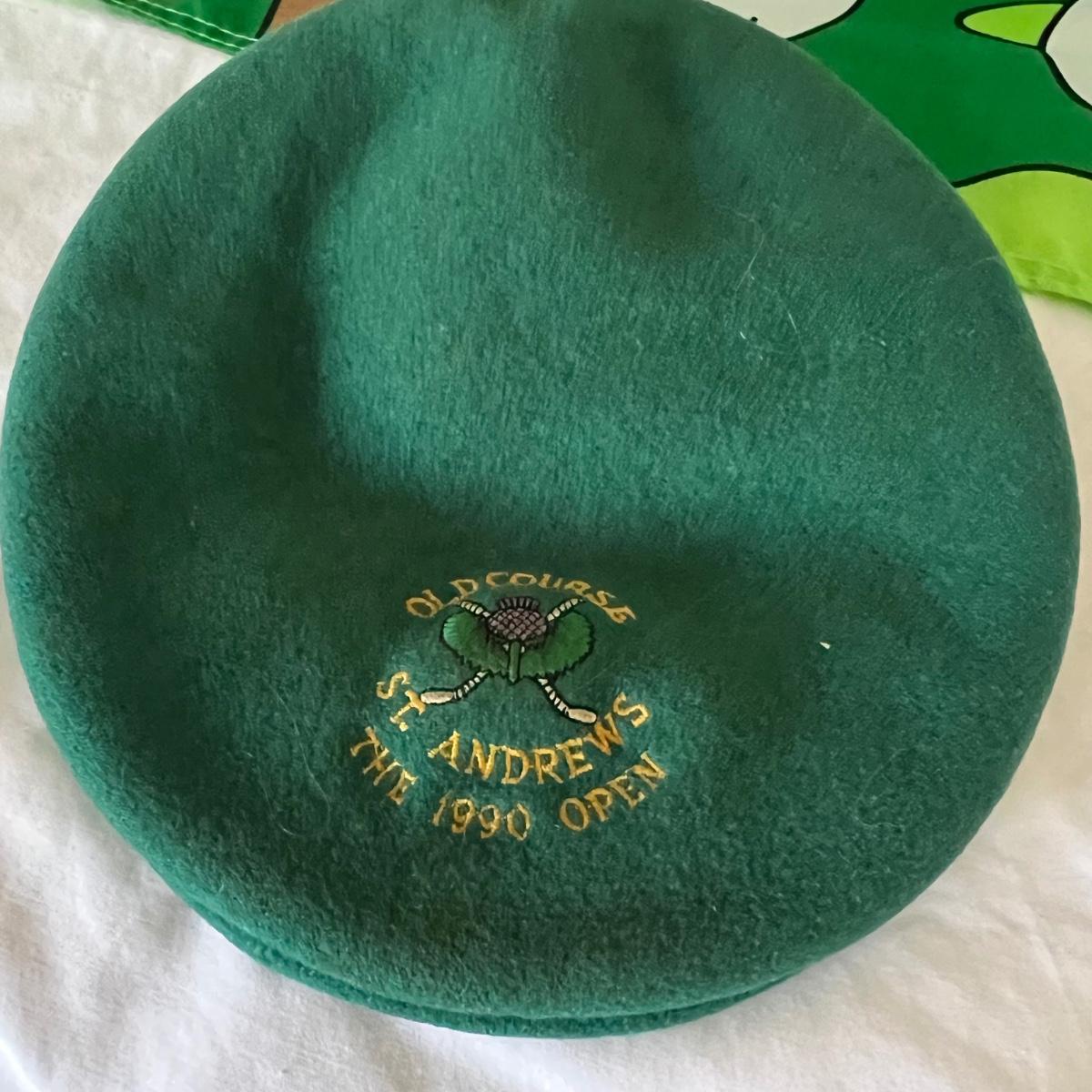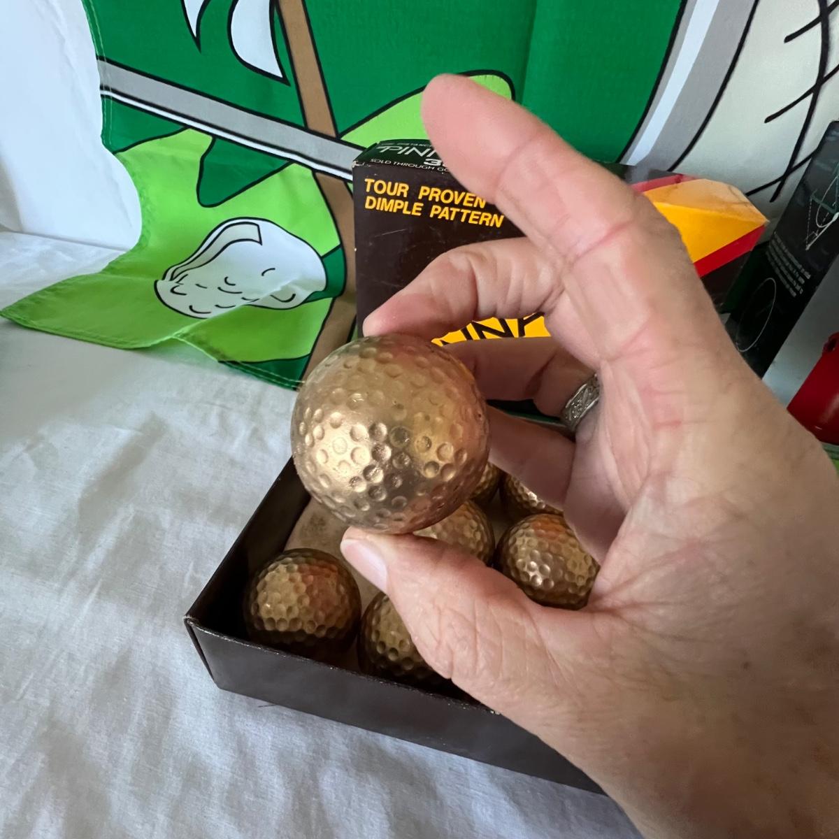 A mix of vintage and newer golf accessories. Includes a green wool Kangol cap (note it is dirty), four Tervis tumblers, a 19th hole flag, books, bag of tees and balls and more. The putting cup was not tested.