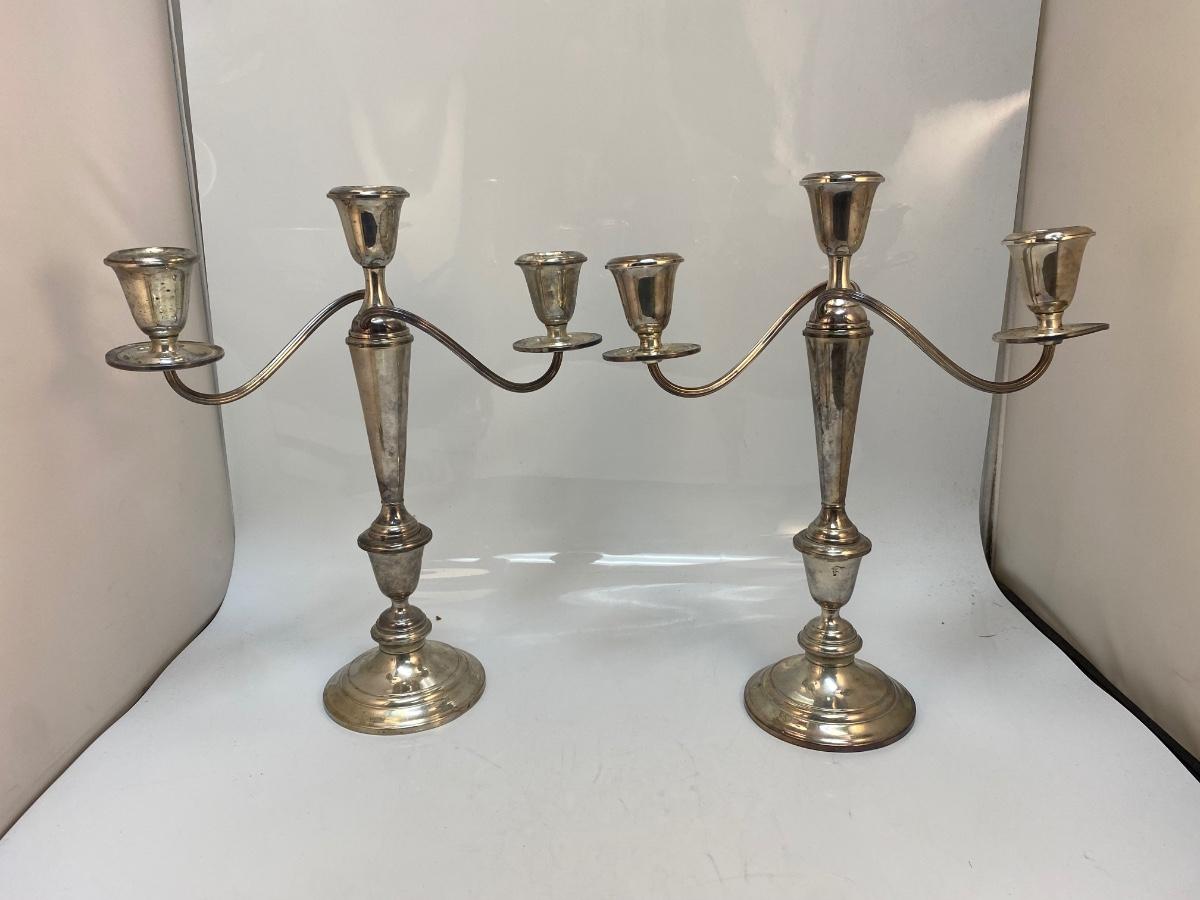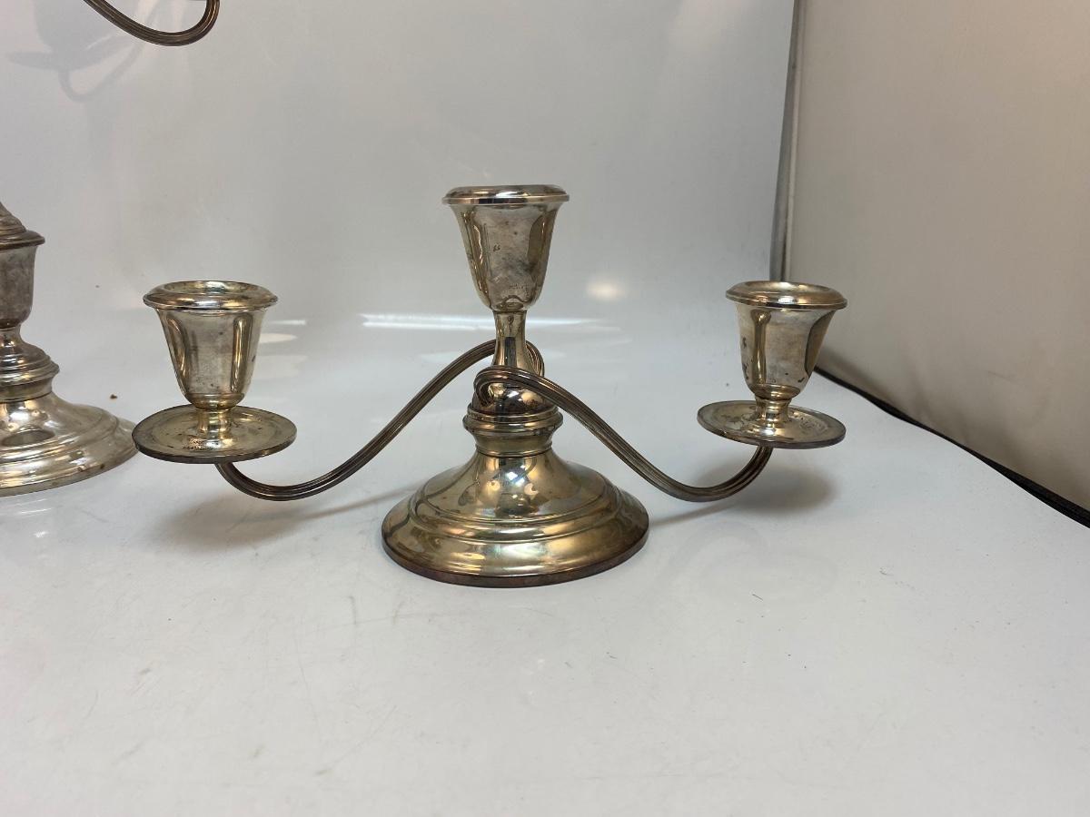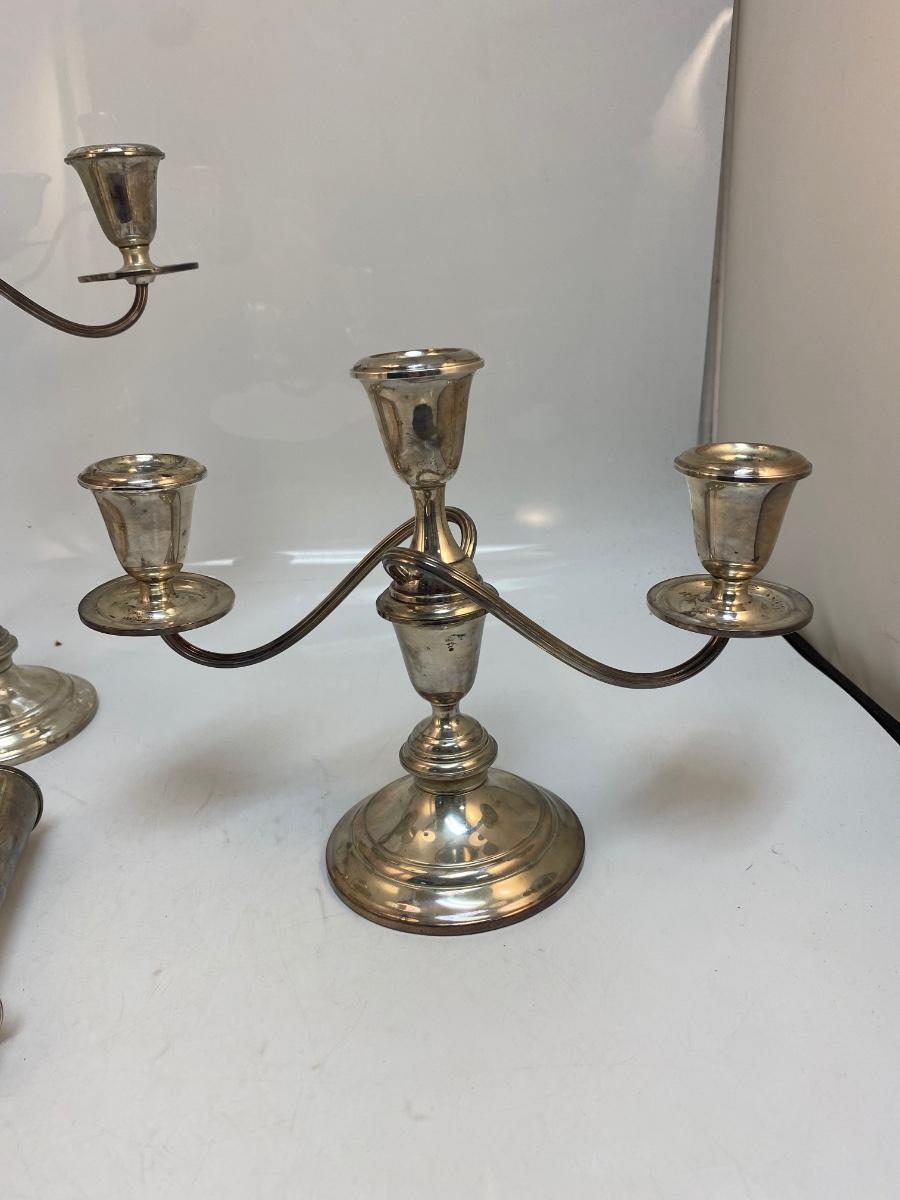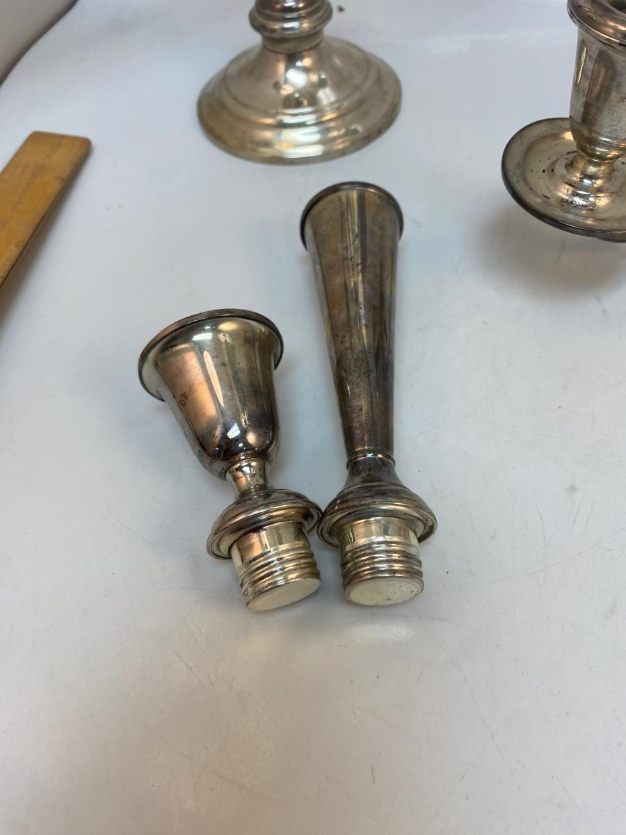 Vintage Newport Sterling Silver Weighted Candle Holder Candelabra Adjustable Design. Each candelabra is made of four separate pieces that can be unscrewed and rearranged to desired height a style. Weighted pieces. In good condition. See photos.