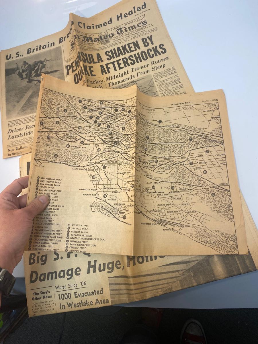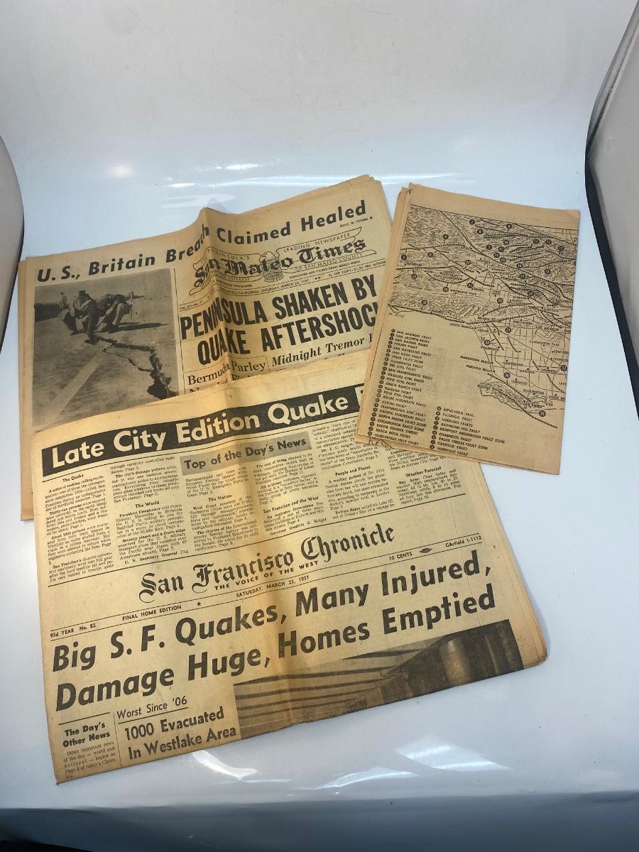 Vintage Newspaper Articles on San Francisco Earthquake March 1957. From the San Francisco Chronicle, San Mateo Times, and a fault line map from the Los Angeles Times.