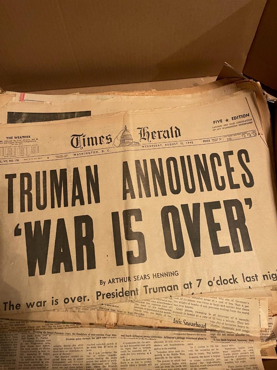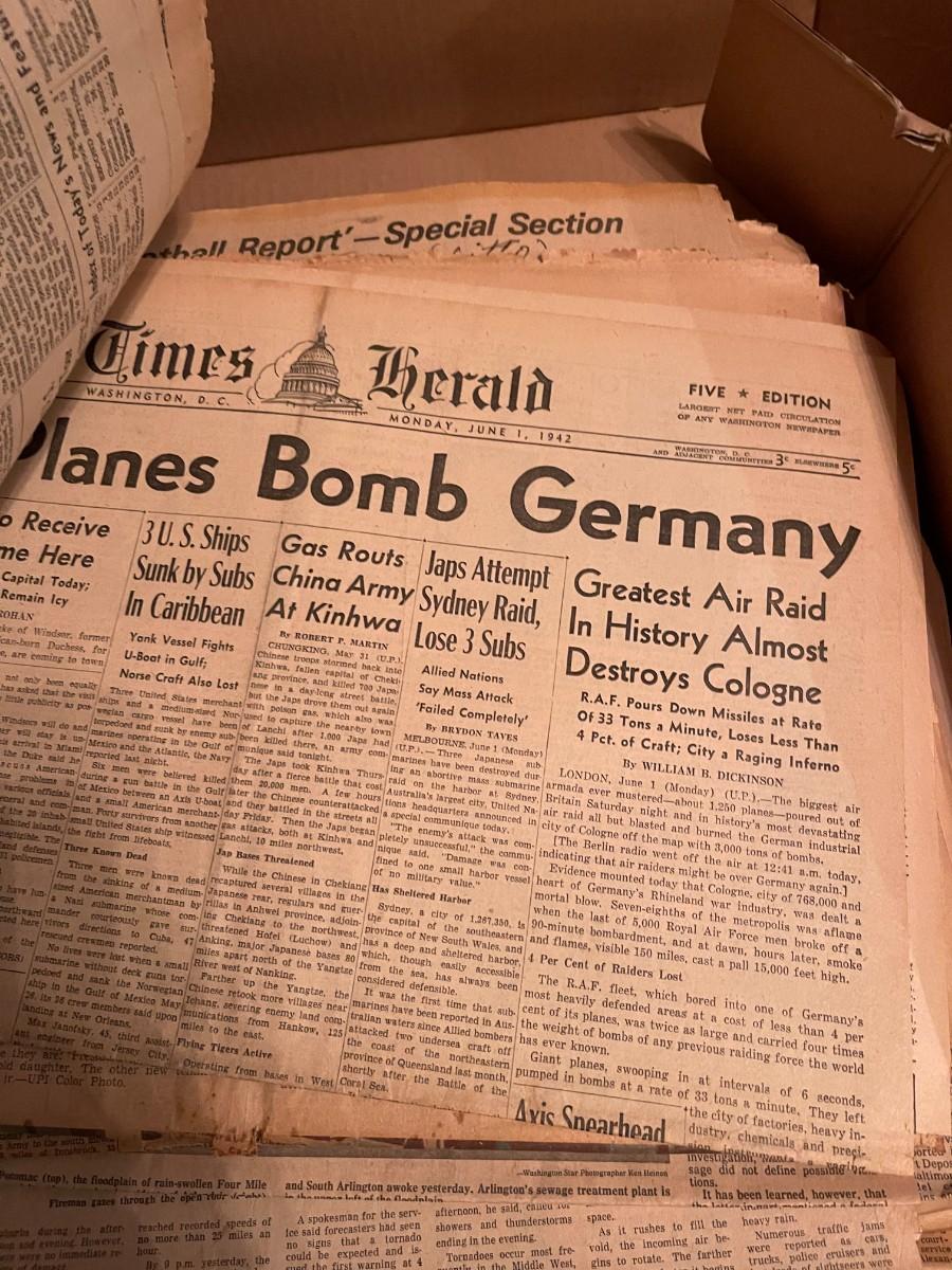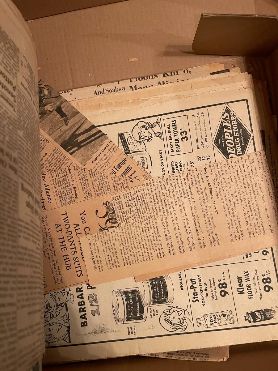Vintage box of old newspapers 1940s, 1960s, etc.