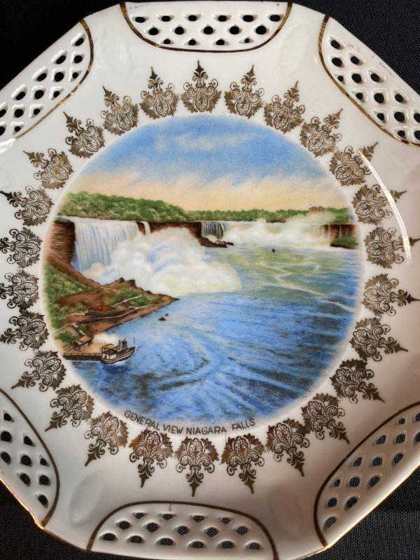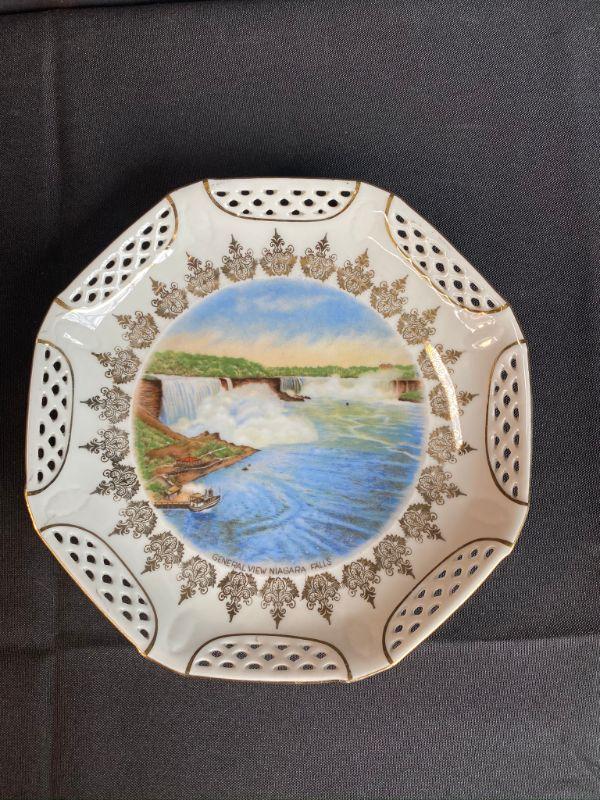 octagon shaped Niagara Falls Souvenir Plate. Lattice edge. Gold Accent. In good condition.