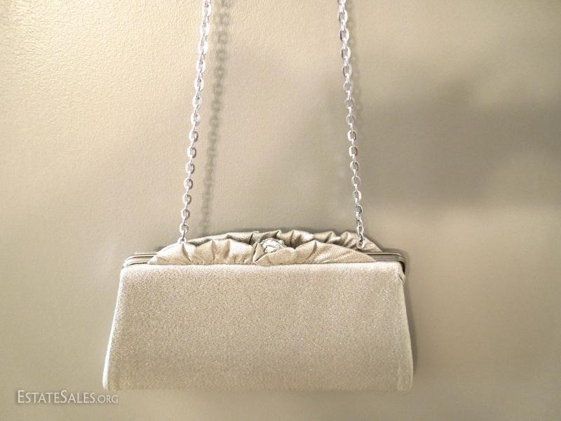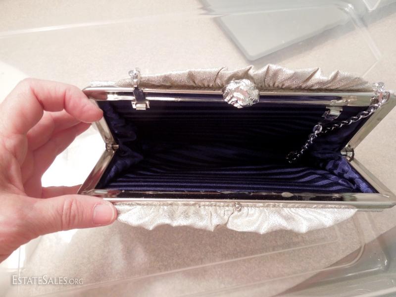 - 9 x5 metallic silver shoulder bag with deep blue lining.