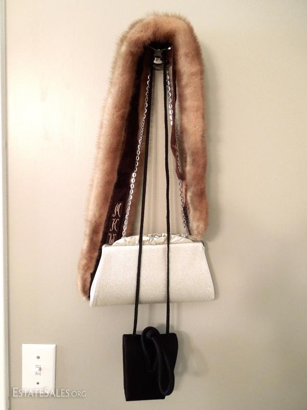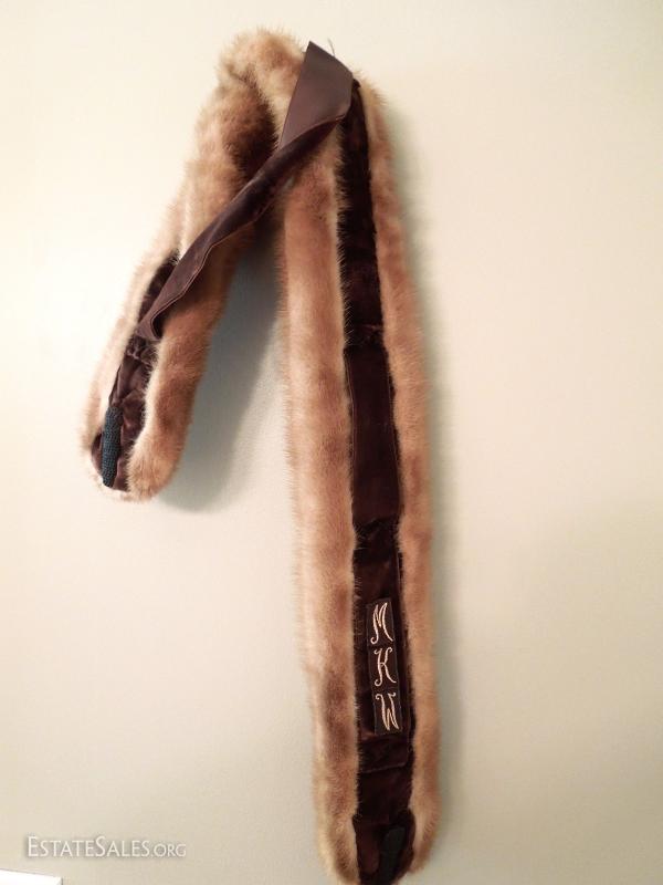 - 36 x 4 monogramed velvet lined mink stole with crochet clasp.