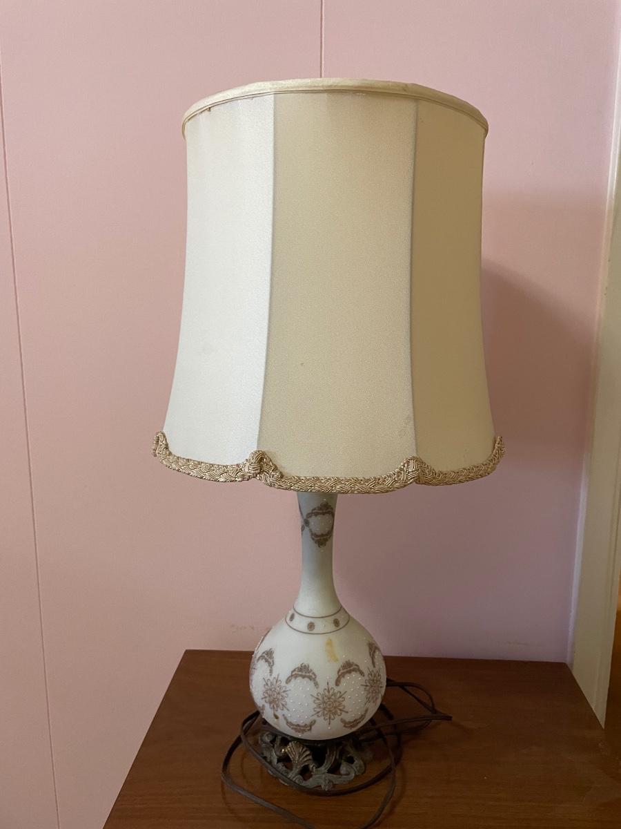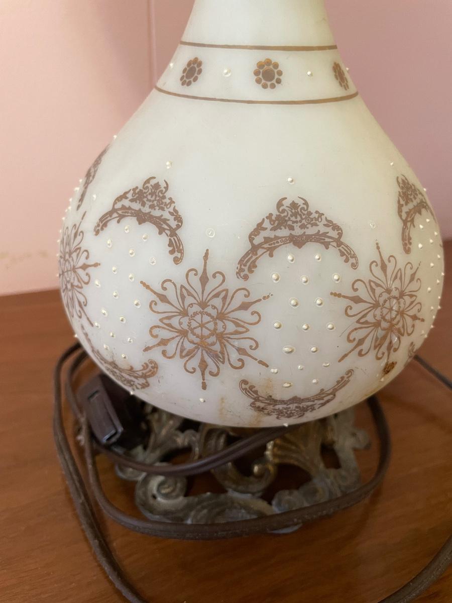Antique Blown Glass Lamp Opaque White with bronze & gold painted design (1 of 2 this style)
