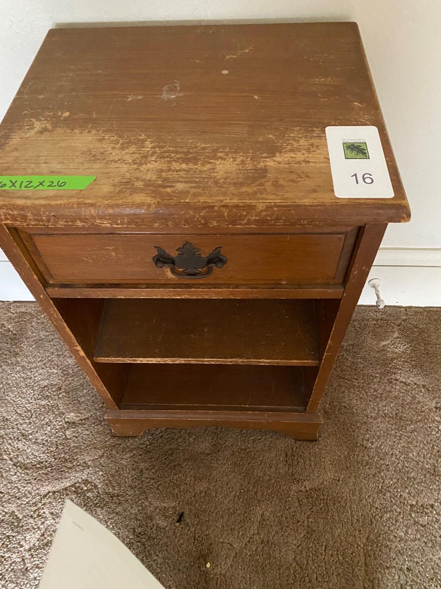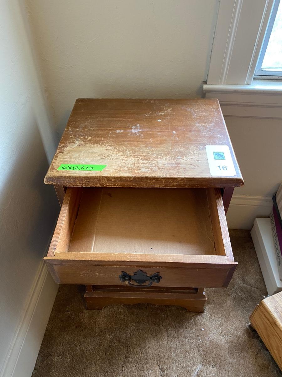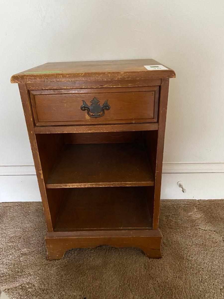 Top is damaged. Drawer bottom is missing and replaced with cardboard