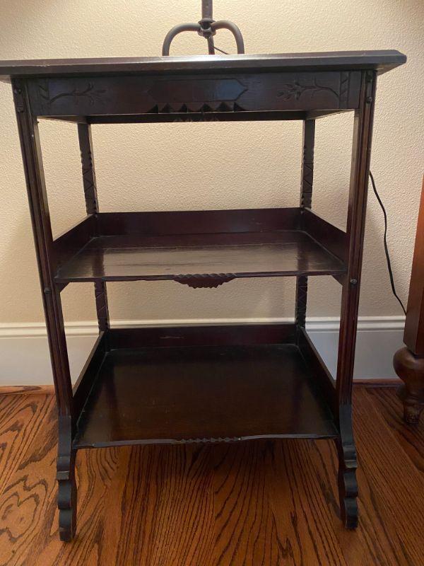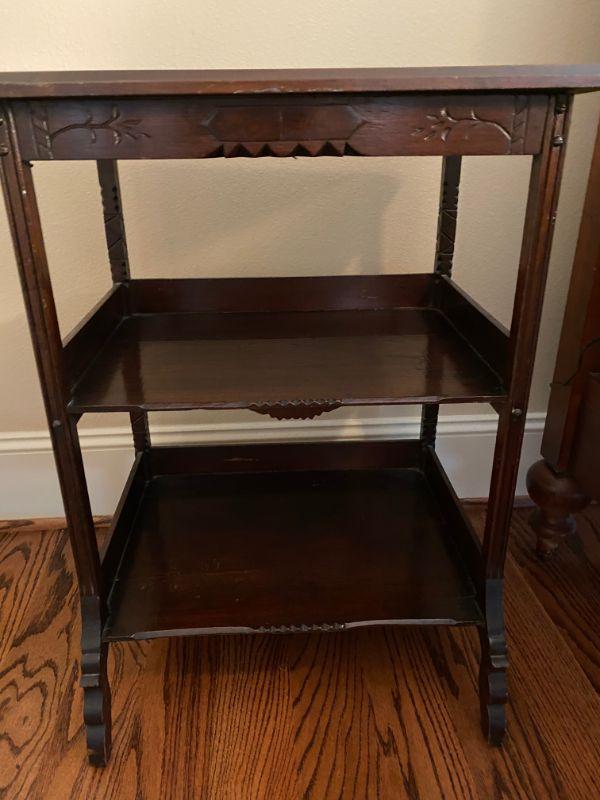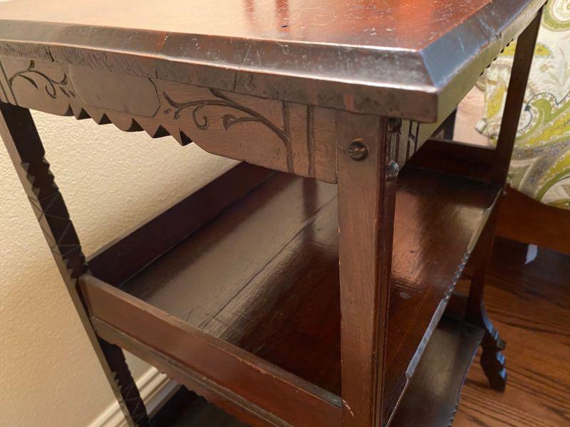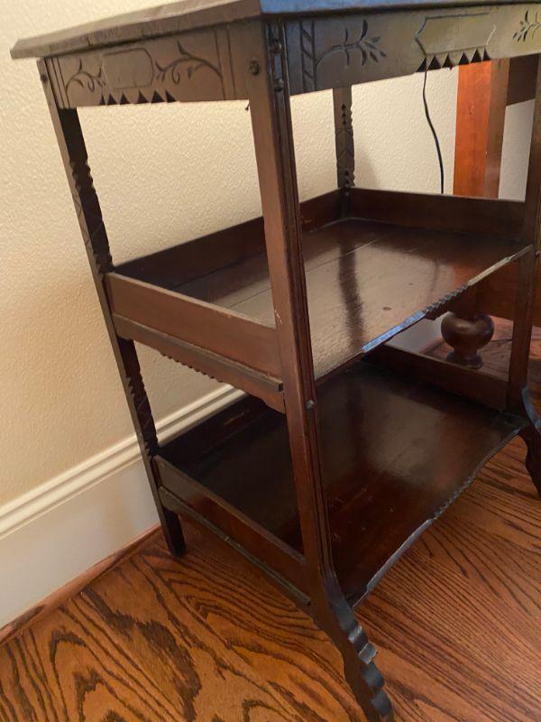 Lovely late 19th century carved side table; East Lake Features approximate the age at 1890s. Intricate details with two shelves all resting on turned legs.