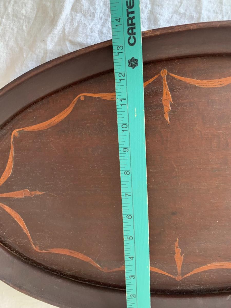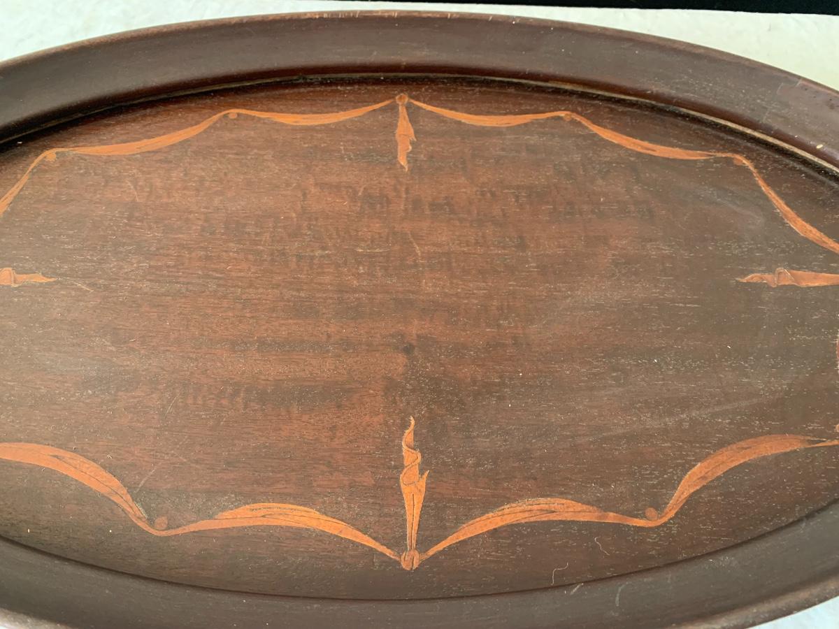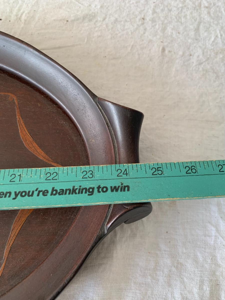 Lovely wood tray with inlaid design, scrolled handles. Minor wear on bottom of tray .13" x 24"