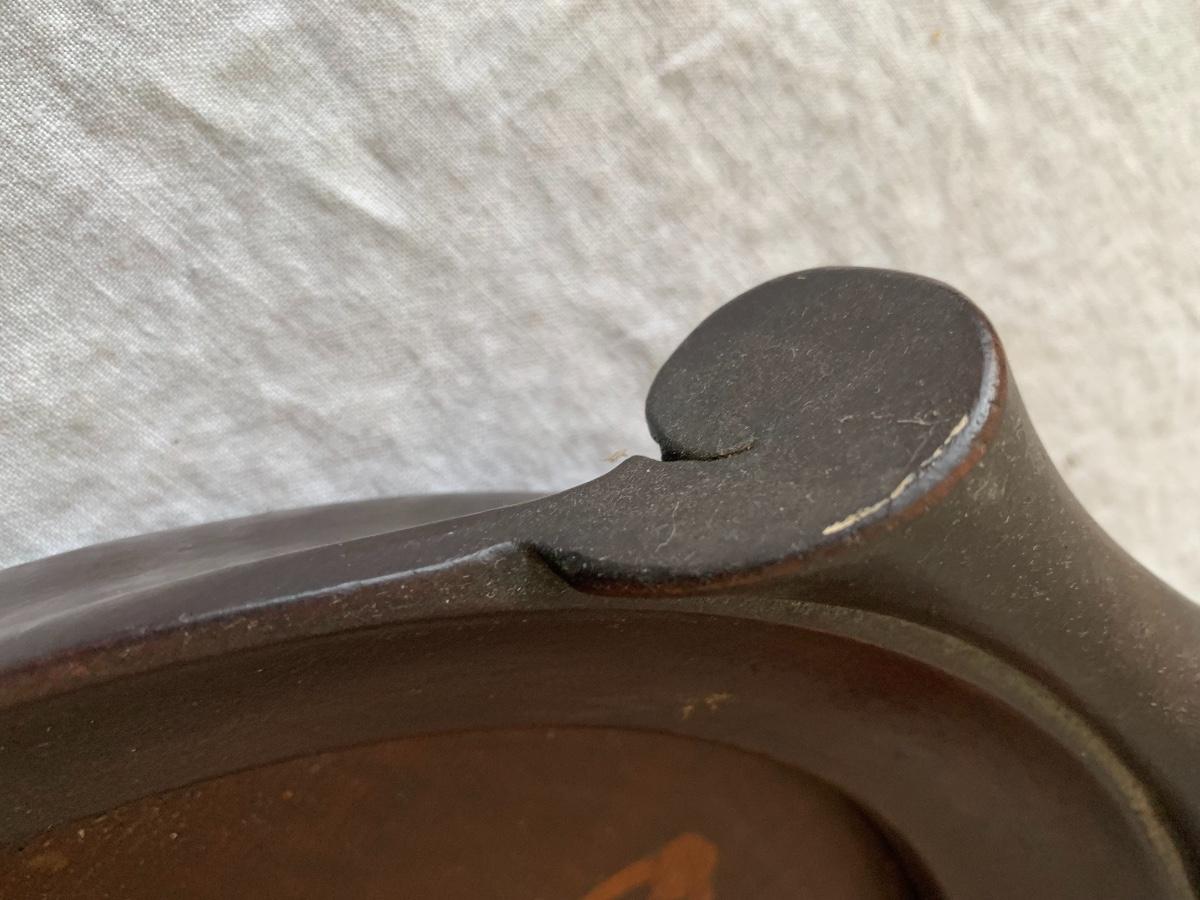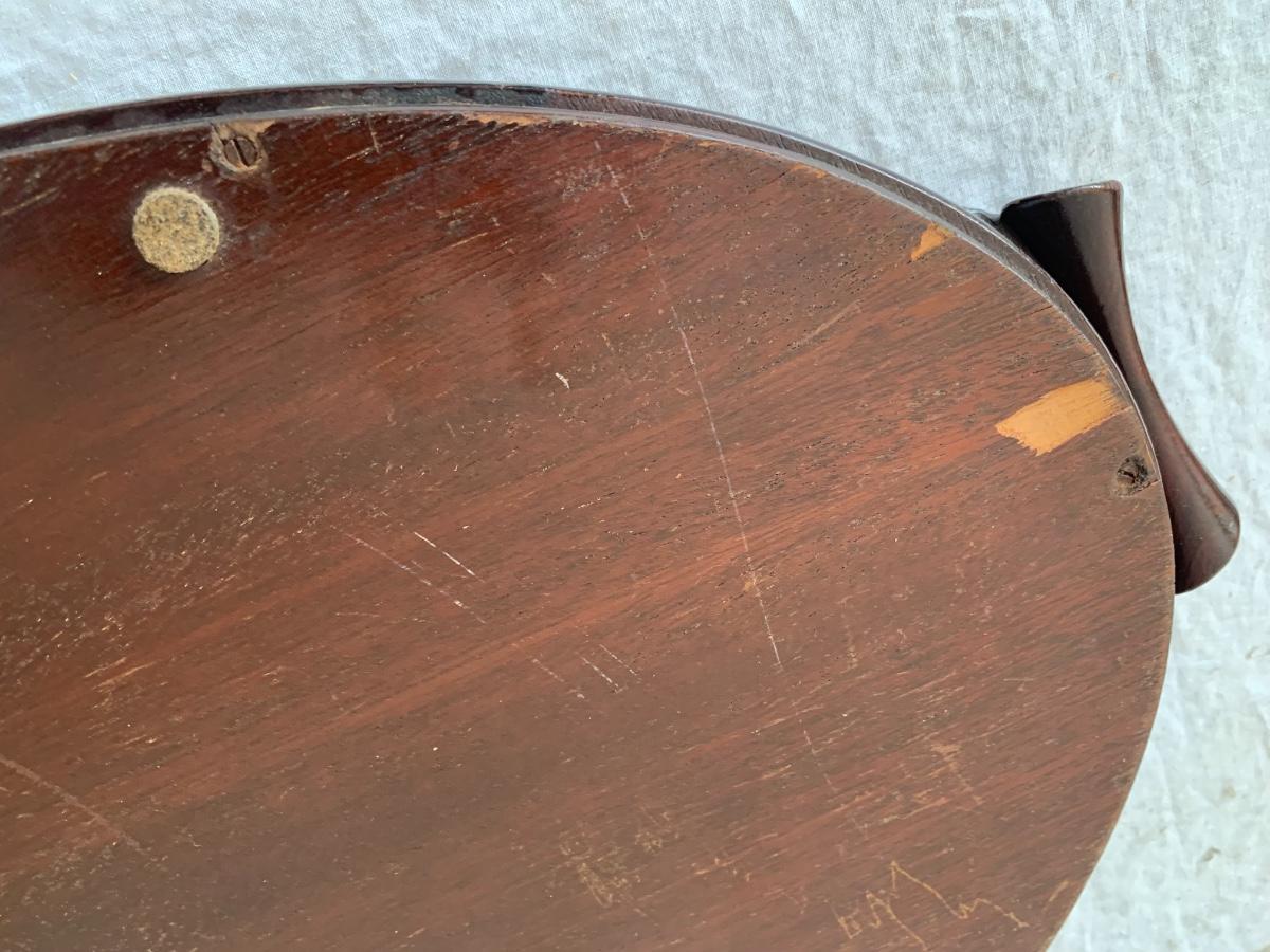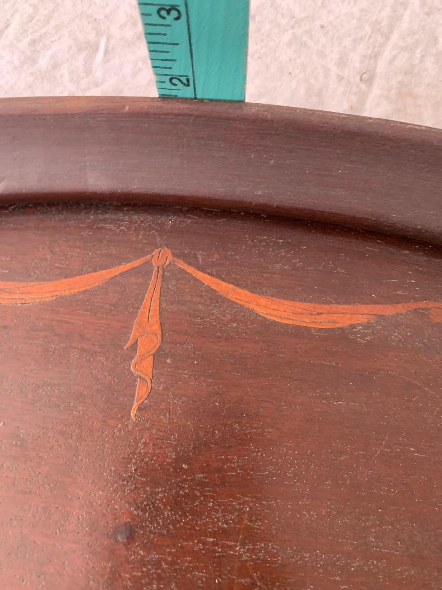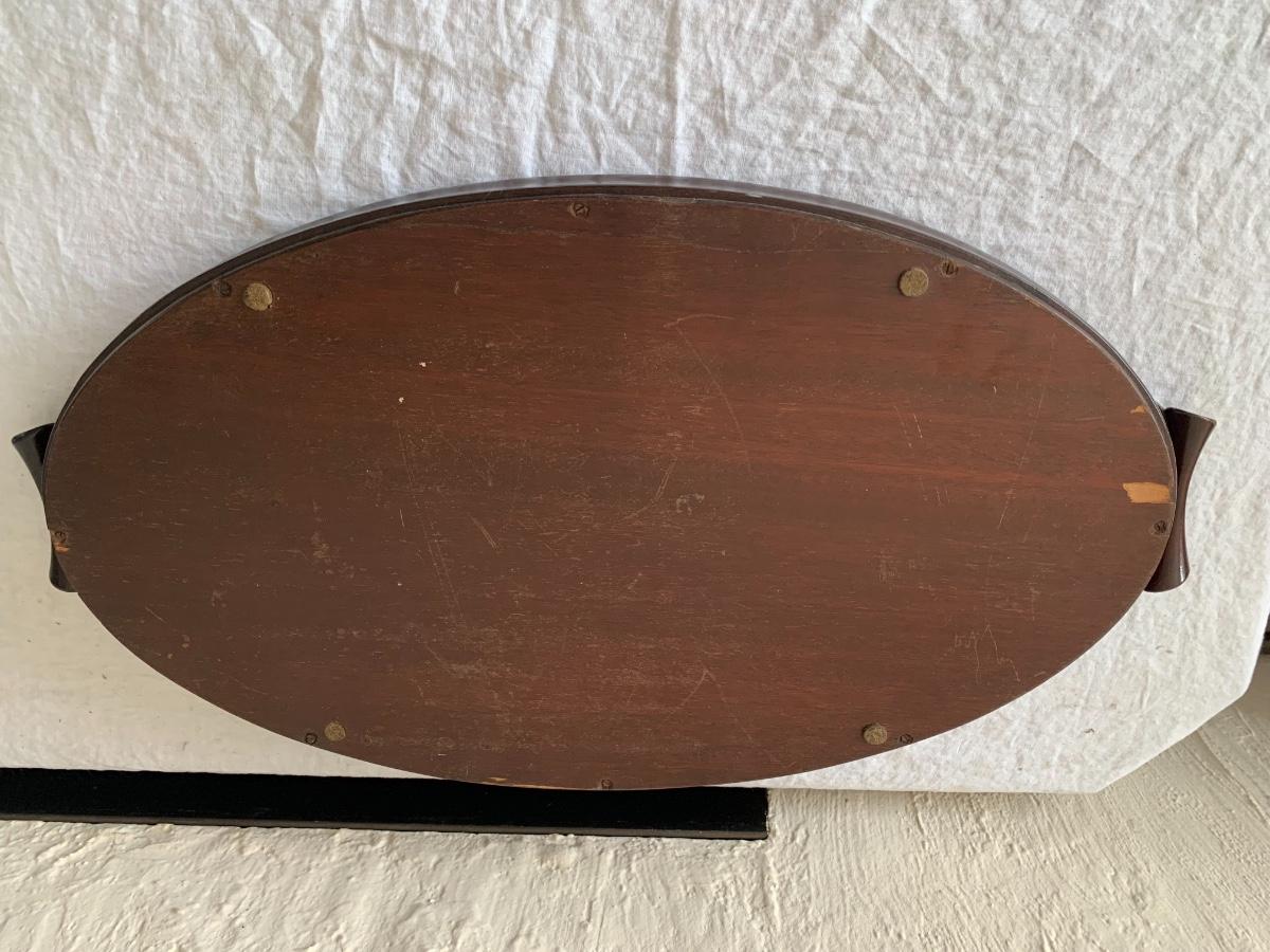 Lovely wood tray with inlaid design, scrolled handles. Minor wear on bottom of tray .13" x 24"
