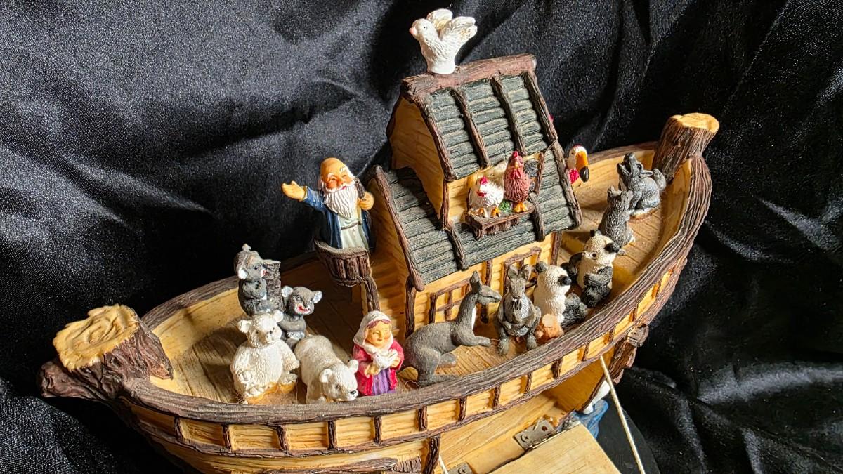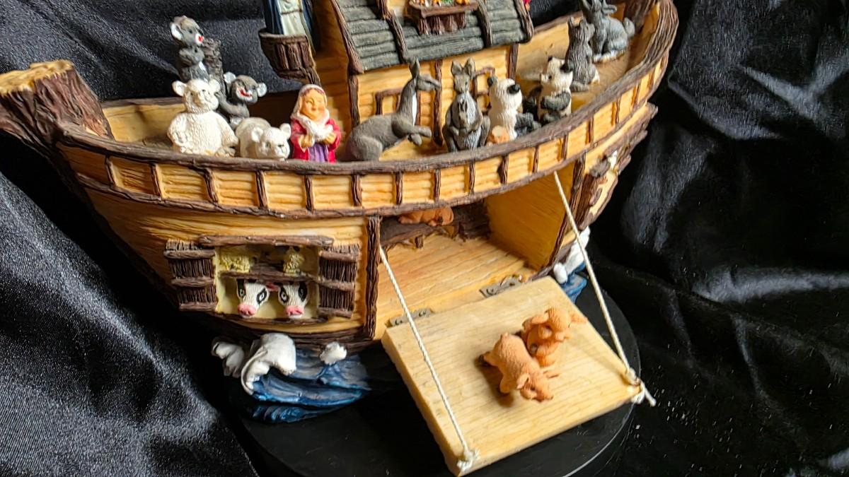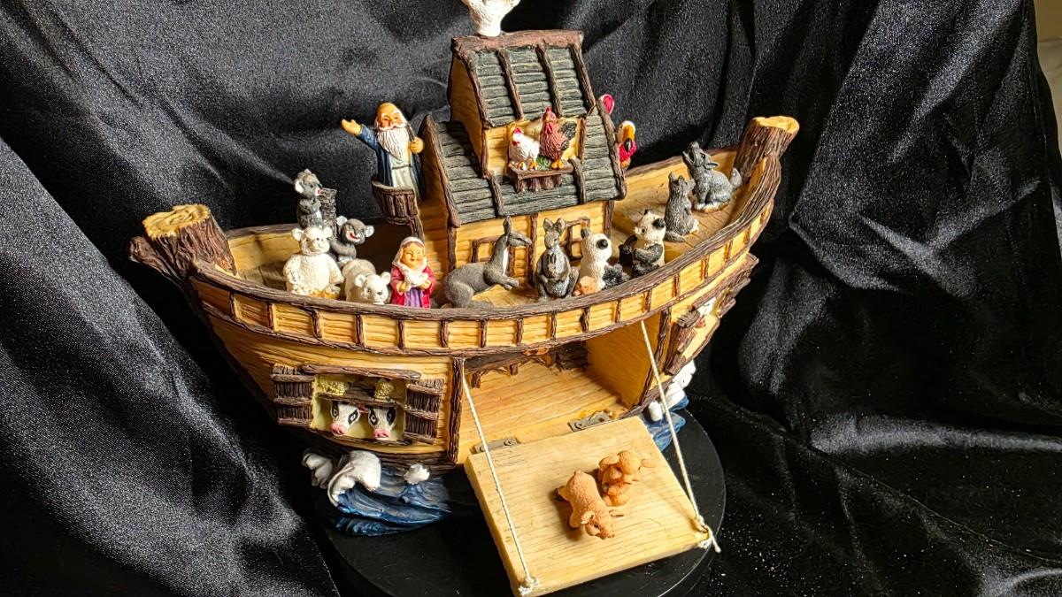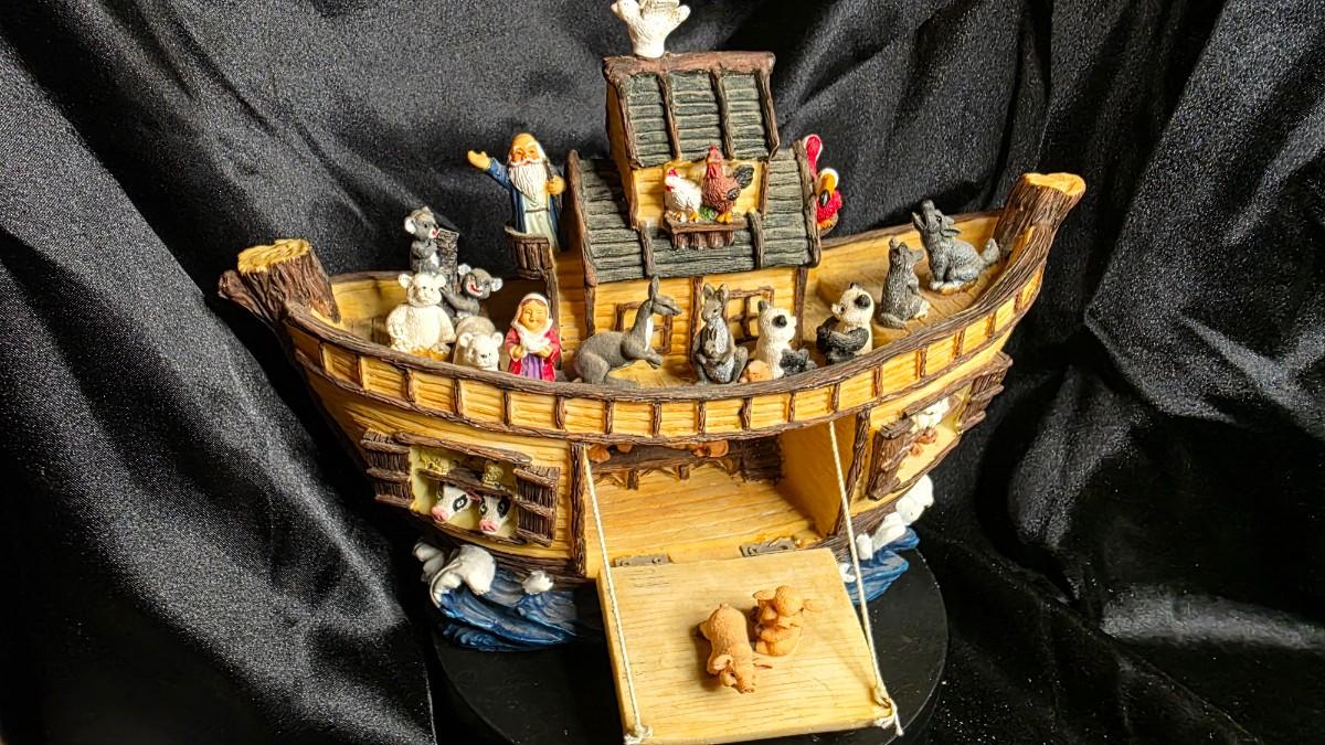 The ramp extends like a bridge to salvation, the boat's deck alive with tiny details of crates and sails, crafted in resin with hand-painted warmth that captures the biblical epic in miniature scale.