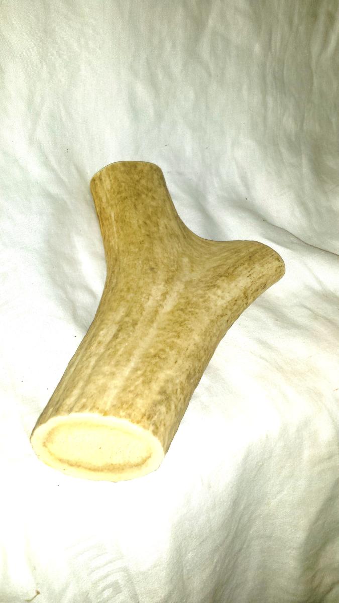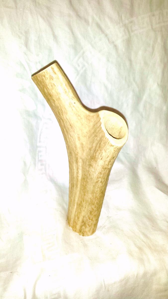 This natural, blond-color elk antler vase is both sculptural and simple. A fabulous, textural element for a modern Nordic decor style. This is a double vase. Measures 10" high and 6" wide.