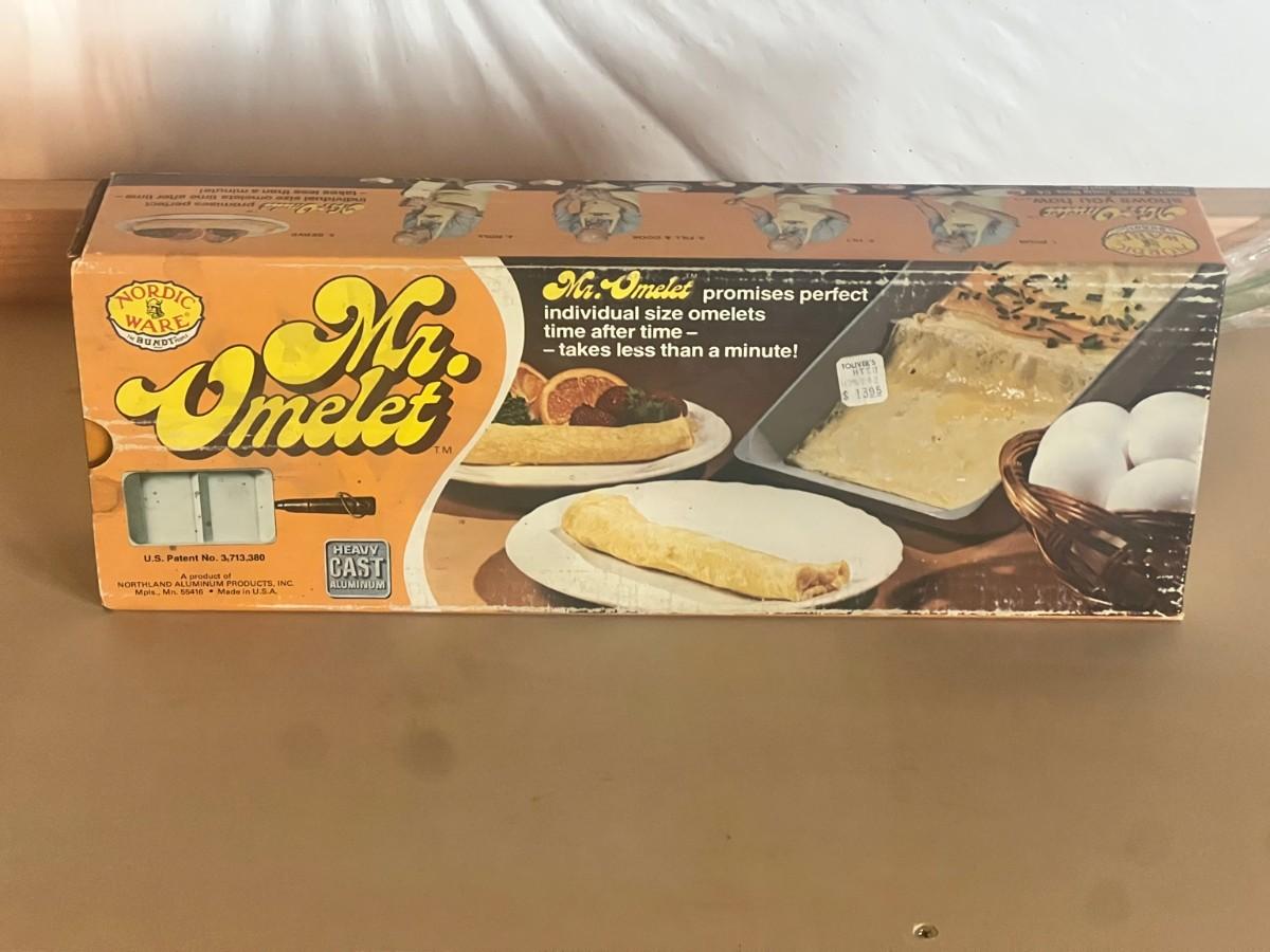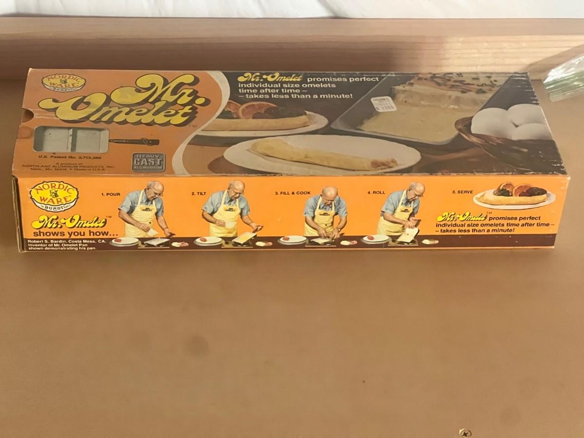 Retro Nordic Ware “Mr. Omelet” cast aluminum omelet pan with original box and insert. Made in Minneapolis, Minnesota by Northland Aluminum Products (Nordic Ware), this clever mid-century kitchen gadget was designed to make perfect rolled omelets “in under a minute.”