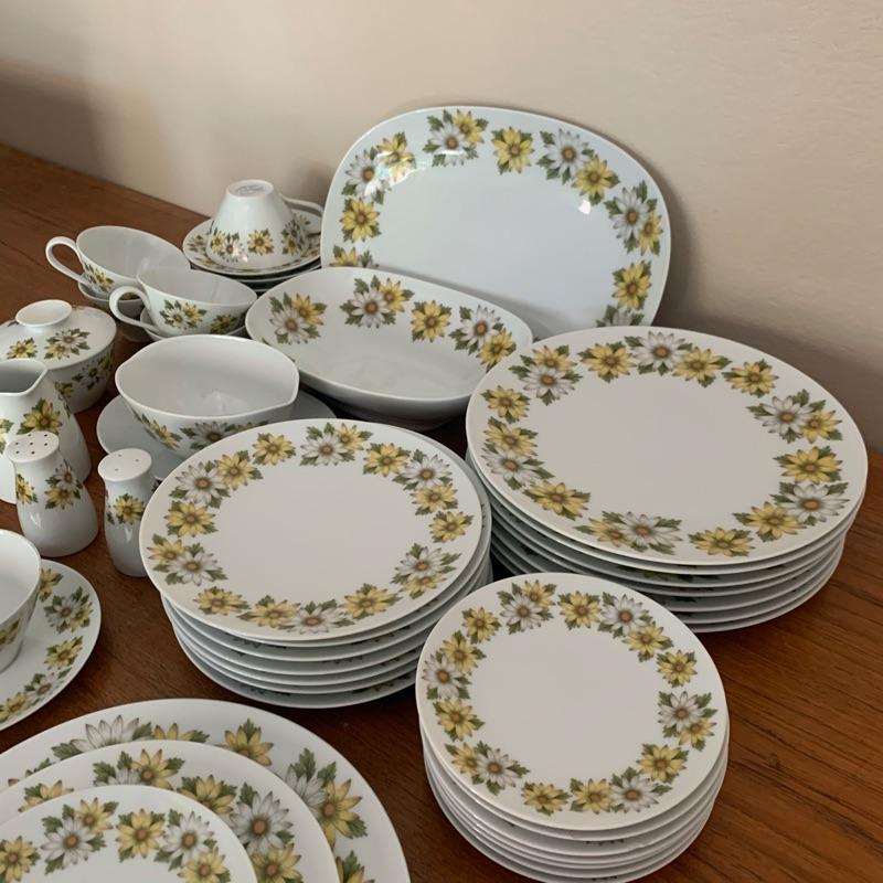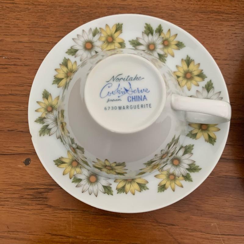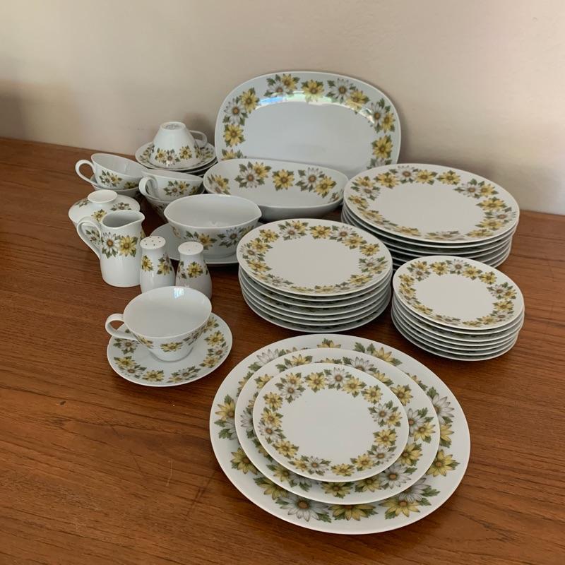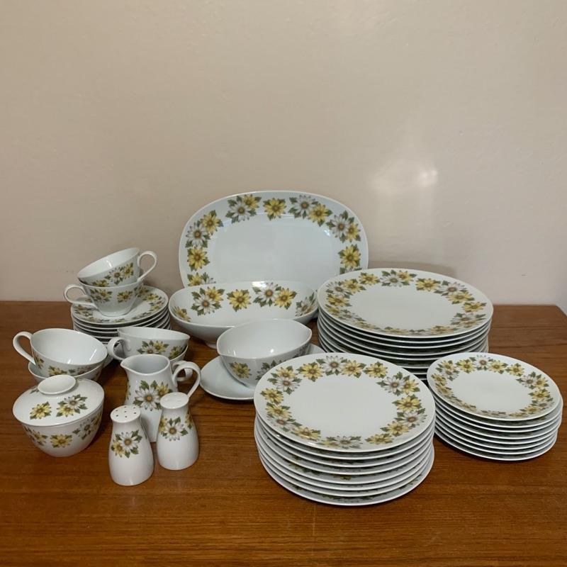 Gorgeous 45 pc Cookin’ Serve dinnerware set by Noritake China. The oh-so charming Marguerite (6730) pattern was produced between 1966 to 1977 and features yellow daisies on white background. Includes 8 dinner plates, 8 bread /salad plates, 8 dessert plates, 6 cups, 8 cup saucers, salt and pepper set, covered sugar bowl, open creamer, oval serving bowl and oval serving platter. All are in excellent condition with no cracks, chips, nicks or utensil marks noted.