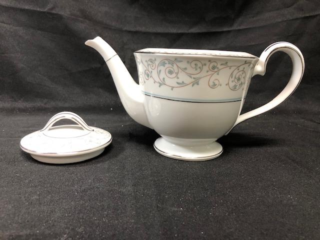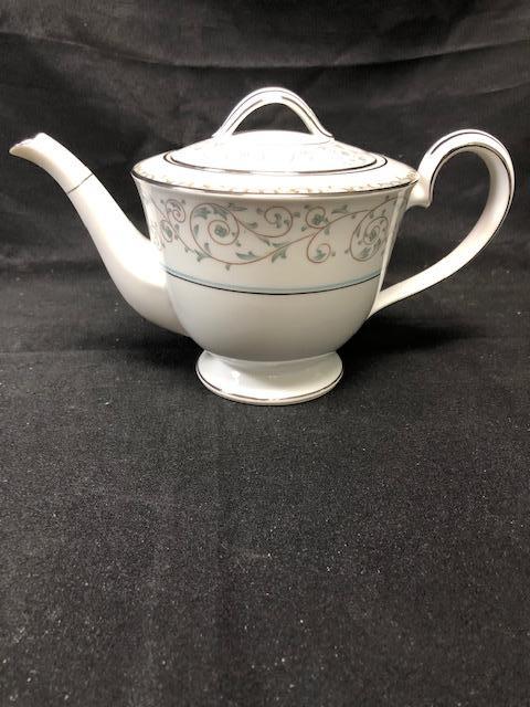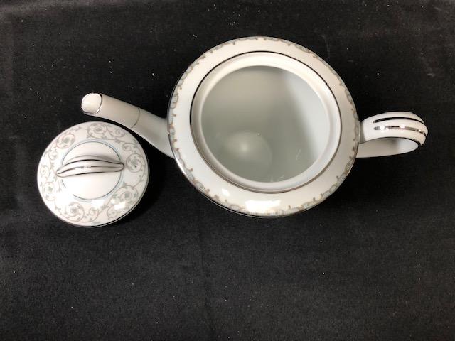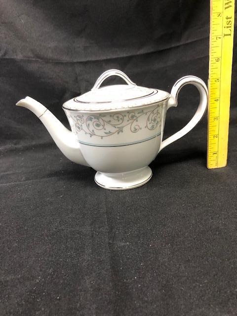 Vintage Noritake china "Oxford" tea pot. White with blue & silver pattern. Good previously owned condition.