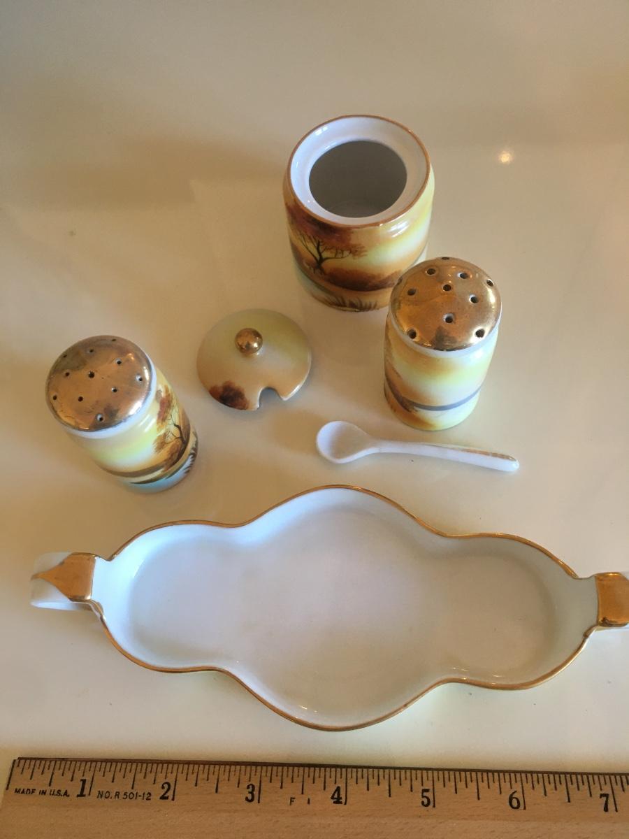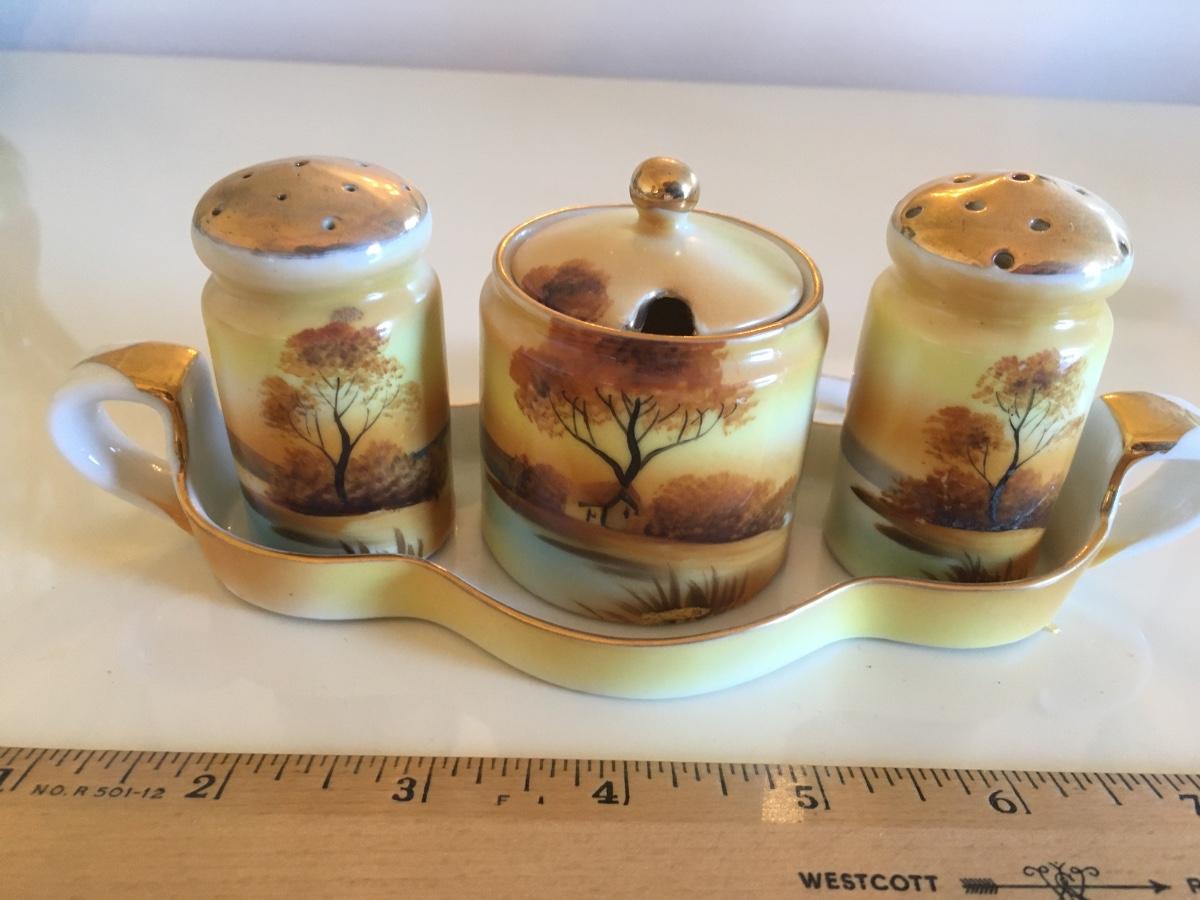 Set of salt and pepper with mustard jar with spoon set on tray. Made in Japan, handpainted.