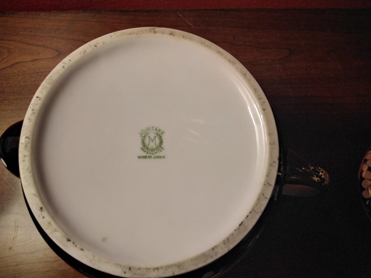 Vintage Noritake M Mark Tea Pot, Black with Cherry Blossoms and Gold Leaf Japan Vintage Noritake tea pot is Black with Cherry blossoms and elegant lightly raised gold-tone design on the handle and lid. Measures approx. 6" tall (top of lid handle to bottom of base) x 8-1/2" long x 9-3/4" wide from the handle to the spout. Marked on bottom, "Noritake" followed by an "M" surrounded by a leaf wreath, and "Hand Painted, Made in Japan". This is a elegant piece of vintage china and is museum quality with no gold worn off it appears to have never been used. No chips or cracks, or repairs of any kind. Tier 3.
