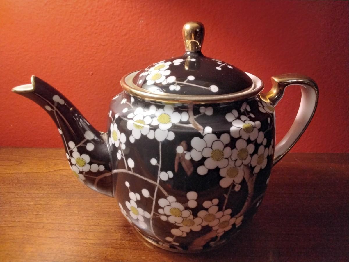 VINTAGE NORITAKE M MARK TEA POT, BLACK WITH CHERRY BLOSSOMS AND GOLD LEAF JAPAN
