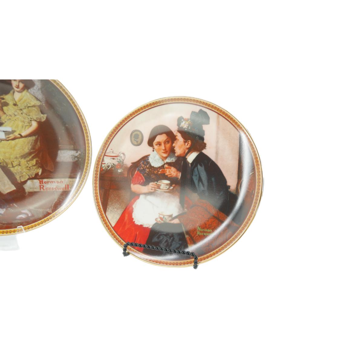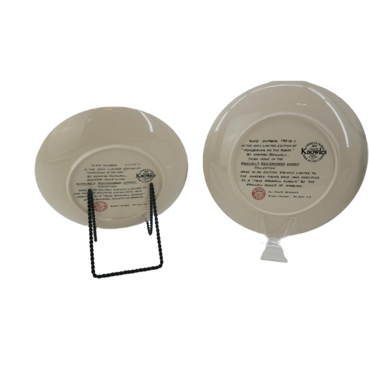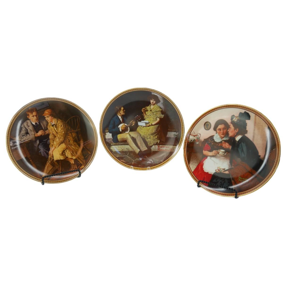 Three vintage Norman Rockwell collectors plates. Limited edition 1983 "Confiding in the Den" Rockwell's Rediscovered Women Collection #8784L. Limited edition "Pondering on the Porch" Rockwell's Rediscovered Women Collection #13528T. Limited edition 1983 "Gossiping in the Alcove" Rockwell's Rediscovered Women Collection #15866L. All in excellent condition. Stands not included. Each measures approximately 8.5" in diameter. Lot weighs 2 lb 8 oz. (C103)